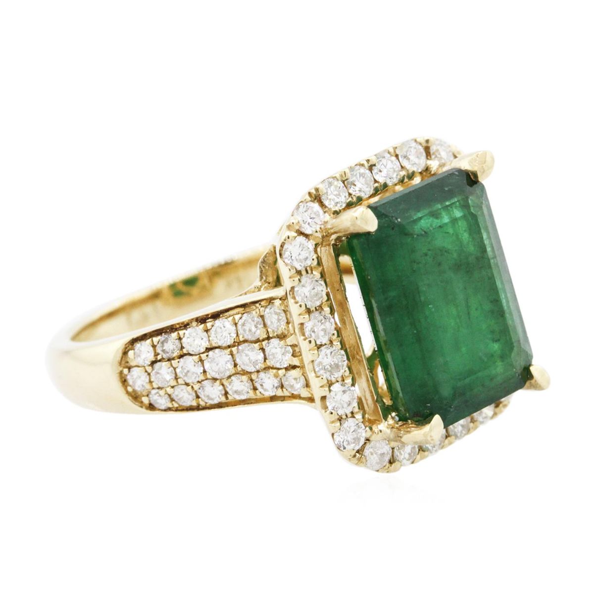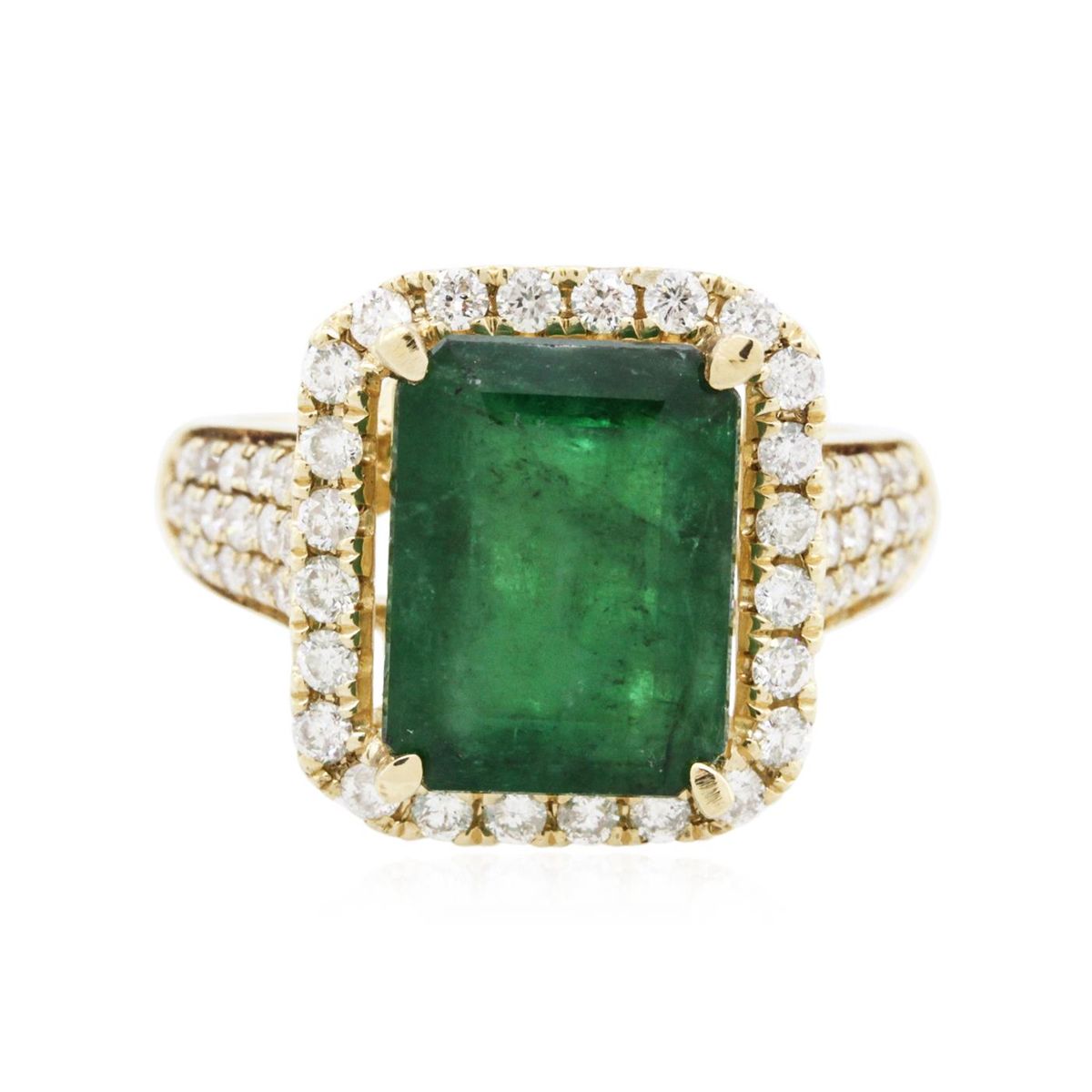 One electronically tested 14KT yellow gold ladies combination cast & assembled emerald and diamond ring with a flat shank with a bright polish finish. Identified with markings of "14K". Condition is new. Containing: One prong set emerald standard step cut natural emerald, measuring 11.91 x 8.99 x 5.64mm, approximate weight of 4.43ct., clarity is heavily included, type III, medium dark, moderately strong, green color, (GIA G 6/4), cut is good. Sixty prong set round brilliant cut diamonds, measuring 1.40 - 1.30 x 0.81mm (depth est.) approximate total weight of 60 Stones = 0.54ct. Clarity: I-1 to I-2. Color: I - J, Cut is Good. Colored gemstones are presumed to have been subjected to commonly used enhancement processes. All diamonds and colored gemstones are graded in the mounting, unless otherwise stated total weight of Colored Stones 4.43ct. Total Weight of Diamonds 0.54ct. Total Weight of Ring 6.30 grams. GGL Appraised at $12,205.00.