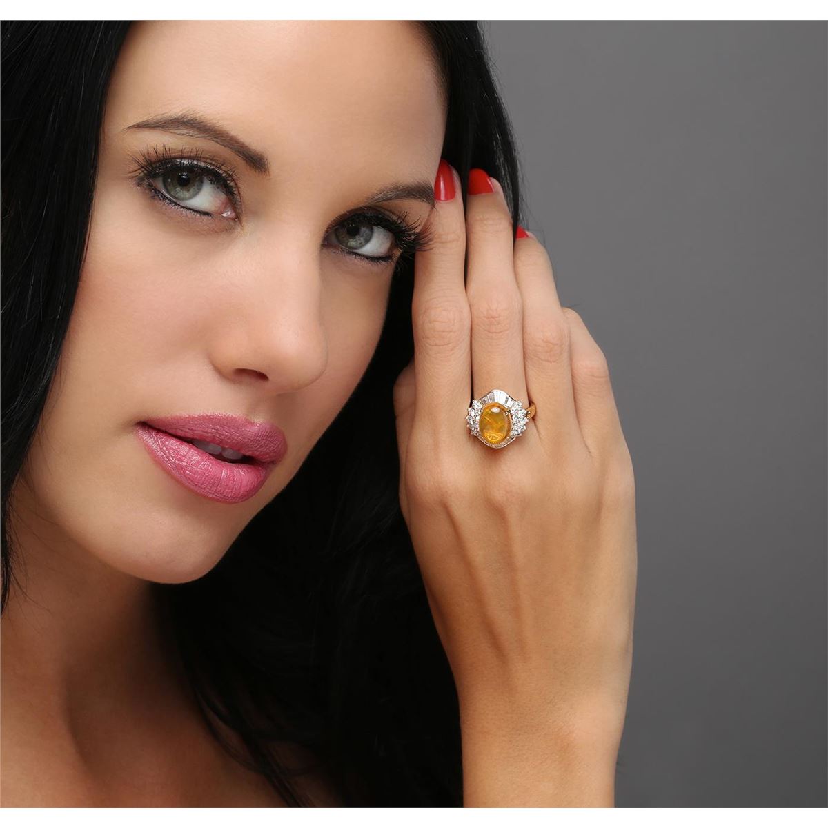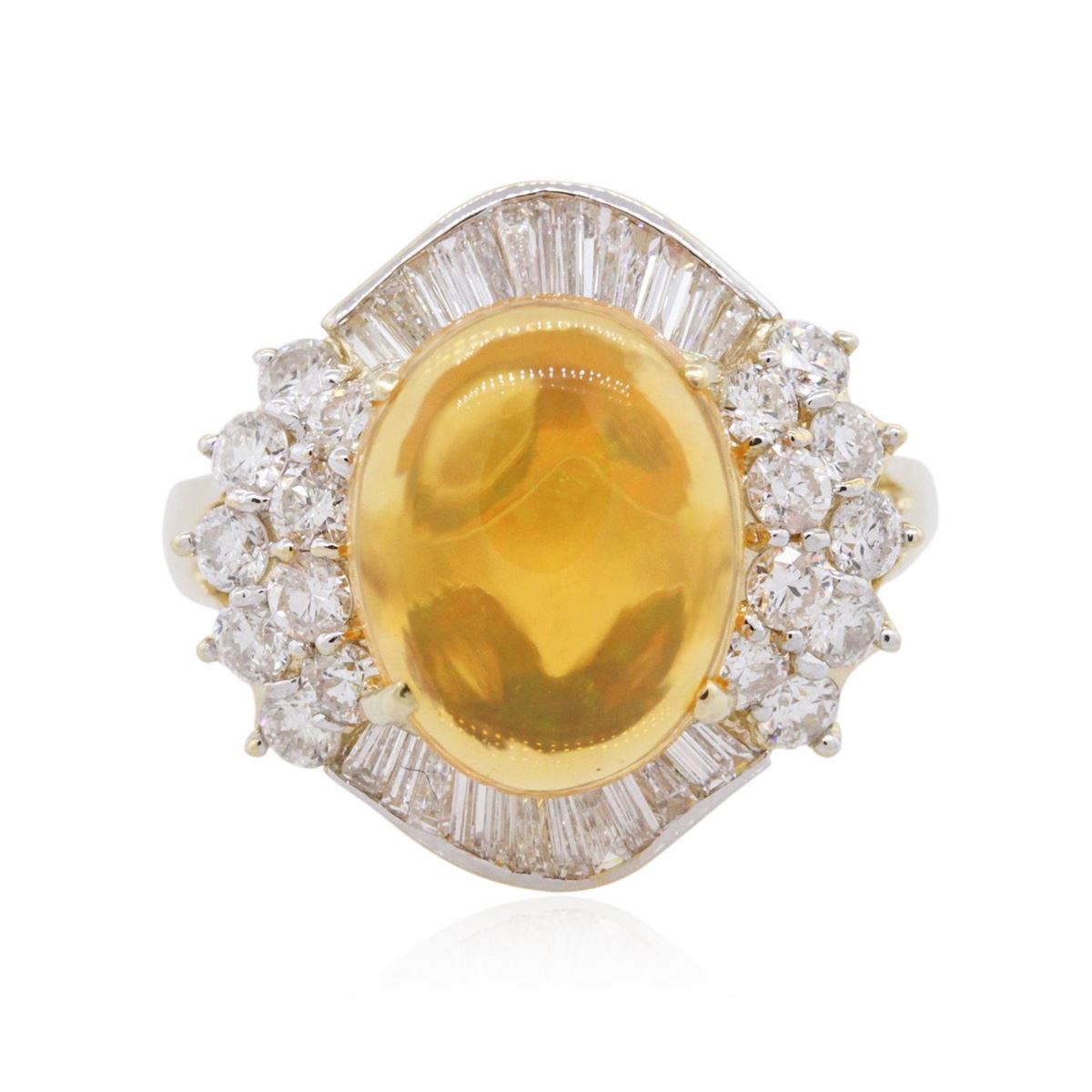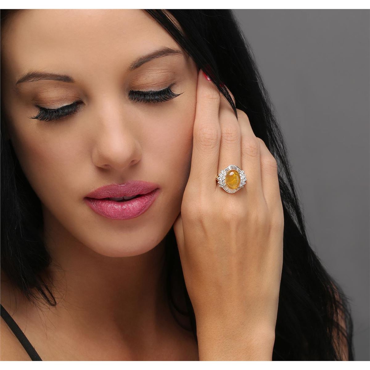 One electronically tested 14KT yellow gold ladies cast opal and diamond ring. The featured opal is set within a stylized diamond bezel supported by three-way split shoulders, completed by a two millimeter wide band. Bright polish finish with rhodium accents. Identified with markings of "14K". Condition is new, good workmanship. Containing: One jelly opal that is cut in a oval shaped cabochon and is prong set, measuring 12.00 mm long x 10.00 mm wide, and 5.48 mm thick and the approximate weight is 4.43 carats. The opal has a somewhat bright, orange-green play of color (fire) in a flashfire pattern; a high dome; a good cut; no inclusions; slight variation in base in its brightness and pattern; and is somewhat directional. Graded in the setting. Eighteen prong set round brilliant cut diamonds, measuring 2.30 - 2.20 x 1.35mm (depth est.) approximate total weight of 18 Stones = 0.85ct. Graded in the setting. Clarity: SI-2 to I-1. Color: F - H Twenty-Four channel set baguette cut diamonds, measuring from 2.40 x 1.10 x 0.77mm (depth est.) to 3.80 x 1.20 x 0.84mm (depth est.) approximate total weight of 24 Stones = 0.63ct. Graded in the setting. Clarity: VVS-2 to VS-2. Color: F - H. Total Weight of Diamonds 1.48ct. Total Weight of Opals 4.43ct. Total Weight of Ring 5.34 grams. AIG Appraised at $6,250.00.