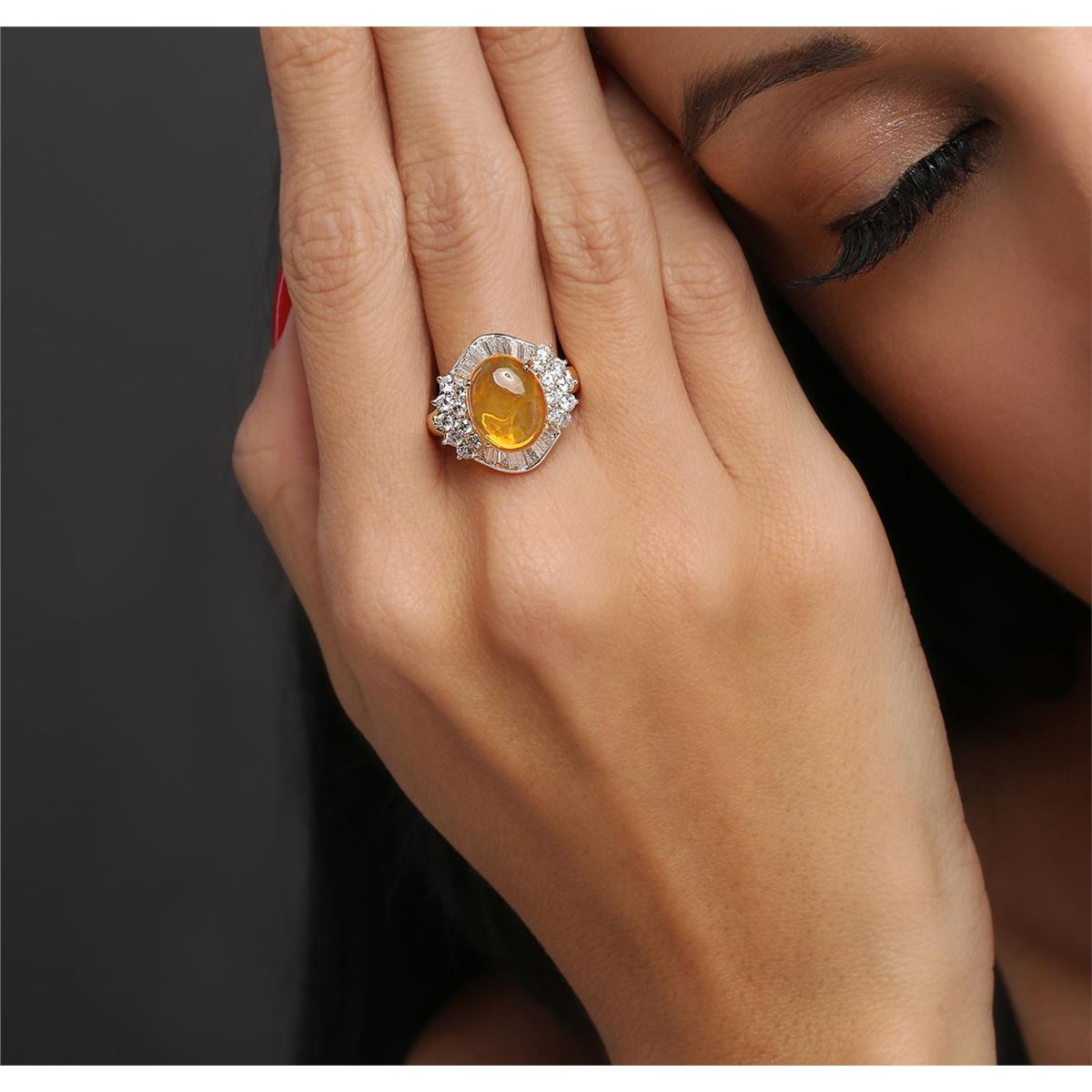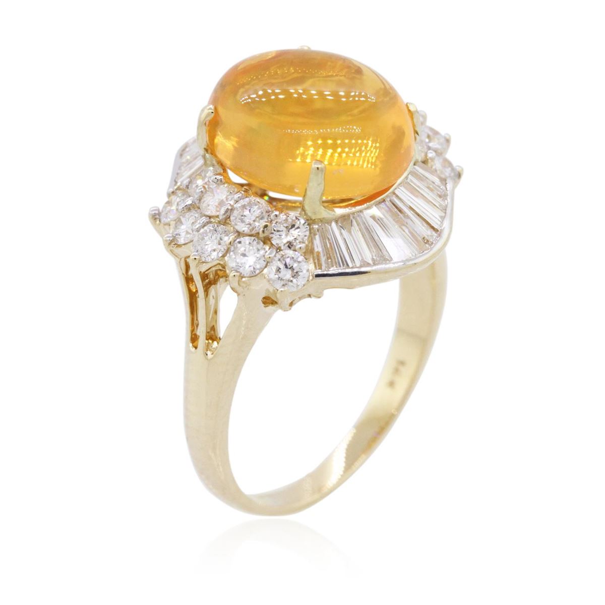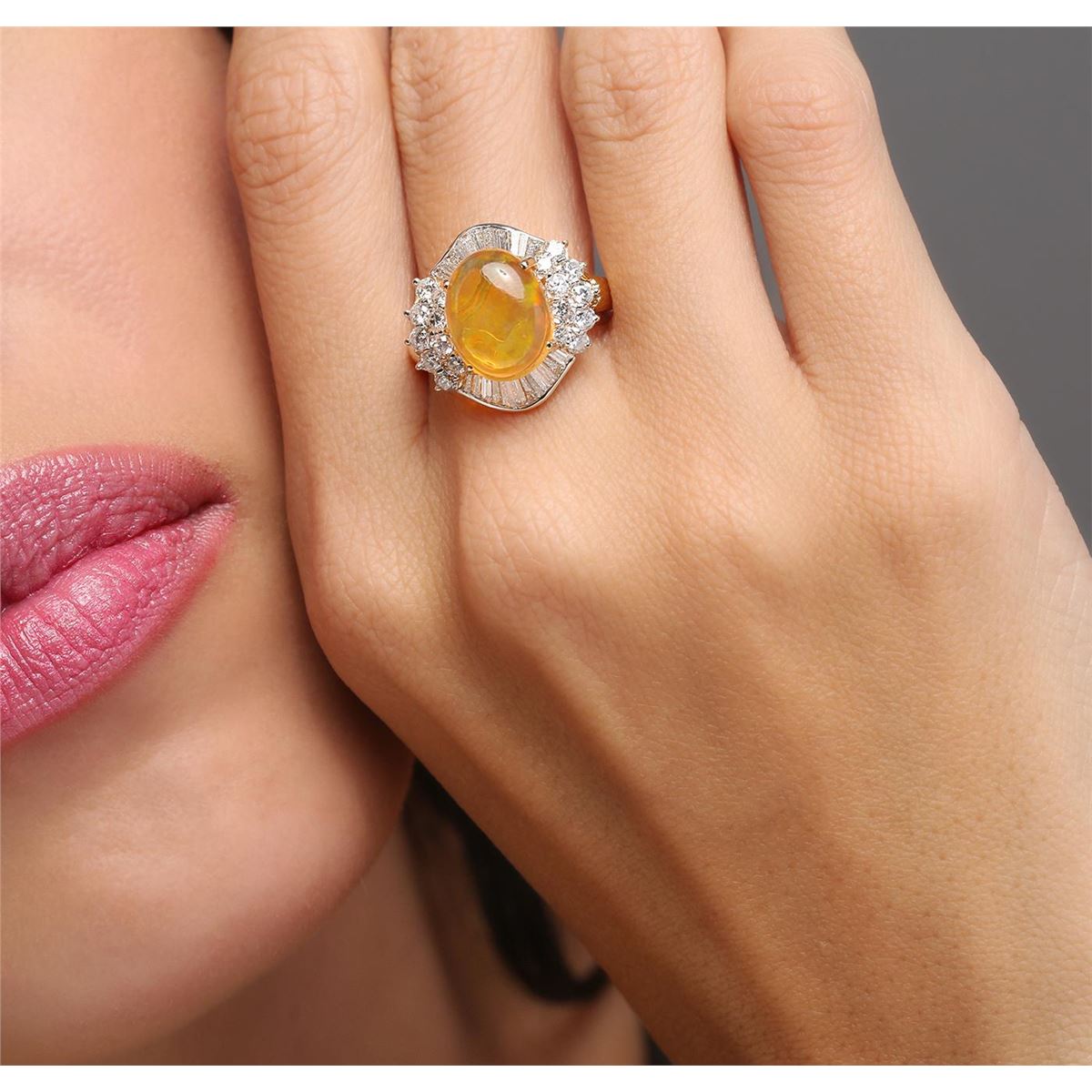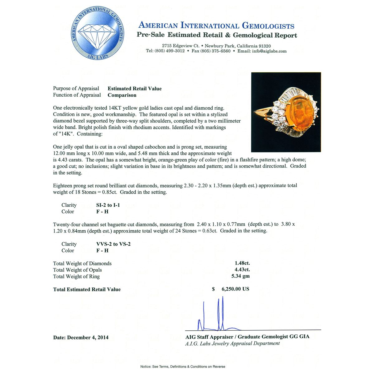 One electronically tested 14KT yellow gold ladies cast opal and diamond ring. The featured opal is set within a stylized diamond bezel supported by three-way split shoulders, completed by a two millimeter wide band. Bright polish finish with rhodium accents. Identified with markings of "14K". Condition is new, good workmanship. Containing: One jelly opal that is cut in a oval shaped cabochon and is prong set, measuring 12.00 mm long x 10.00 mm wide, and 5.48 mm thick and the approximate weight is 4.43 carats. The opal has a somewhat bright, orange-green play of color (fire) in a flashfire pattern; a high dome; a good cut; no inclusions; slight variation in base in its brightness and pattern; and is somewhat directional. Graded in the setting. Eighteen prong set round brilliant cut diamonds, measuring 2.30 - 2.20 x 1.35mm (depth est.) approximate total weight of 18 Stones = 0.85ct. Graded in the setting. Clarity: SI-2 to I-1. Color: F - H Twenty-Four channel set baguette cut diamonds, measuring from 2.40 x 1.10 x 0.77mm (depth est.) to 3.80 x 1.20 x 0.84mm (depth est.) approximate total weight of 24 Stones = 0.63ct. Graded in the setting. Clarity: VVS-2 to VS-2. Color: F - H. Total Weight of Diamonds 1.48ct. Total Weight of Opals 4.43ct. Total Weight of Ring 5.34 grams. AIG Appraised at $6,250.00.