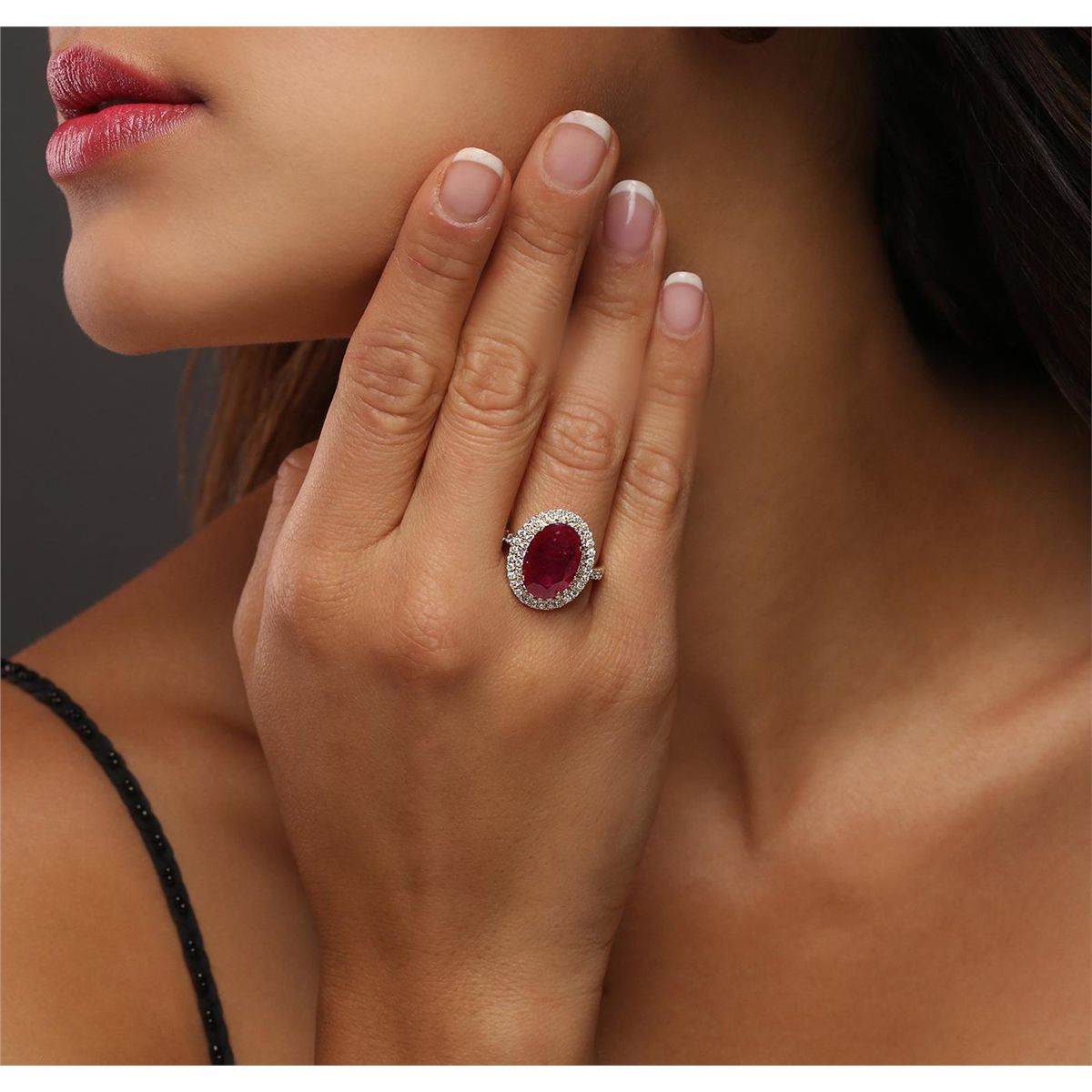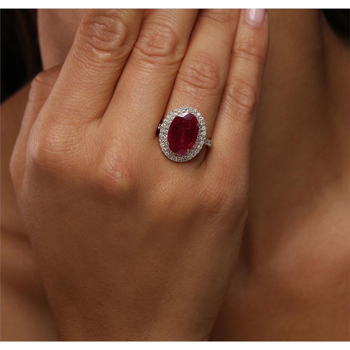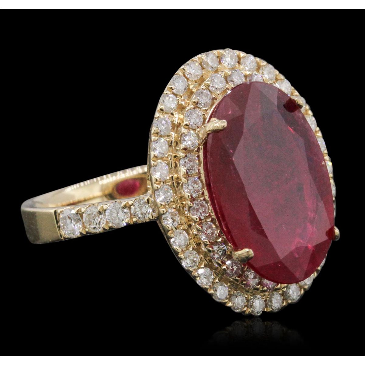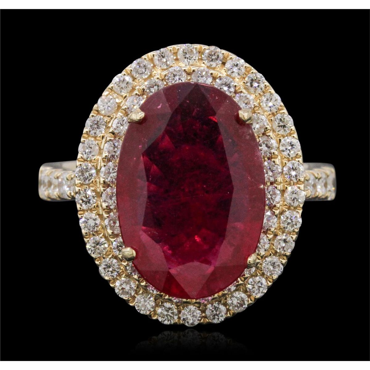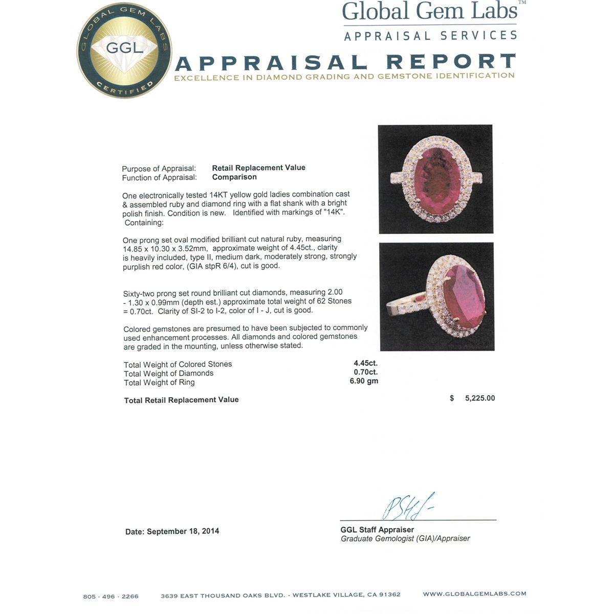 One electronically tested 14KT yellow gold ladies combination cast & assembled ruby and diamond ring with a flat shank with a bright polish finish. Identified with markings of "14K". Condition is new. Containing: One prong set oval modified brilliant cut natural ruby, measuring 14.85 x 10.30 x 3.52mm, approximate weight of 4.45ct., clarity is heavily included, type II, medium dark, moderately strong, strongly purplish red color, (GIA stpR 6/4), cut is good. Sixty-Two prong set round brilliant cut diamonds, measuring 2.00 - 1.30 x 0.99mm (depth est.) approximate total weight of 62 Stones = 0.70ct. Clarity: SI-2 to I-2. Color: I - J, Cut is Good. Colored gemstones are presumed to have been subjected to commonly used enhancement processes. All diamonds and colored gemstones are graded in the mounting, unless otherwise stated. Total Weight of Colored Stones 4.45ct. Total Weight of Diamonds 0.70ct. Total Weight of Ring 6.90 grams. GGL Appraised at $5,225.00. GGL Appraised at $7,375.00.