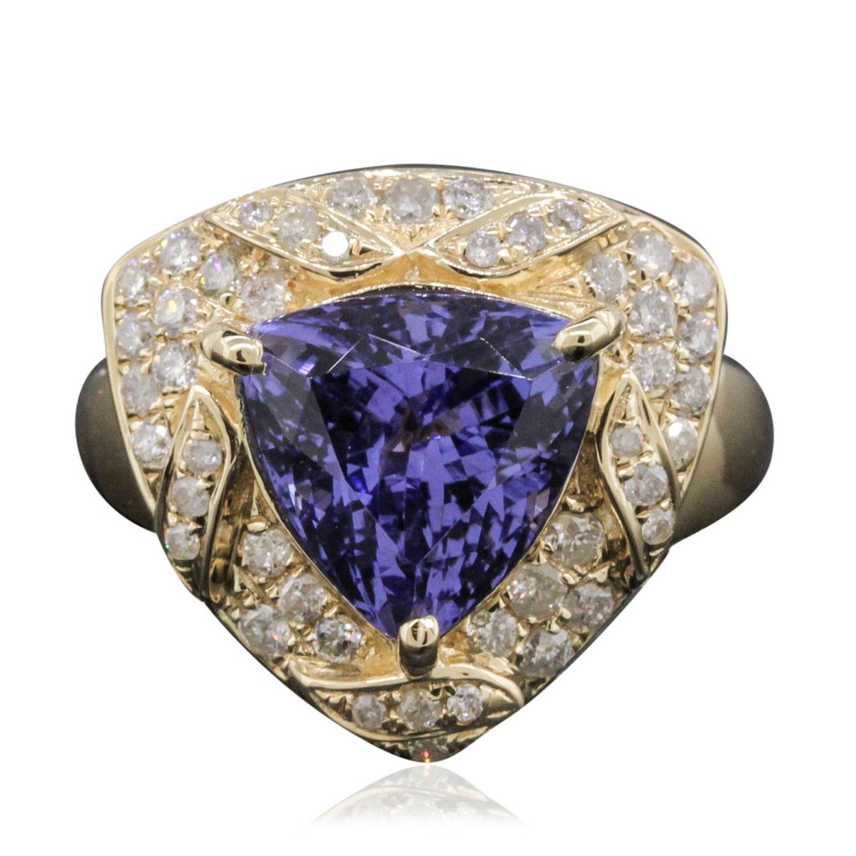 One electronically tested 14KT yellow gold ladies combination cast & assembled tanzanite and diamond ring with a flat shank with a bright polish finish. Identified with markings of "14K". Condition is new. Containing: One prong set triangle modified brilliant cut natural tanzanite, measuring 10.45 x 10.45 x 6.79mm, approximate weight of 4.47ct., clarity is eye clean, type I, medium, very slightly grayish, violet color, (GIA V 5/3), cut is very good. Forty-One prong set round brilliant cut diamonds, measuring 1.50 - 1.20 x 0.81mm (depth est.) approximate total weight of 41 Stones = 0.37ct. Clarity: I-1 to I-2. Color: I - J, Cut is Good. Colored gemstones are presumed to have been subjected to commonly used enhancement processes. All diamonds and colored gemstones are graded in the mounting, unless otherwise stated. Total Weight of Colored Stones 4.47ct. Total Weight of Diamonds 0.37ct. Total Weight of Ring 7.50 grams. GGL Appraised at $9,735.00.