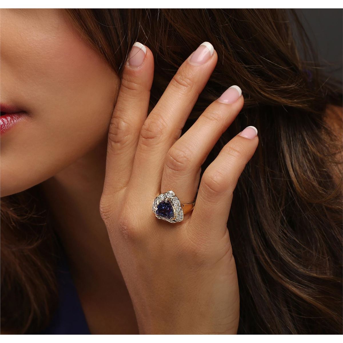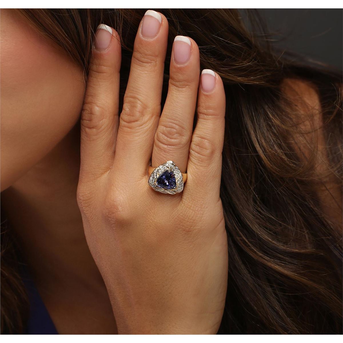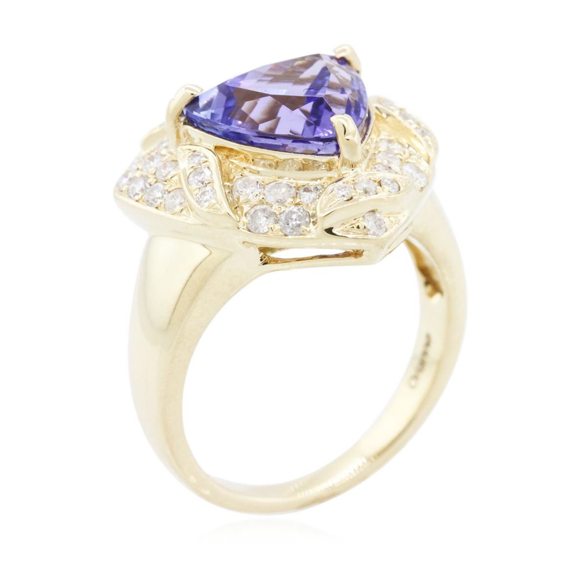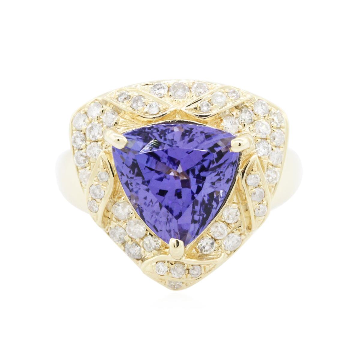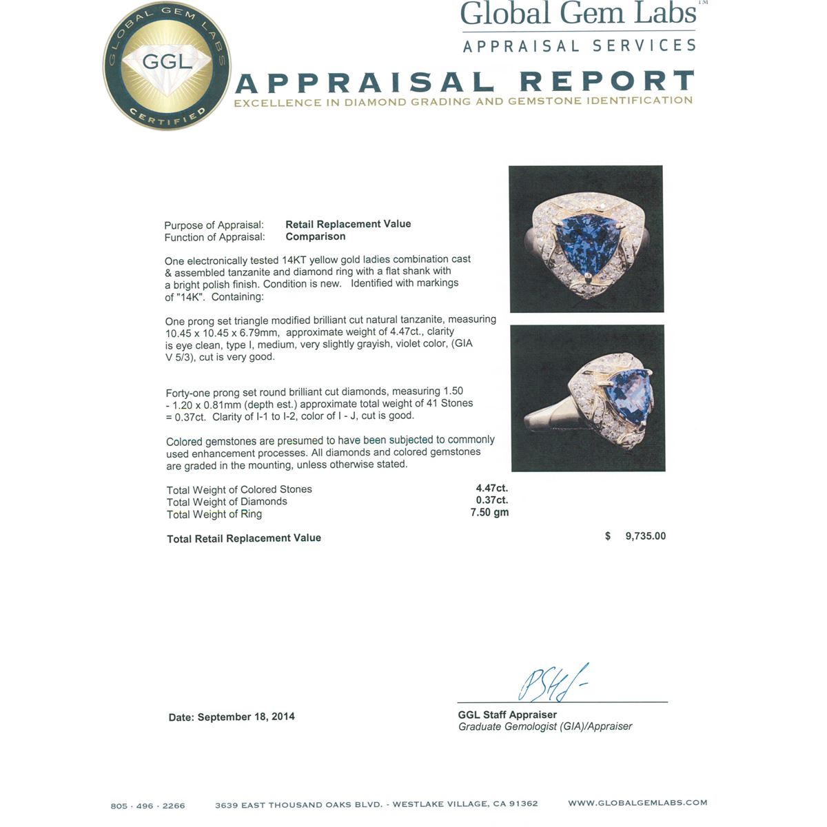 One electronically tested 14KT yellow gold ladies combination cast & assembled tanzanite and diamond ring with a flat shank with a bright polish finish. Identified with markings of "14K". Condition is new. Containing: One prong set triangle modified brilliant cut natural tanzanite, measuring 10.45 x 10.45 x 6.79mm, approximate weight of 4.47ct., clarity is eye clean, type I, medium, very slightly grayish, violet color, (GIA V 5/3), cut is very good. Forty-One prong set round brilliant cut diamonds, measuring 1.50 - 1.20 x 0.81mm (depth est.) approximate total weight of 41 Stones = 0.37ct. Clarity: I-1 to I-2. Color: I - J, Cut is Good. Colored gemstones are presumed to have been subjected to commonly used enhancement processes. All diamonds and colored gemstones are graded in the mounting, unless otherwise stated. Total Weight of Colored Stones 4.47ct. Total Weight of Diamonds 0.37ct. Total Weight of Ring 7.50 grams. GGL Appraised at $9,735.00.