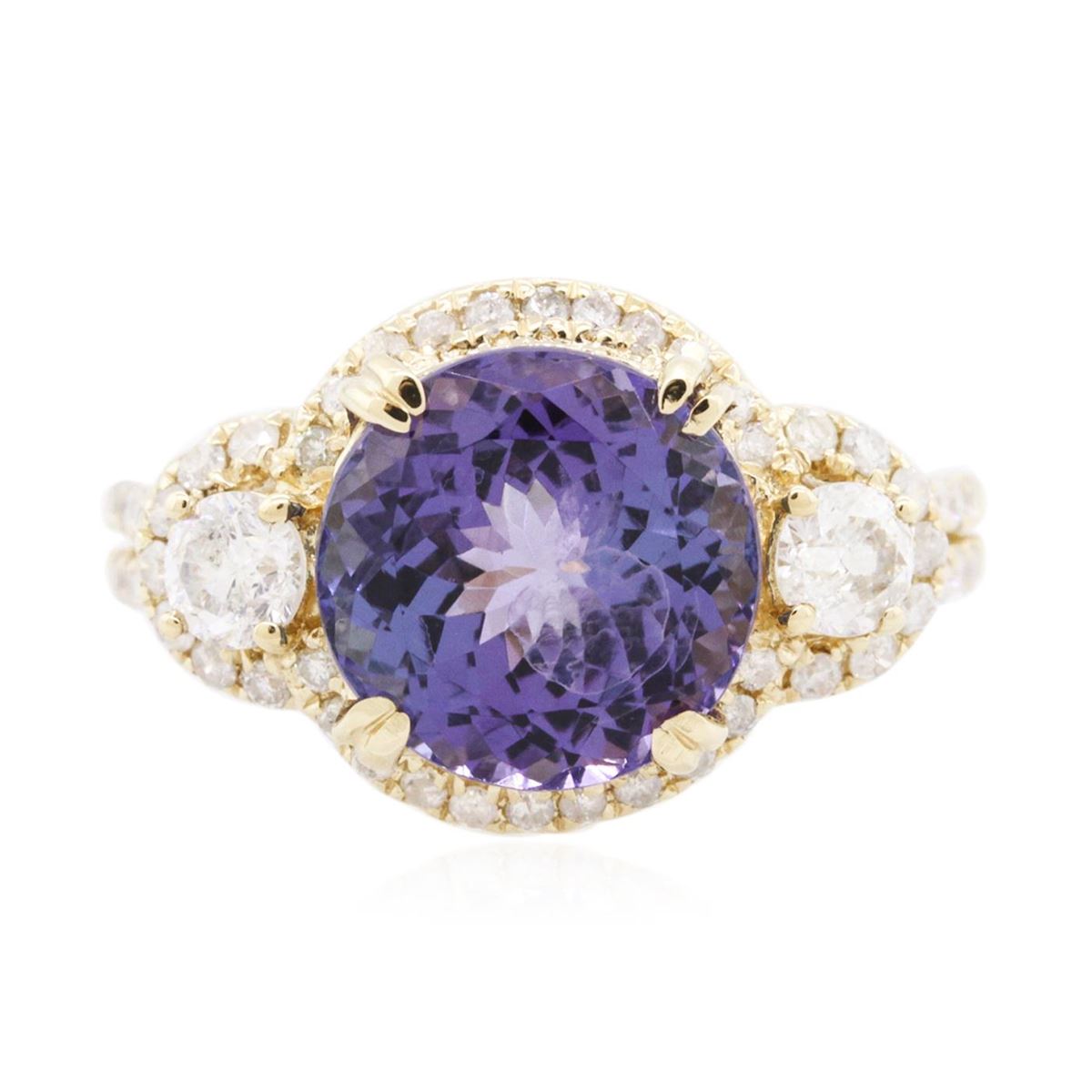 One electronically tested 14KT yellow gold ladies cast tanzanite & diamond ring with a bright finish. The featured tanzanite is set within a diamond bezel, supported by tiered diamond set shoulders, completed by a two millimeter wide band. Trademark is Orianne. Identified with markings of "14K". Condition is good. Containing: One prong set round mixed cut natural tanzanite, measuring 10.00 - 10.00 x 6.25 mm, 7% bulge factor, approximate weight of 4.48ct., clarity is eye clean, type I, medium dark, slightly grayish, bluish violet color, (GIA bV 6/2), cut is good. Transmitting light with no distortion, transparent. Graded in the setting. Tanzanite is a very rare gemstone that is only found in the country of Tanzania. Tanzanite occurs in gray, brown, violet, blue, reddish-purple, & green. The gem is interesting because of its exceptional pleochroism. Rotated in different directions a tanzanite will exhibit multiple changes of color. Tanzanite has a low tolerance to ultrasonic cleaning, and should not be cleaned using this method. Two prong set round brilliant cut diamonds, measuring 3.60 - 3.50 x 2.13mm (depth est.) approximate total weight of 2 Stones = 0.32ct. Graded in the setting. Clarity: I-1 to I-2. Color: H Fifty-Two prong set round brilliant cut diamonds, measuring 1.30 - 1.20 x 0.75mm (depth est.) approximate total weight of 52 Stones = 0.36ct. Graded in the setting. Clarity: I-1 to I-3. Color: G - I. Total Weight of Colored Stones 4.48ct. Total Weight of Diamonds 0.68ct. Total Weight of Ring 5.00 grams. AIG Appraised at $10,200.00.