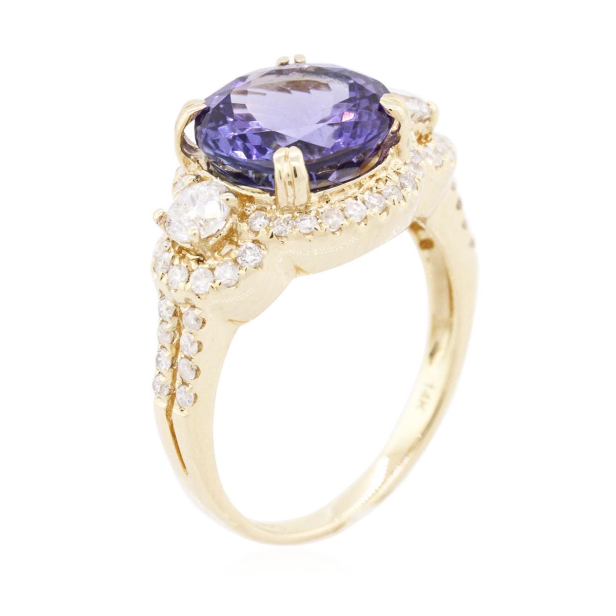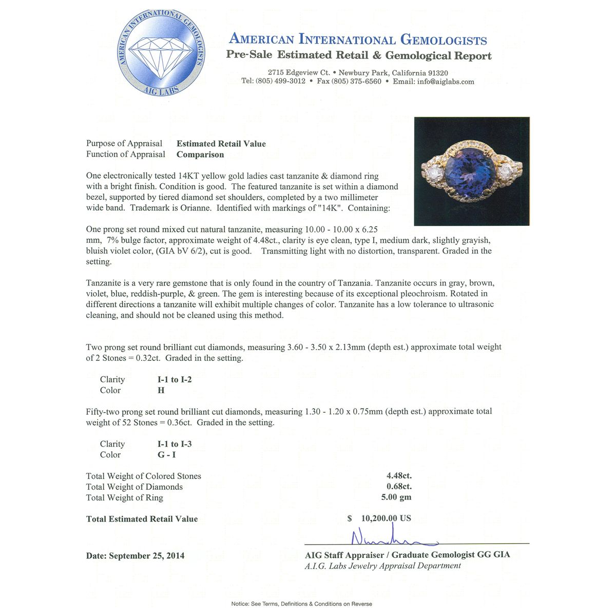 One electronically tested 14KT yellow gold ladies cast tanzanite & diamond ring with a bright finish. The featured tanzanite is set within a diamond bezel, supported by tiered diamond set shoulders, completed by a two millimeter wide band. Trademark is Orianne. Identified with markings of "14K". Condition is good. Containing: One prong set round mixed cut natural tanzanite, measuring 10.00 - 10.00 x 6.25 mm, 7% bulge factor, approximate weight of 4.48ct., clarity is eye clean, type I, medium dark, slightly grayish, bluish violet color, (GIA bV 6/2), cut is good. Transmitting light with no distortion, transparent. Graded in the setting. Tanzanite is a very rare gemstone that is only found in the country of Tanzania. Tanzanite occurs in gray, brown, violet, blue, reddish-purple, & green. The gem is interesting because of its exceptional pleochroism. Rotated in different directions a tanzanite will exhibit multiple changes of color. Tanzanite has a low tolerance to ultrasonic cleaning, and should not be cleaned using this method. Two prong set round brilliant cut diamonds, measuring 3.60 - 3.50 x 2.13mm (depth est.) approximate total weight of 2 Stones = 0.32ct. Graded in the setting. Clarity: I-1 to I-2. Color: H Fifty-Two prong set round brilliant cut diamonds, measuring 1.30 - 1.20 x 0.75mm (depth est.) approximate total weight of 52 Stones = 0.36ct. Graded in the setting. Clarity: I-1 to I-3. Color: G - I. Total Weight of Colored Stones 4.48ct. Total Weight of Diamonds 0.68ct. Total Weight of Ring 5.00 grams. AIG Appraised at $10,200.00.