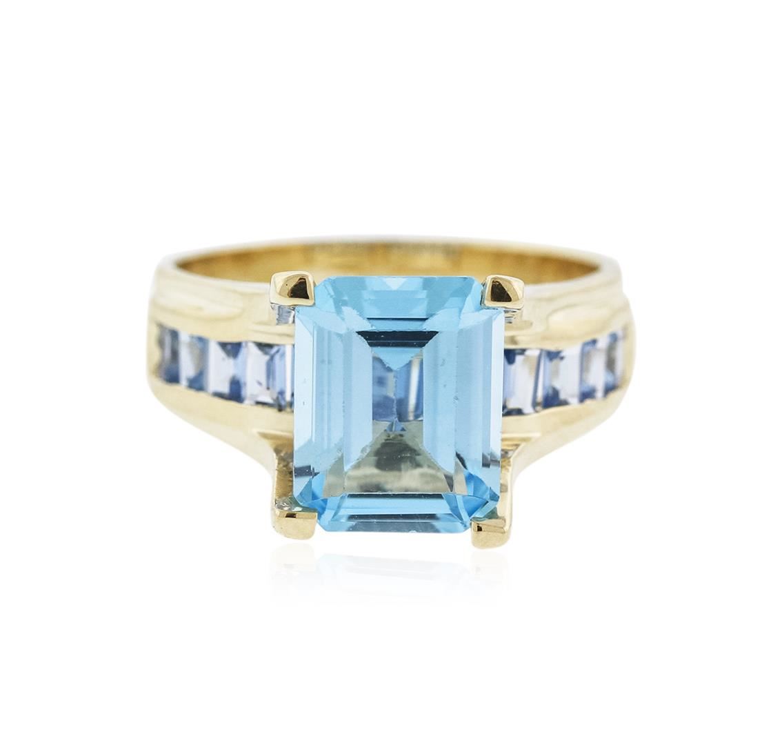 One ring featuring: 14KT yellow gold weighing 5.83 grams containing one blue topaz center weighing 3.79ct and blue topaz side stones weighing a total of 0.75ct.