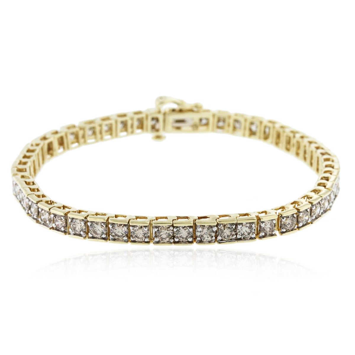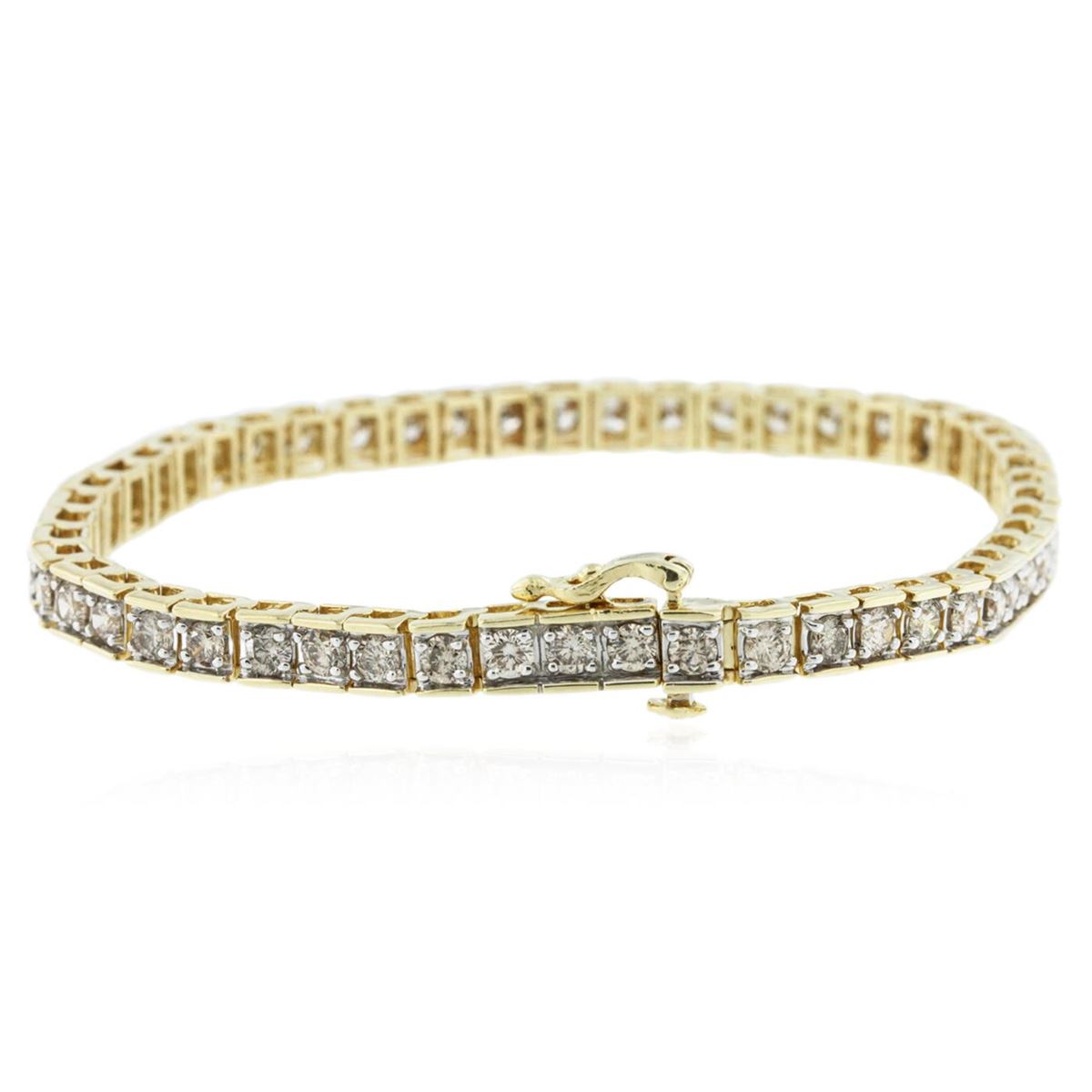 One electronically tested 14KT yellow gold ladies cast & assembled diamond tennis bracelet. Seven and one-quarter inch length bracelet composed of a flexible ribbon of diamonds, terminating in a concealed clasp with safety. Identified with markings of "14K". Bright polish finish with rhodium accents. Condition is good. Fifty-One prong set round brilliant cut diamonds, measuring 3.00 - 2.80 x 1.74mm (depth est) approximate total weight of 51 stones = 4.65ct. Graded in the setting. Clarity SI-1 to I-1 Color very light brown to light brown. Total weight of diamonds 4.65ct. Total weight of tennis bracelet 14.91 grams. AIG Appraised at $11,940.00.