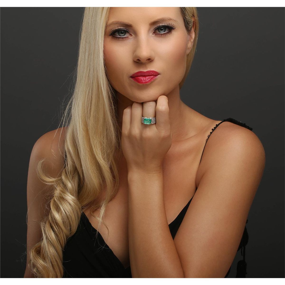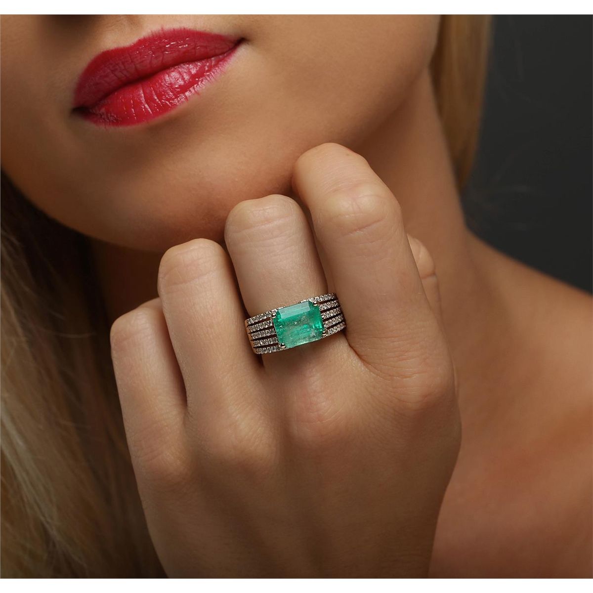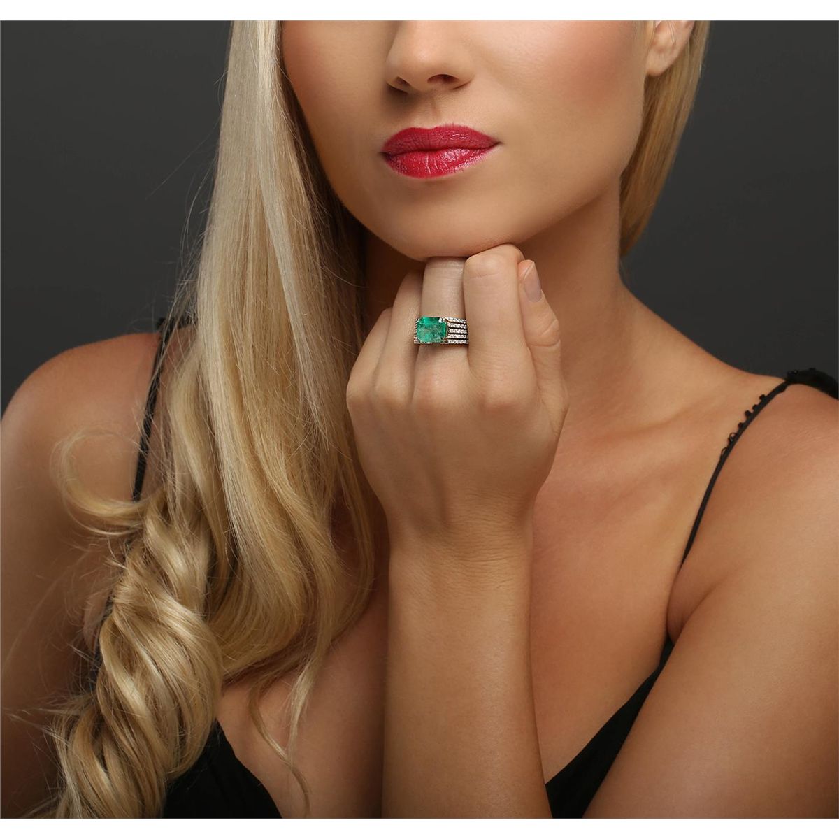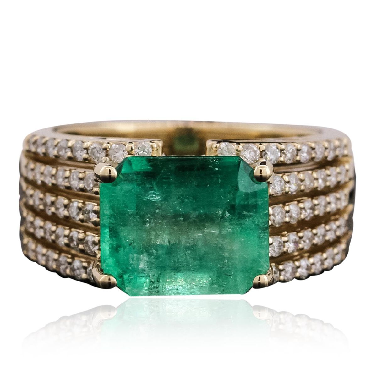 One electronically tested 14KT yellow gold ladies combination cast & assembled emerald and diamond ring with a flat shank with a bright polish finish. Identified with markings of "14K". Condition is new. Containing: One prong set emerald standard step cut natural emerald, measuring 10.67 x 8.98 x 6.69mm, approximate weight of 4.71ct., clarity is moderately included, type III, medium light, very slightly grayish, bluish green color, (GIA bG 4/3), cut is good. Sixty-Eight prong set round brilliant cut diamonds, measuring 1.30 - 1.30 x 0.78mm (depth est.) approximate total weight of 68 Stones = 0.54ct. Clarity: SI-2 to I-1. Color: I - J, Cut is Good. Colored gemstones are presumed to have been subjected to commonly used enhancement processes. All diamonds and colored gemstones are graded in the mounting, unless otherwise stated total weight of Colored Stones 4.71ct. Total Weight of Diamonds 0.54ct. Total Weight of Ring 8.30 grams. GGL Appraised at $8,865.00.