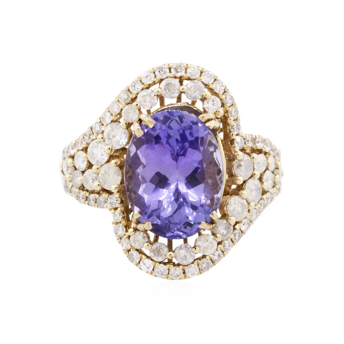 One electronically tested 14KT yellow gold ladies combination cast & assembled tanzanite and diamond ring with a flat shank with a bright polish finish. Identified with markings of "14K". Condition is new. Containing: One prong set oval modified brilliant cut natural tanzanite, measuring 11.31 x 8.60 x 7.13mm, approximate weight of 4.73ct., clarity is eye clean, type I, medium light, very slightly grayish, violet color, (GIA V 4/3), cut is good. Seventy-Two prong set round brilliant cut diamonds, measuring 2.10 - 1.30 x 1.02mm (depth est.) approximate total weight of 72 Stones = 1.29ct. Clarity: SI-1 to I-1. Color: I - J, Cut is Good. Colored gemstones are presumed to have been subjected to commonly used enhancement processes. All diamonds and colored gemstones are graded in the mounting, unless otherwise stated. Total Weight of Colored Stones 4.73ct. Total Weight of Diamonds 1.29ct. Total Weight of Ring 5.30 grams. GGL Appraised at $10,960.00.