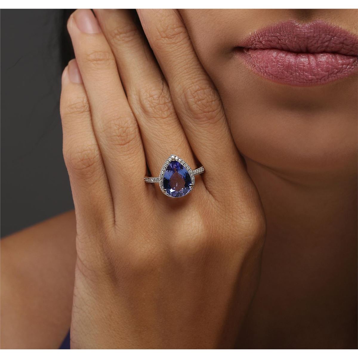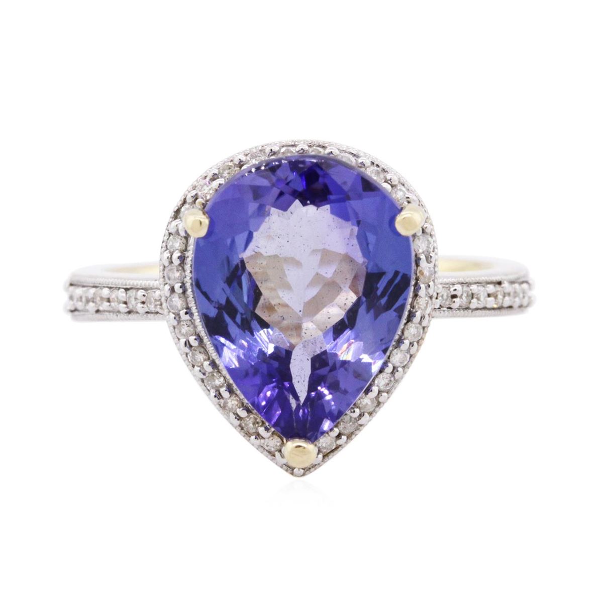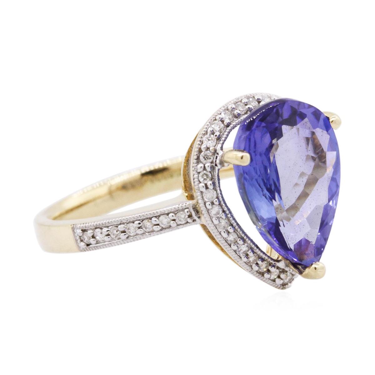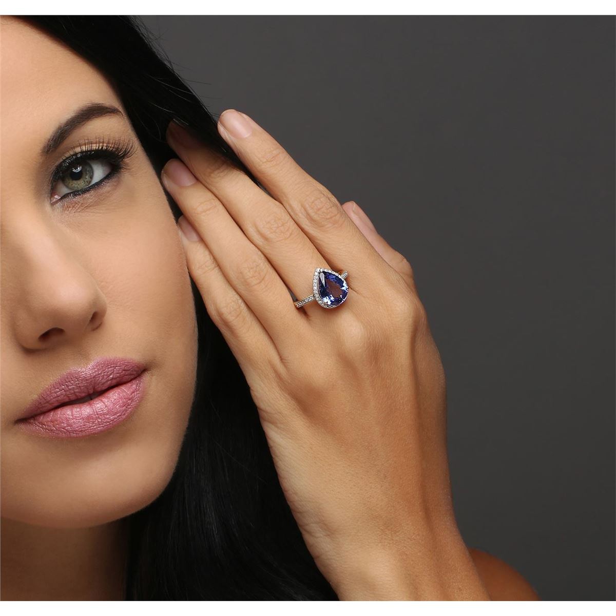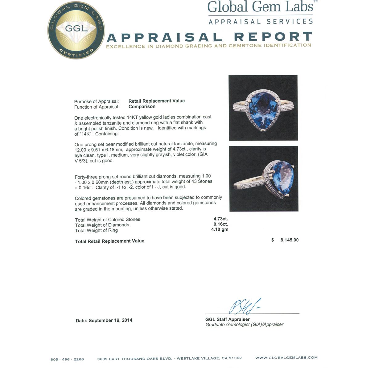 One electronically tested 14KT yellow gold ladies combination cast & assembled tanzanite and diamond ring with a flat shank with a bright polish finish. Identified with markings of "14K". Condition is new. Containing: One prong set pear modified brilliant cut natural tanzanite, measuring 12.00 x 9.51 x 6.18mm, approximate weight of 4.73ct., clarity is eye clean, type I, medium, very slightly grayish, violet color, (GIA V 5/3), cut is good. Forty-Three prong set round brilliant cut diamonds, measuring 1.00 - 1.00 x 0.60mm (depth est.) approximate total weight of 43 Stones = 0.16ct. Clarity: I-1 to I-2. Color: I - J, Cut is Good. Colored gemstones are presumed to have been subjected to commonly used enhancement processes. All diamonds and colored gemstones are graded in the mounting, unless otherwise stated. Total Weight of Colored Stones 4.73ct. Total Weight of Diamonds 0.16ct. Total Weight of Ring 4.10 grams. GGL Appraised at $8,145.00.