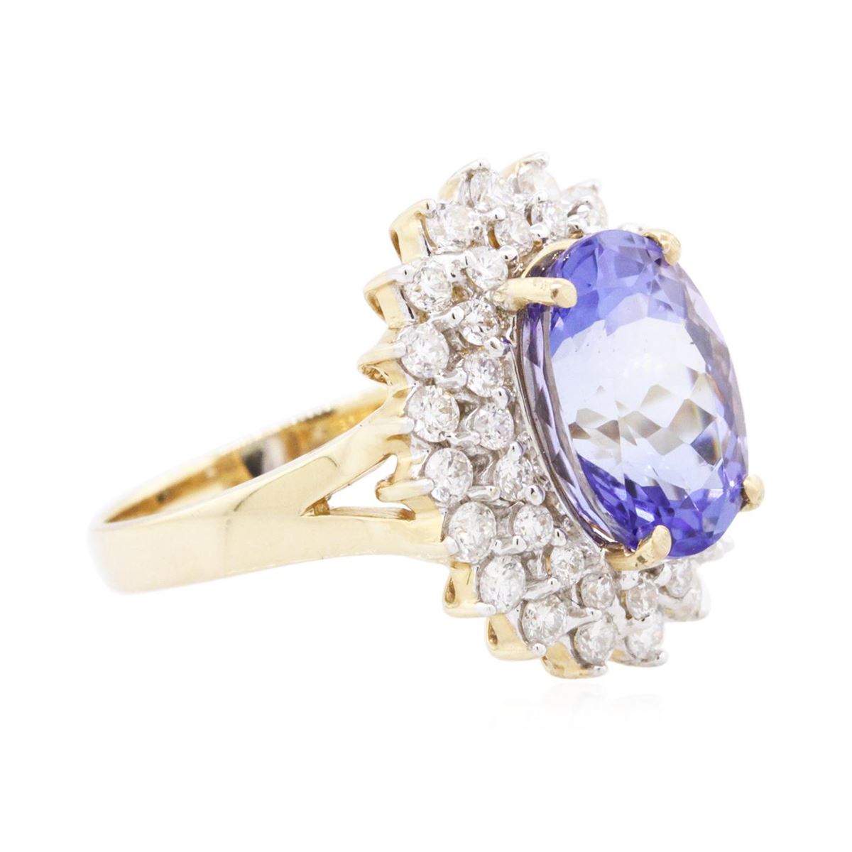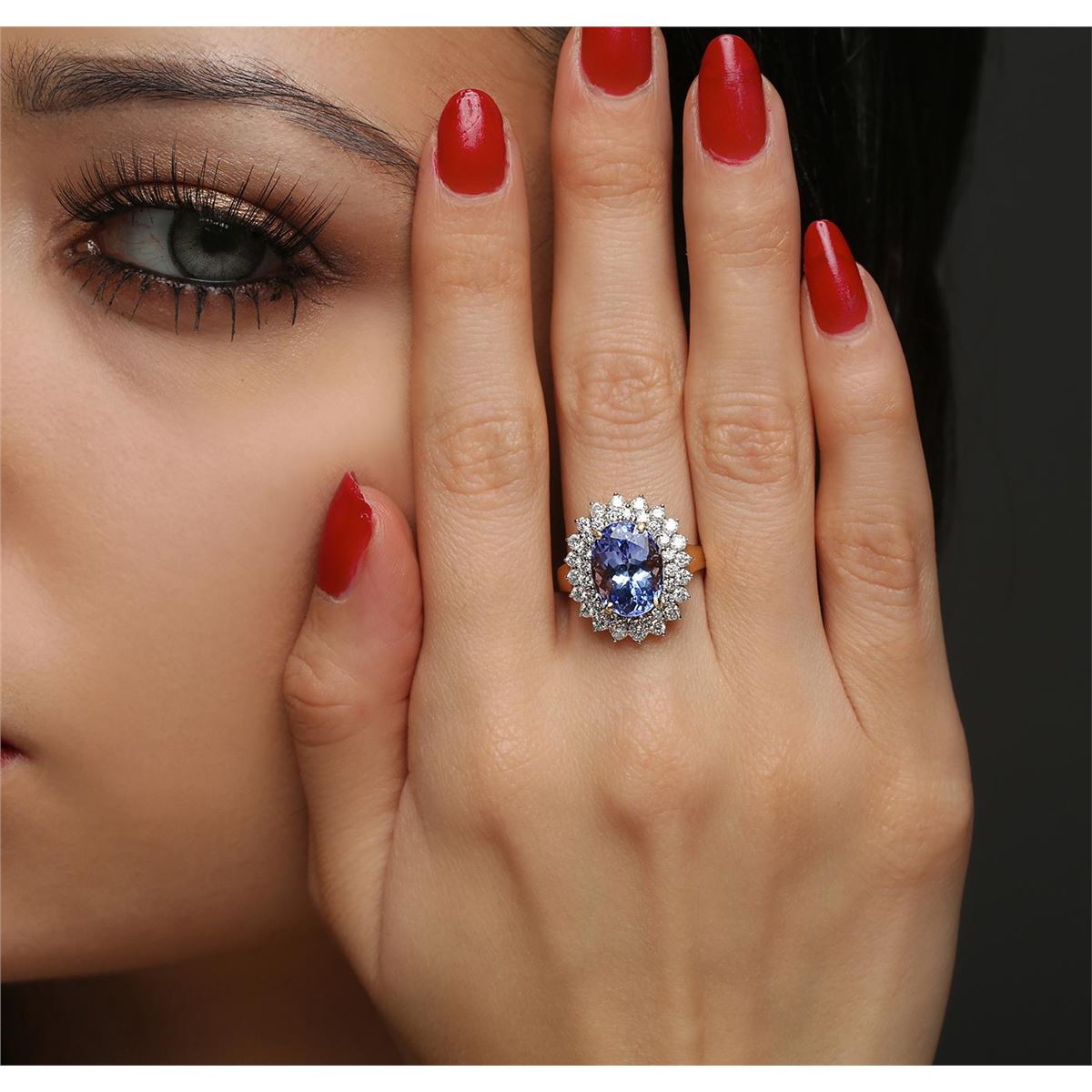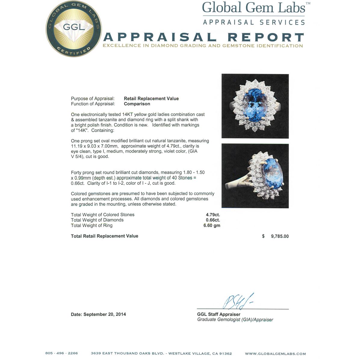 One electronically tested 14KT yellow gold ladies combination cast & assembled tanzanite and diamond ring with a split shank with a bright polish finish. Identified with markings of "14K". Condition is new. Containing: One prong set oval modified brilliant cut natural tanzanite, measuring 11.19 x 9.03 x 7.00mm, approximate weight of 4.79ct., clarity is eye clean, type I, medium, moderately strong, violet color, (GIA V 5/4), cut is good. Forty prong set round brilliant cut diamonds, measuring 1.80 - 1.50 x 0.99mm (depth est.) approximate total weight of 40 Stones = 0.66ct. Clarity: I-1 to I-2. Color: I - J, Cut is Good. Colored gemstones are presumed to have been subjected to commonly used enhancement processes. All diamonds and colored gemstones are graded in the mounting, unless otherwise stated. Total Weight of Colored Stones 4.79ct. Total Weight of Diamonds 0.66ct. Total Weight of Ring 6.60 grams. GGL Appraised at $9,785.00.