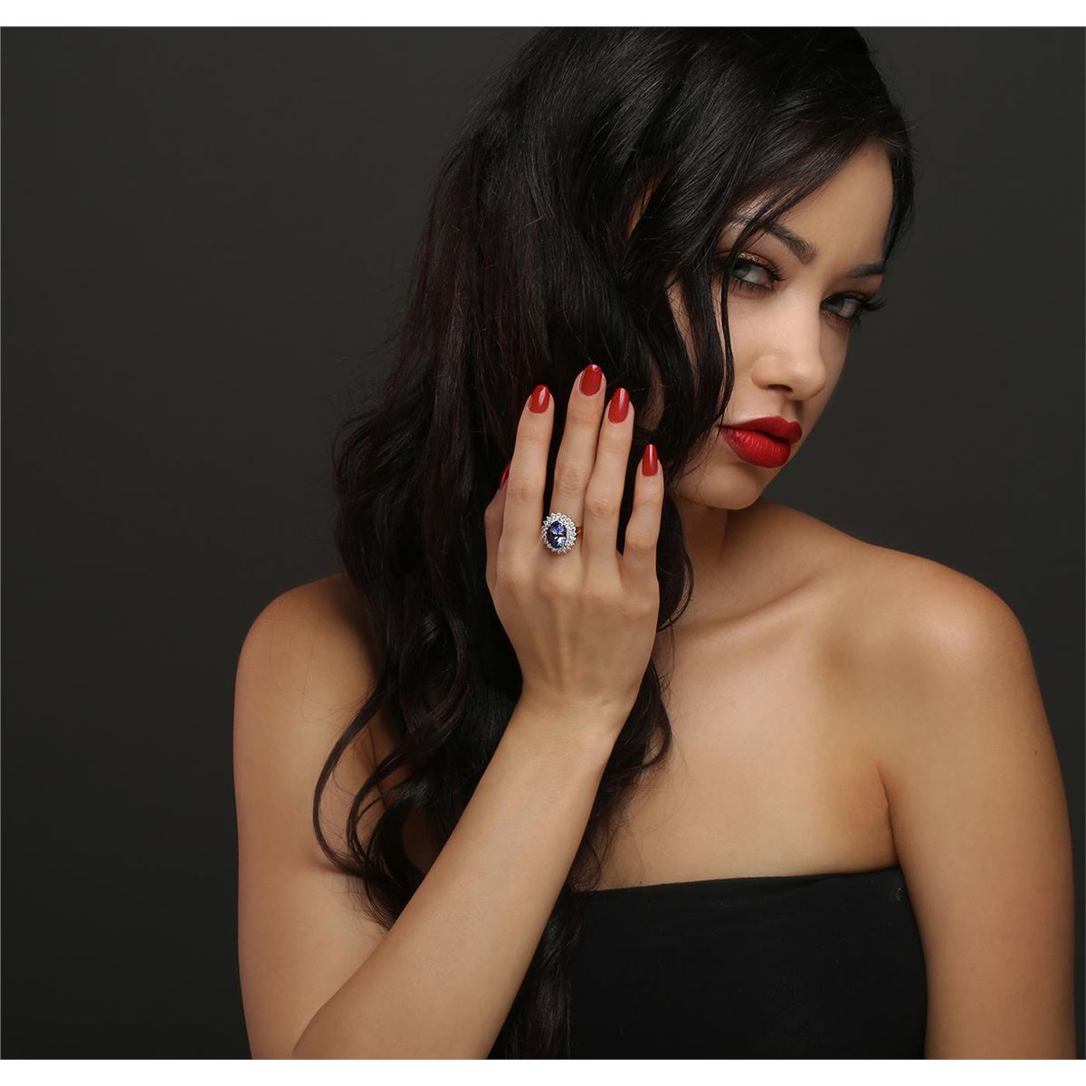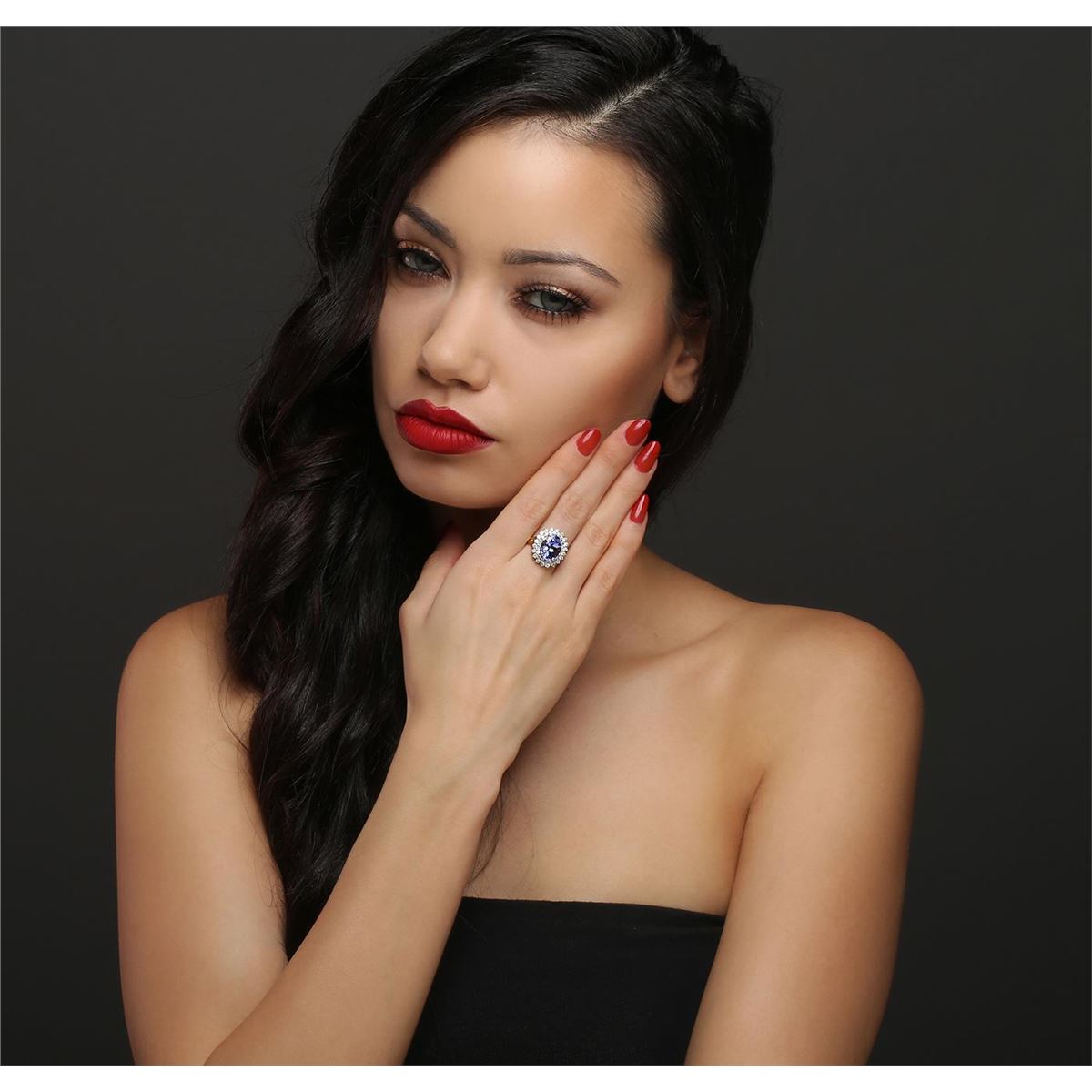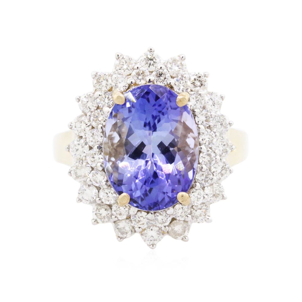 One electronically tested 14KT yellow gold ladies combination cast & assembled tanzanite and diamond ring with a split shank with a bright polish finish. Identified with markings of "14K". Condition is new. Containing: One prong set oval modified brilliant cut natural tanzanite, measuring 11.19 x 9.03 x 7.00mm, approximate weight of 4.79ct., clarity is eye clean, type I, medium, moderately strong, violet color, (GIA V 5/4), cut is good. Forty prong set round brilliant cut diamonds, measuring 1.80 - 1.50 x 0.99mm (depth est.) approximate total weight of 40 Stones = 0.66ct. Clarity: I-1 to I-2. Color: I - J, Cut is Good. Colored gemstones are presumed to have been subjected to commonly used enhancement processes. All diamonds and colored gemstones are graded in the mounting, unless otherwise stated. Total Weight of Colored Stones 4.79ct. Total Weight of Diamonds 0.66ct. Total Weight of Ring 6.60 grams. GGL Appraised at $9,785.00.
