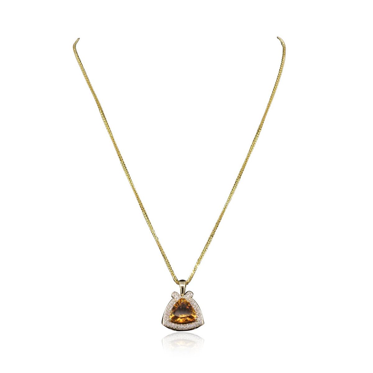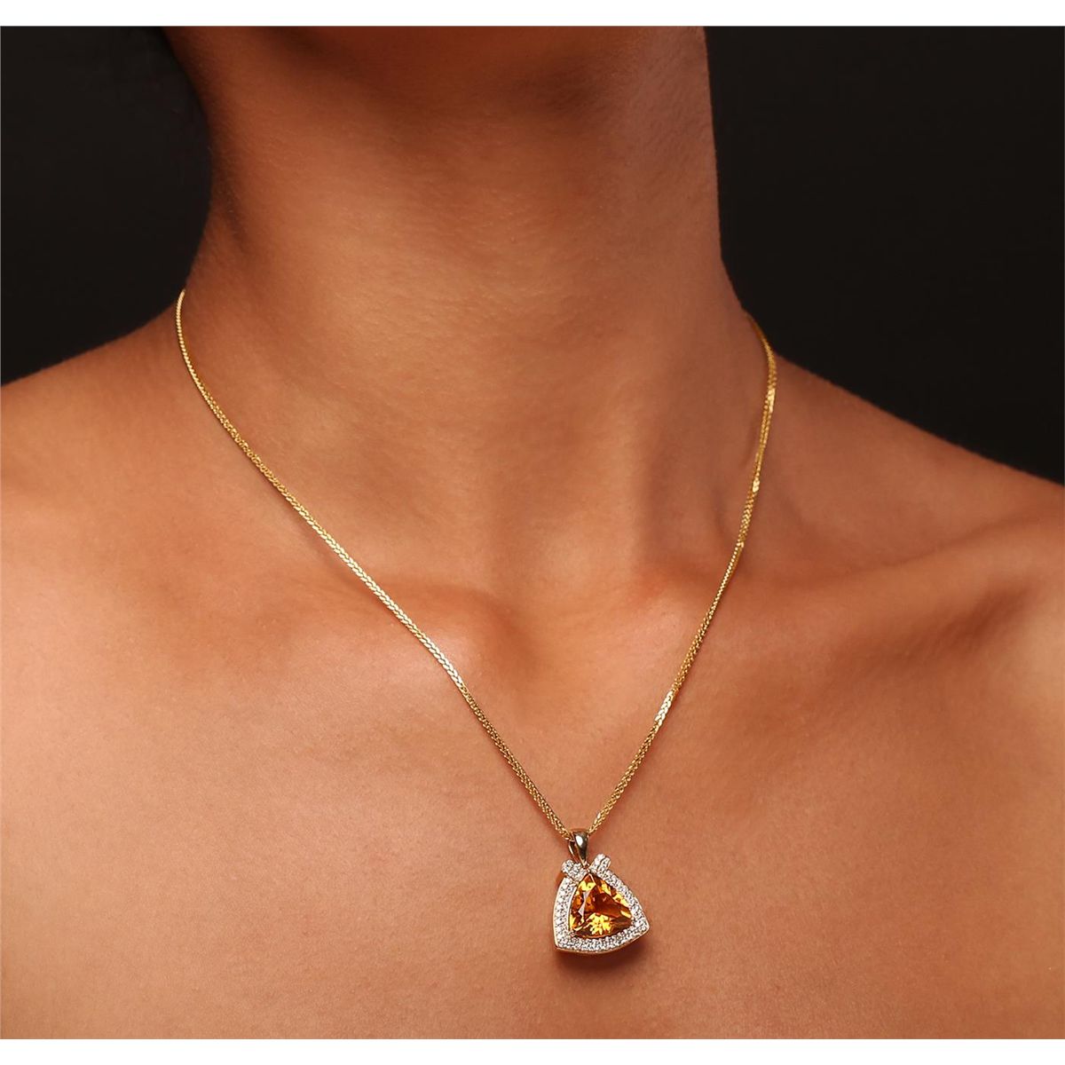 One electronically tested 14KT yellow gold Ladies combination cast & assembled pendant with a bright polish finish. Condition is new. Identified with markings of "14K". Containing: Forty prong set round brilliant cut diamonds, measuring 1.10 - 1.10 x 0.01mm (depth est.) approximate. Total Weight of 40 Stones = 0.20ct. Clarity: I-1. Color: G - H, Cut is Good. Thirty-One prong set round brilliant cut diamonds, measuring 1.30 - 1.30 x 0.78mm (depth est.) approximate. Total Weight of 31 Stones = 0.39ct. Clarity: I-1. Color: G - H, Cut is Good. One prong set triangle modified brilliant cut natural citrine quartz, measuring 13.10 x 13.10 x 7.60mm, exact weight 4.83ct., clarity is eye clean, type I, medium light, moderately strong, orangy yellow color, (GIA oY 4/4), cut is very good. Colored gemstones are presumed to have been subjected to commonly used color/clarity enhancement processes. Total Weight of Colored Stones 4.83ct. Total Weight of Diamonds 0.59ct. Total Weight of Pendant 8.50 grams. GGL Appraised at $4,345.00.