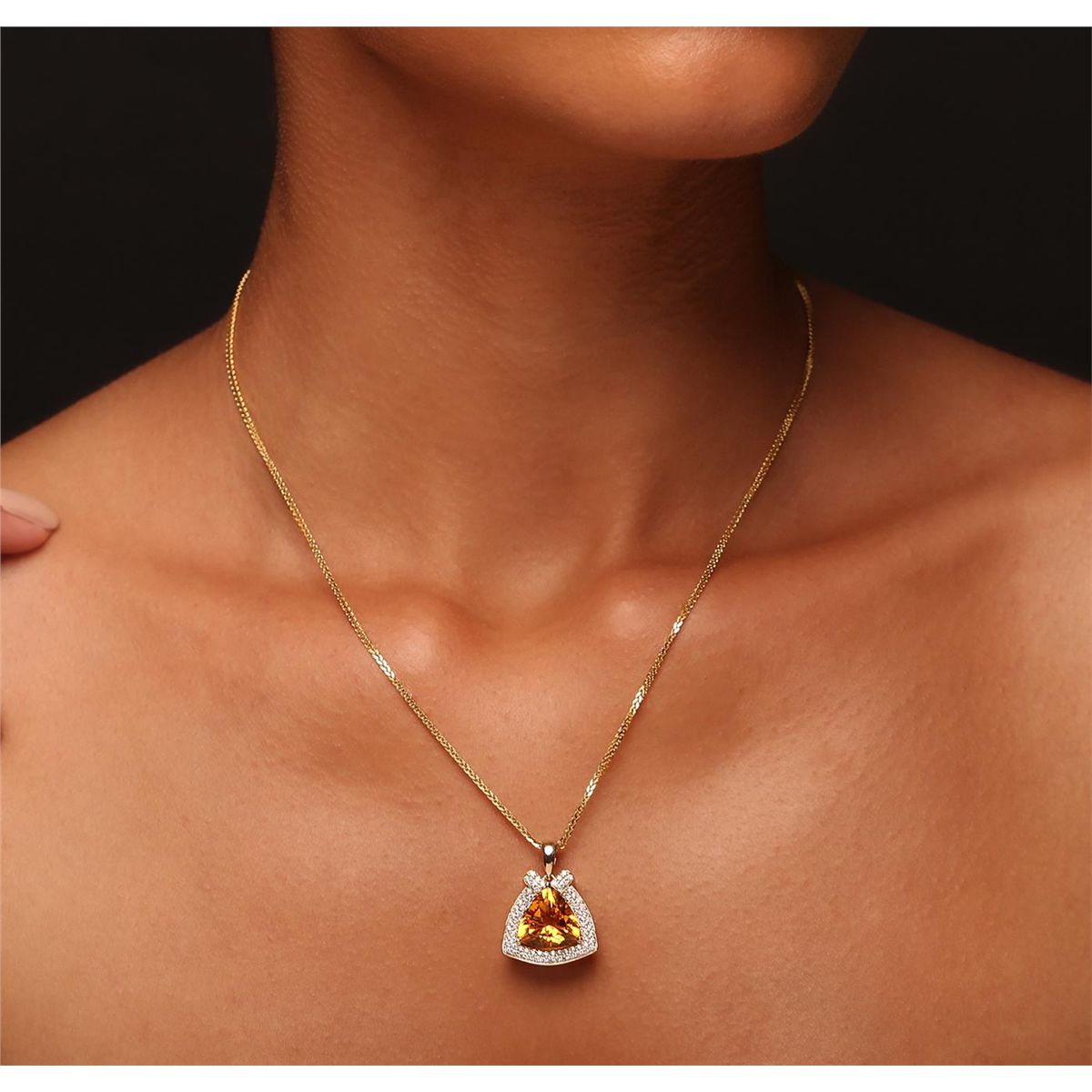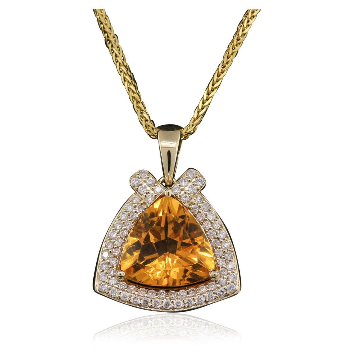 One electronically tested 14KT yellow gold Ladies combination cast & assembled pendant with a bright polish finish. Condition is new. Identified with markings of "14K". Containing: Forty prong set round brilliant cut diamonds, measuring 1.10 - 1.10 x 0.01mm (depth est.) approximate. Total Weight of 40 Stones = 0.20ct. Clarity: I-1. Color: G - H, Cut is Good. Thirty-One prong set round brilliant cut diamonds, measuring 1.30 - 1.30 x 0.78mm (depth est.) approximate. Total Weight of 31 Stones = 0.39ct. Clarity: I-1. Color: G - H, Cut is Good. One prong set triangle modified brilliant cut natural citrine quartz, measuring 13.10 x 13.10 x 7.60mm, exact weight 4.83ct., clarity is eye clean, type I, medium light, moderately strong, orangy yellow color, (GIA oY 4/4), cut is very good. Colored gemstones are presumed to have been subjected to commonly used color/clarity enhancement processes. Total Weight of Colored Stones 4.83ct. Total Weight of Diamonds 0.59ct. Total Weight of Pendant 8.50 grams. GGL Appraised at $4,345.00.