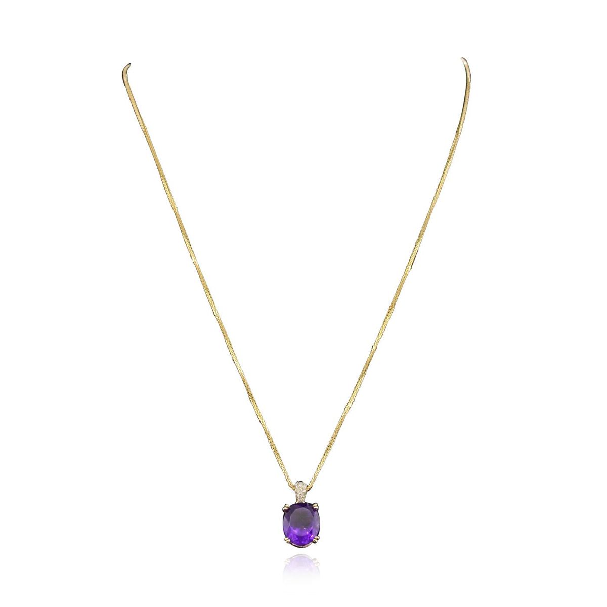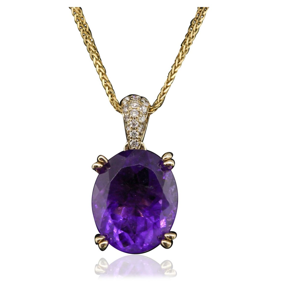One electronically tested 14KT yellow gold ladies cast & assembled amethyst and diamond pendant with chain. Condition is new, good workmanship. The pendant features an amethyst set within a lattice basket, completed by a diamond set bail. The pendant is supported by an eighteen inch length 14KT yellow gold designer style chain, terminating in a lobster claw clasp. Bright polish finish. Identified with markings of "14K". Containing: One prong set oval mixed cut natural amethyst, measuring 12.10 x 9.90 x 6.70mm, 10%. bulge factor, approximate weight of 4.84ct., clarity is moderately included, type II, medium, very slightly grayish, purple color, (GIA P 5/3), cut is good. Transmitting light with a minimum of distortion, transparent. Naturally occurring internal & external characteristics are present. Refractive index testing results of 1.54 to 1.55. This is a conclusive result for quartz (amethyst). Graded in the setting. Seventeen bead set round brilliant cut diamonds, measuring 1.20 - 1.00 x 0.66mm (depth est.) approximate. Total Weight of 17 Stones = 0.18ct. Graded in the setting. Clarity: SI-1 to I-1. Color: G - I. Total Weight of Colored Stones 4.84ct. Total Weight of Diamonds 0.18ct. Total Weight of Pendant With Chain 4.42 grams. AIG Appraised at $1,470.00.
