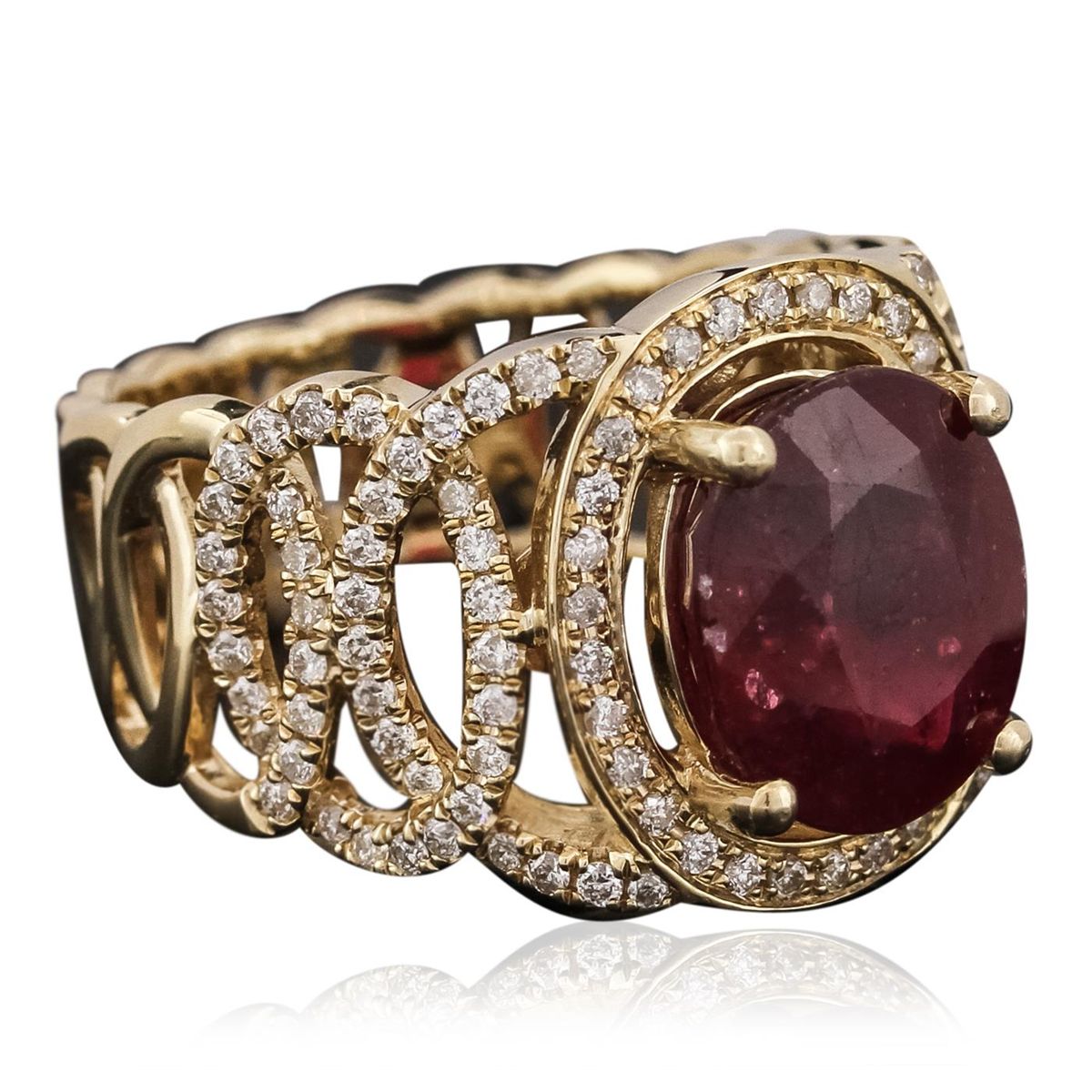 One electronically tested 14KT yellow gold ladies combination cast & assembled ring with a bright polish finish. Identified with markings of "14K". Condition is new. Containing: One prong set oval modified brilliant cut natural ruby, measuring 10.65 x 9.52 x 5.88mm, approximate weight of 4.84ct., clarity is heavily included, type II, medium dark, moderately strong, strongly purplish red color, (GIA stpR 6/4), cut is good. One Hundred Fifteen prong set round brilliant cut diamonds, measuring 1.10 - 1.10 x 0.66mm (depth est.) approximate total weight of 115 Stones = 0.55ct. Clarity: I-1 to I-2. Color: J - K, Cut is Good. Colored gemstones are presumed to have been subjected to commonly used enhancement processes. All diamonds and colored gemstones are graded in the mounting, unless otherwise stated. Total Weight of Colored Stones 4.84ct. Total Weight of Diamonds 0.55ct. Total Weight of Ring 8.60 grams. GGL Appraised at $5,470.00.
