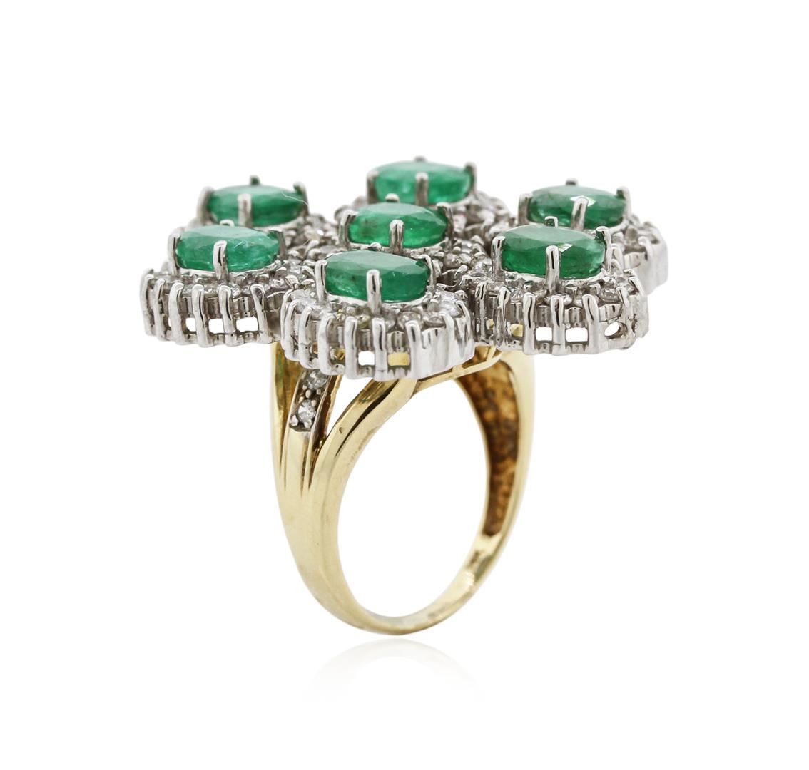 One electronically tested 14KT yellow gold ladies cast emerald and diamond ring with a bright polish finish. Identified with markings of "14K". Condition is very good. Containing: Seven prong set oval modified brilliant cut natural emeralds, measuring 7.00 x 5.20 x 3.38mm, approximate total weight of 4.90ct., clarity is heavily included, type III, medium, very slightly grayish, green color, (GIA G 5/3)One Hundred Twelve prong set round brilliant cut diamonds, measuring 1.50 - 1.50 x 0.90mm (depth est.) approximate total weight of 112 Stones = 1.38ct. Clarity: I-1 to I-2. Color: I - J. Colored gemstones are presumed to have been subjected to commonly used enhancement processes. All diamonds and colored gemstones are graded in the mounting, unless otherwise stated. Total Weight of Colored Stones 4.90ct. Total Weight of Diamonds 1.38ct. Total Weight of Ring 14.30 grams. GGL Appraised at $4,665.00.
