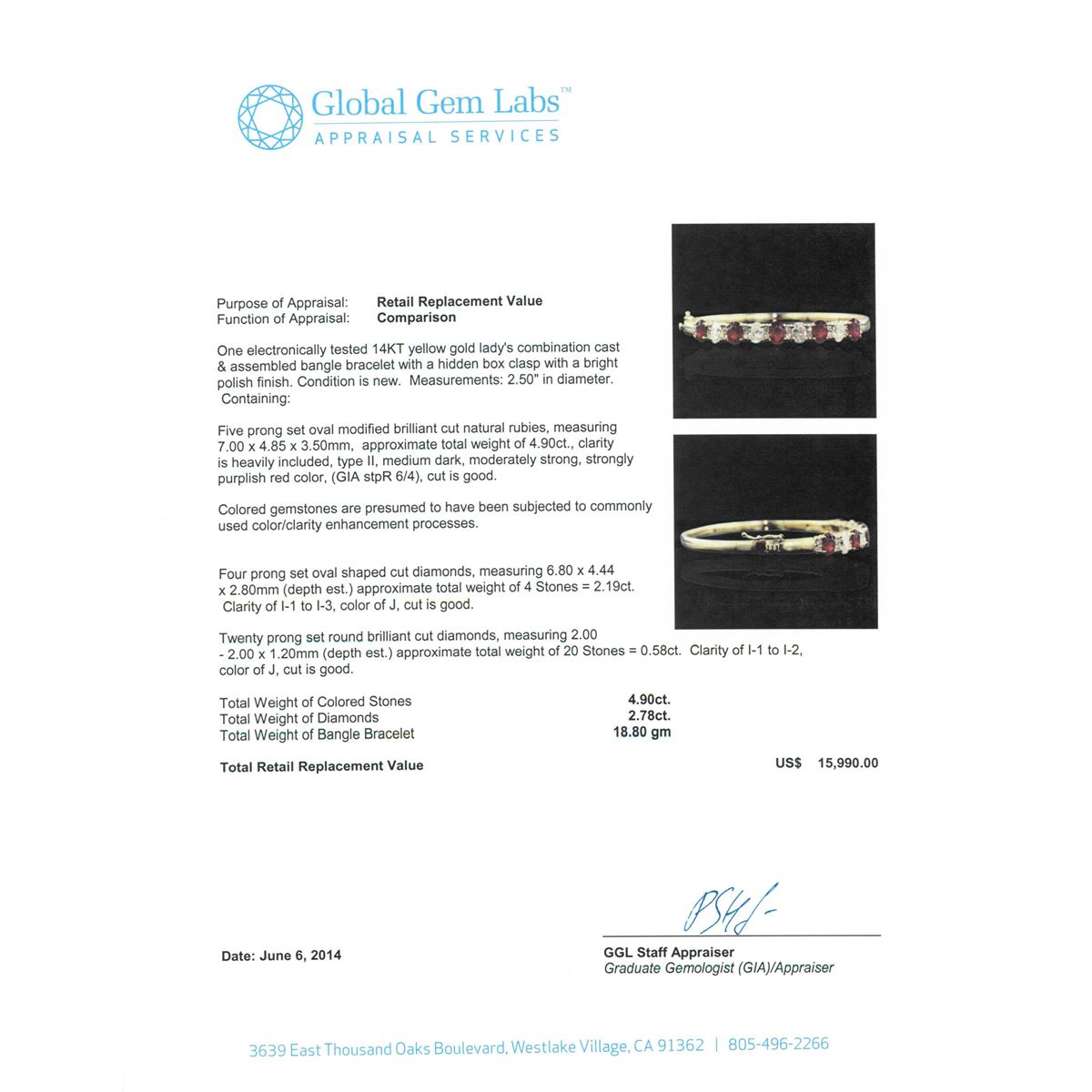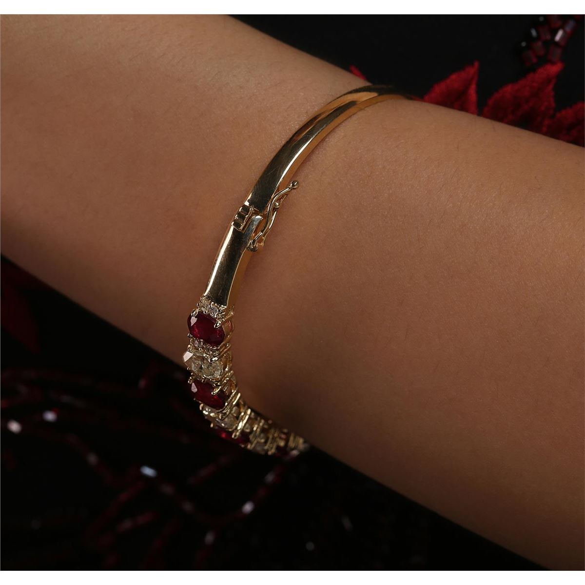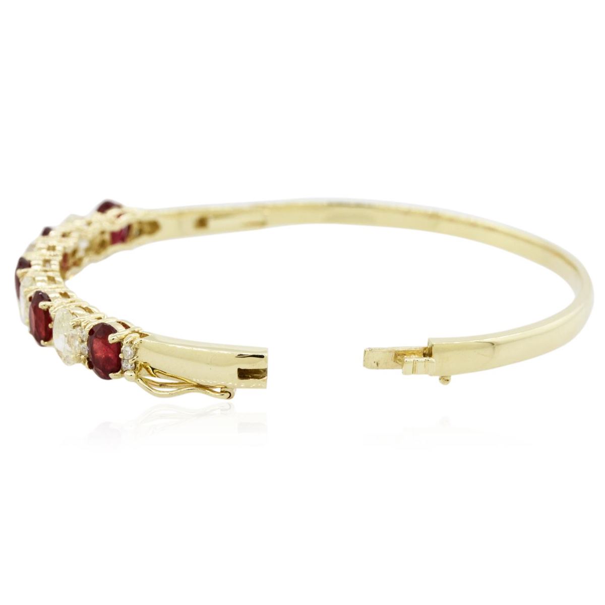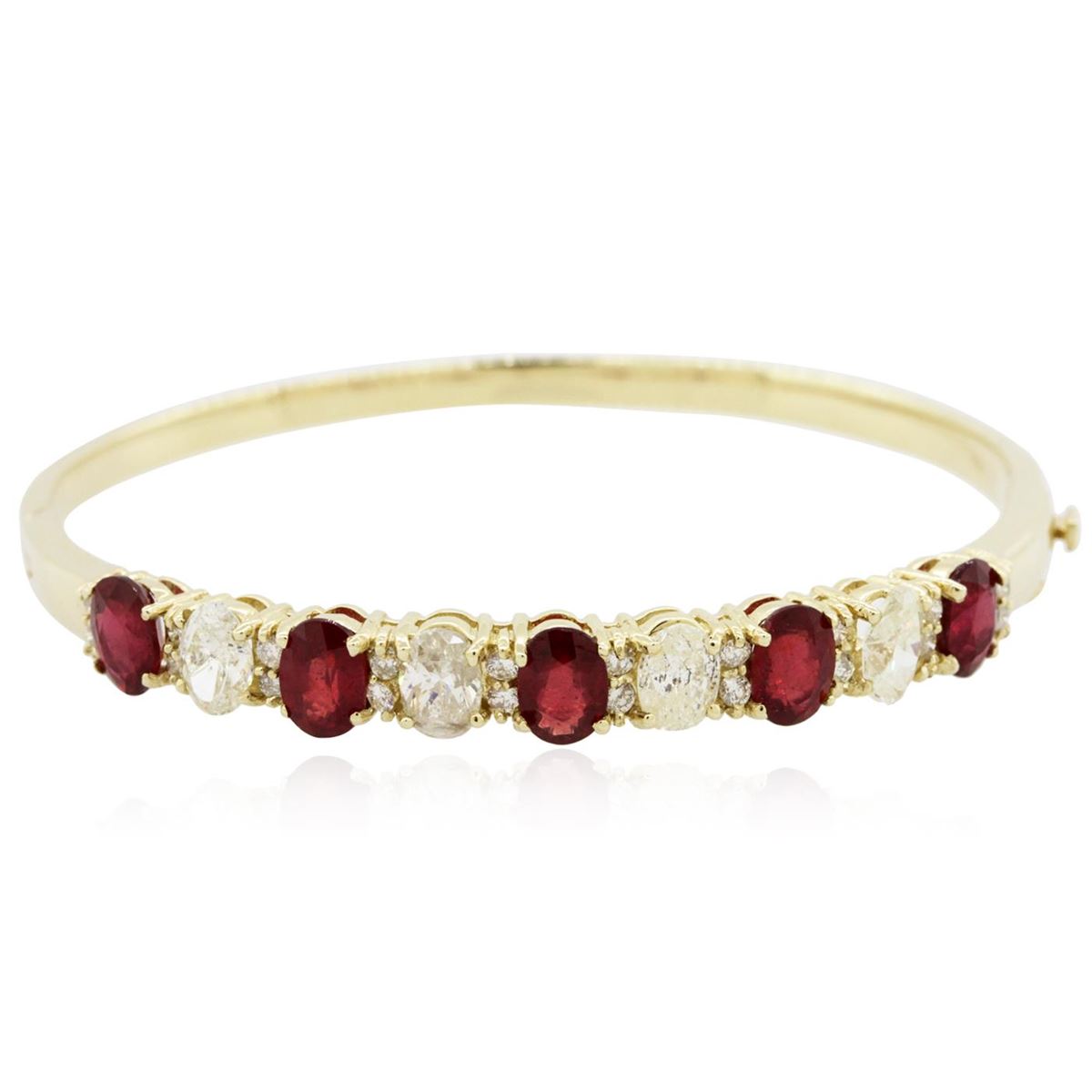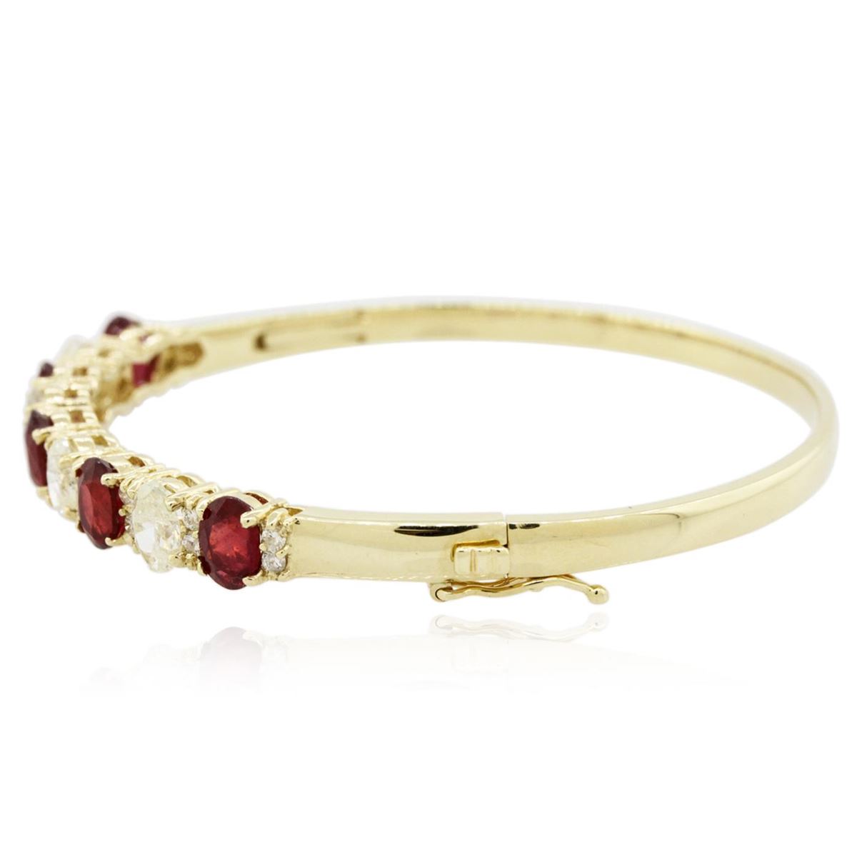 One electronically tested 14KT yellow gold Ladies combination cast & assembled bangle bracelet with a hidden box clasp with a bright polish finish. Condition is new. Measurements: 2.50" in diameter. Containing: Five prong set oval modified brilliant cut natural rubies, measuring 7.00 x 4.85 x 3.50mm, approximate. Total Weight of 4.90ct., clarity is heavily included, type II, medium dark, moderately strong, strongly purplish red color, (GIA stpR 6/4), cut is good. Colored gemstones are presumed to have been subjected to commonly used color/clarity enhancement processes. Four prong set oval shaped cut diamonds, measuring 6.80 x 4.44 x 2.80mm (depth est.) approximate. Total Weight of 4 Stones = 2.19ct. Clarity: I-1 to I-3. Color: J, Cut is Good. Twenty prong set round brilliant cut diamonds, measuring 2.00 - 2.00 x 1.20mm (depth est.) approximate. Total Weight of 20 Stones = 0.58ct. Clarity: I-1 to I-2. Color: J, Cut is Good. Total Weight of Colored Stones 4.90ct. Total Weight of Diamonds 2.78ct. Total Weight of Bangle Bracelet 18.80 grams. GGL Appraised at $15,990.00.
