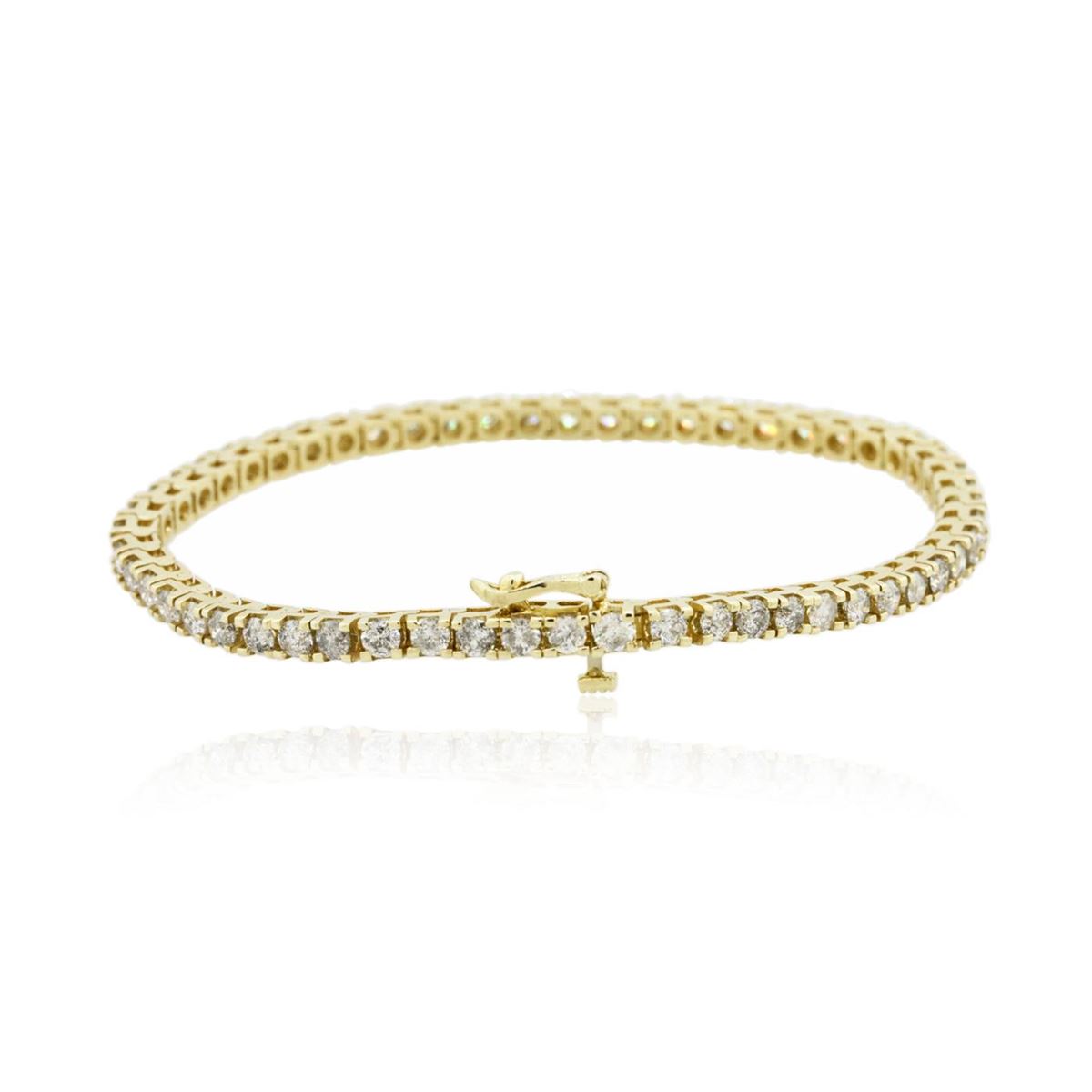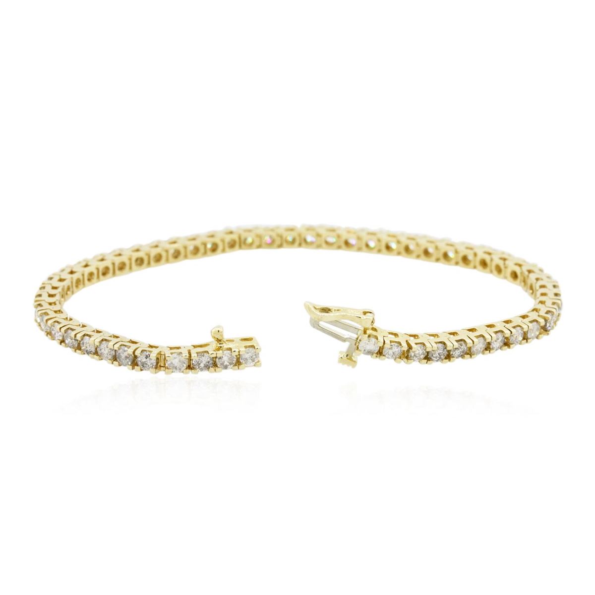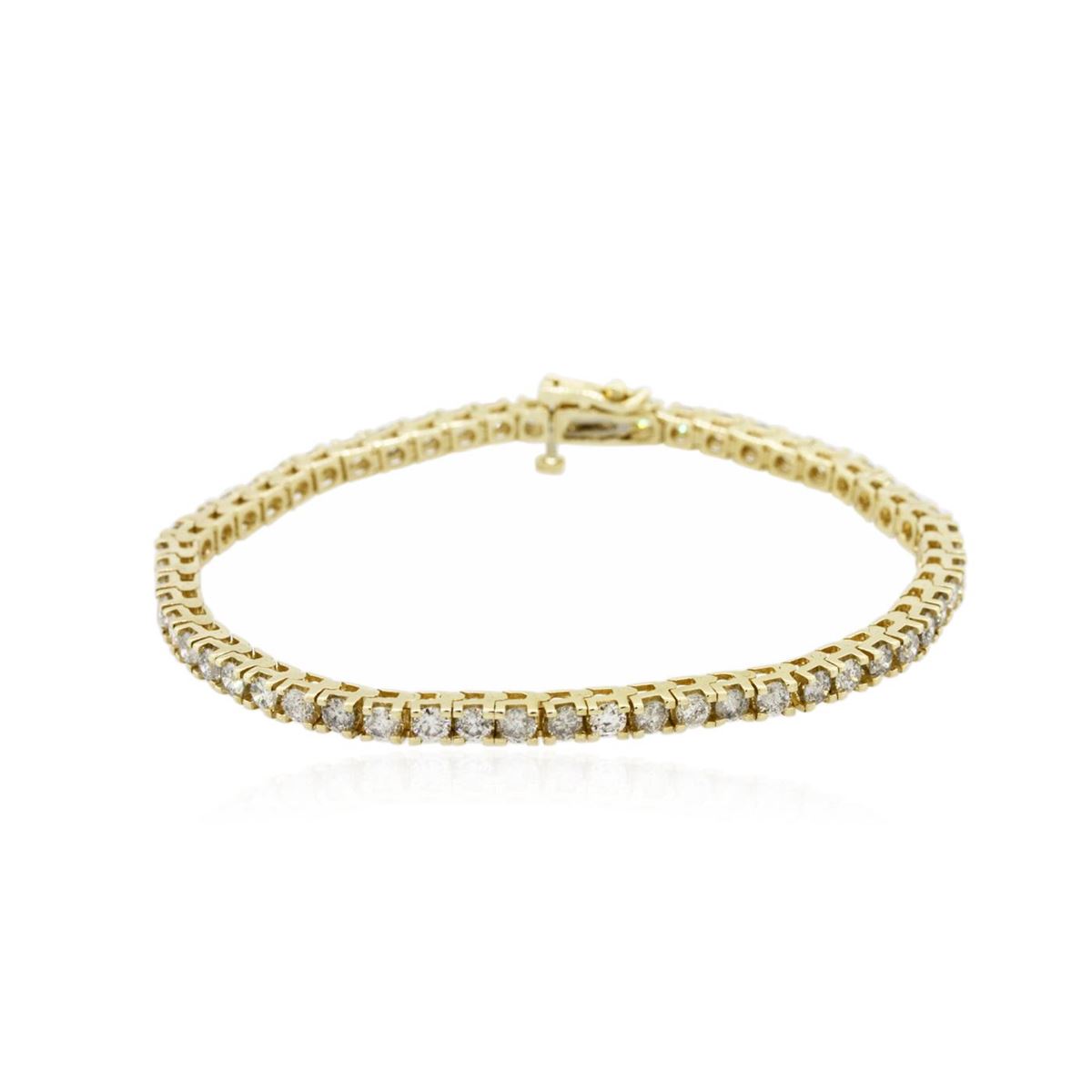 One electronically tested 14KT yellow gold Ladies combination cast & assembled tennis bracelet with a hidden box clasp with a bright polish finish. Condition is new. Measurements: 7" in length. Identified with markings of "14K". Containing: Fifty-Five prong set round brilliant cut diamonds, measuring 2.90 - 2.90 x 1.74mm (depth est.) approximate. Total Weight of 55 Stones = 4.91ct. Clarity: I-2 to I-3. Color: H - I, Cut is Good. Total Weight of Diamonds 4.91ct. Total Weight of Bracelet 12.50 grams. GGL Appraised at $11,230.00.