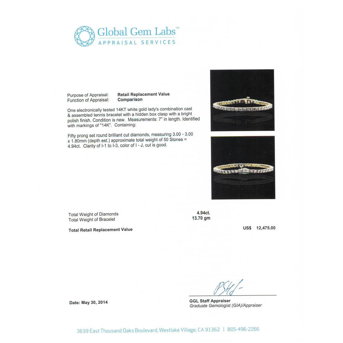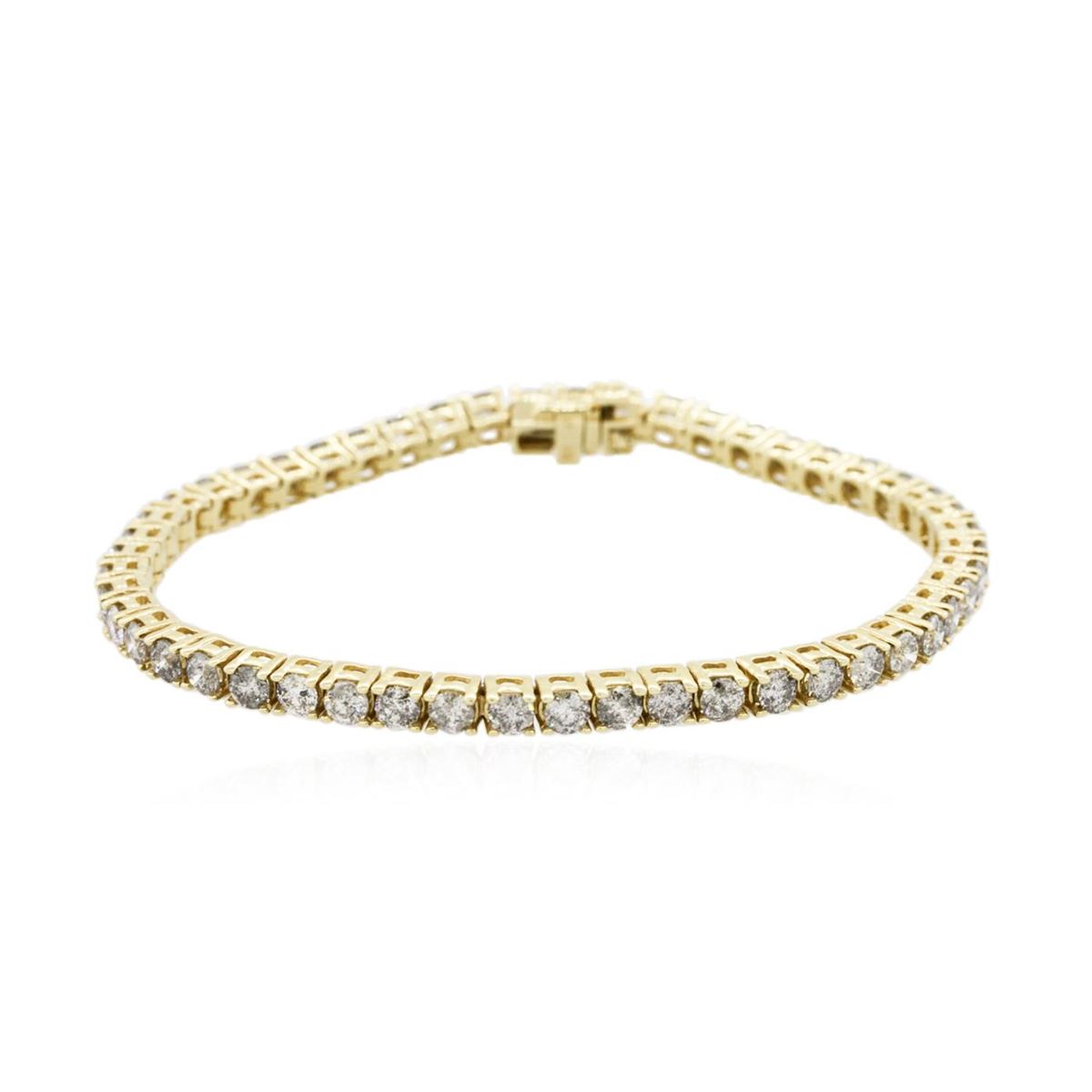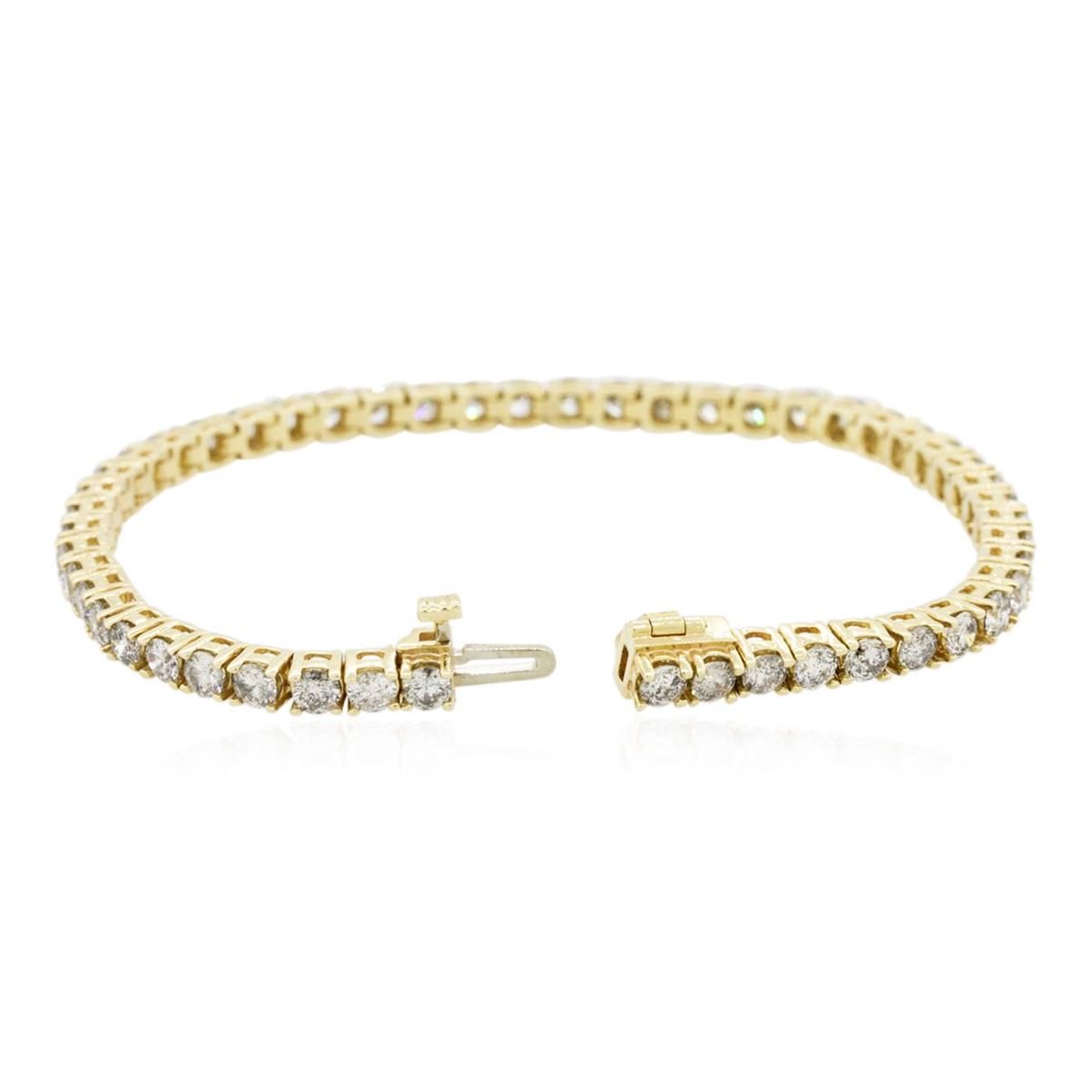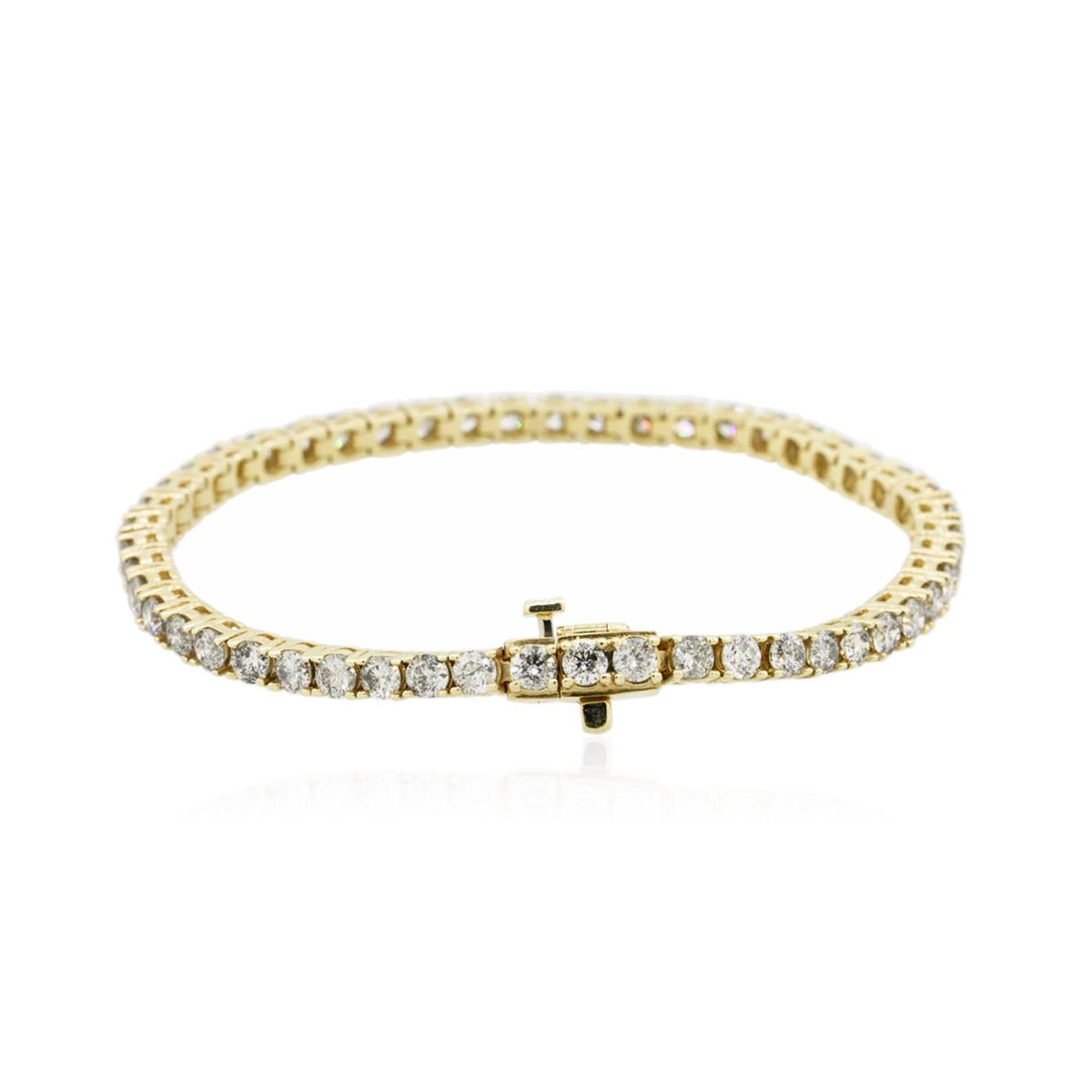 One electronically tested 14KT yellow gold Ladies combination cast & assembled tennis bracelet with a hidden box clasp with a bright polish finish. Condition is new. Measurements: 7" in length. Identified with markings of "14K". Containing: Fifty prong set round brilliant cut diamonds, measuring 3.00 - 3.00 x 1.80mm (depth est.) approximate. Total Weight of 50 Stones = 4.94ct. Clarity: I-1 to I-3. Color: I - J, Cut is Good. Total Weight of Diamonds 4.94ct. Total Weight of Bracelet 13.70 grams. GGL Appraised at $12,475.00.