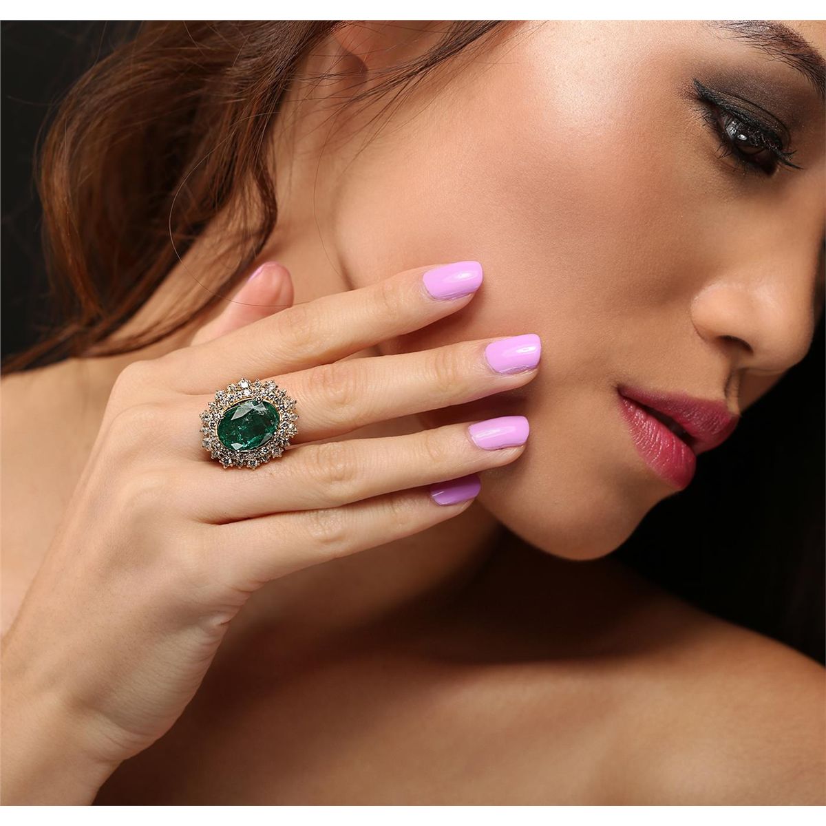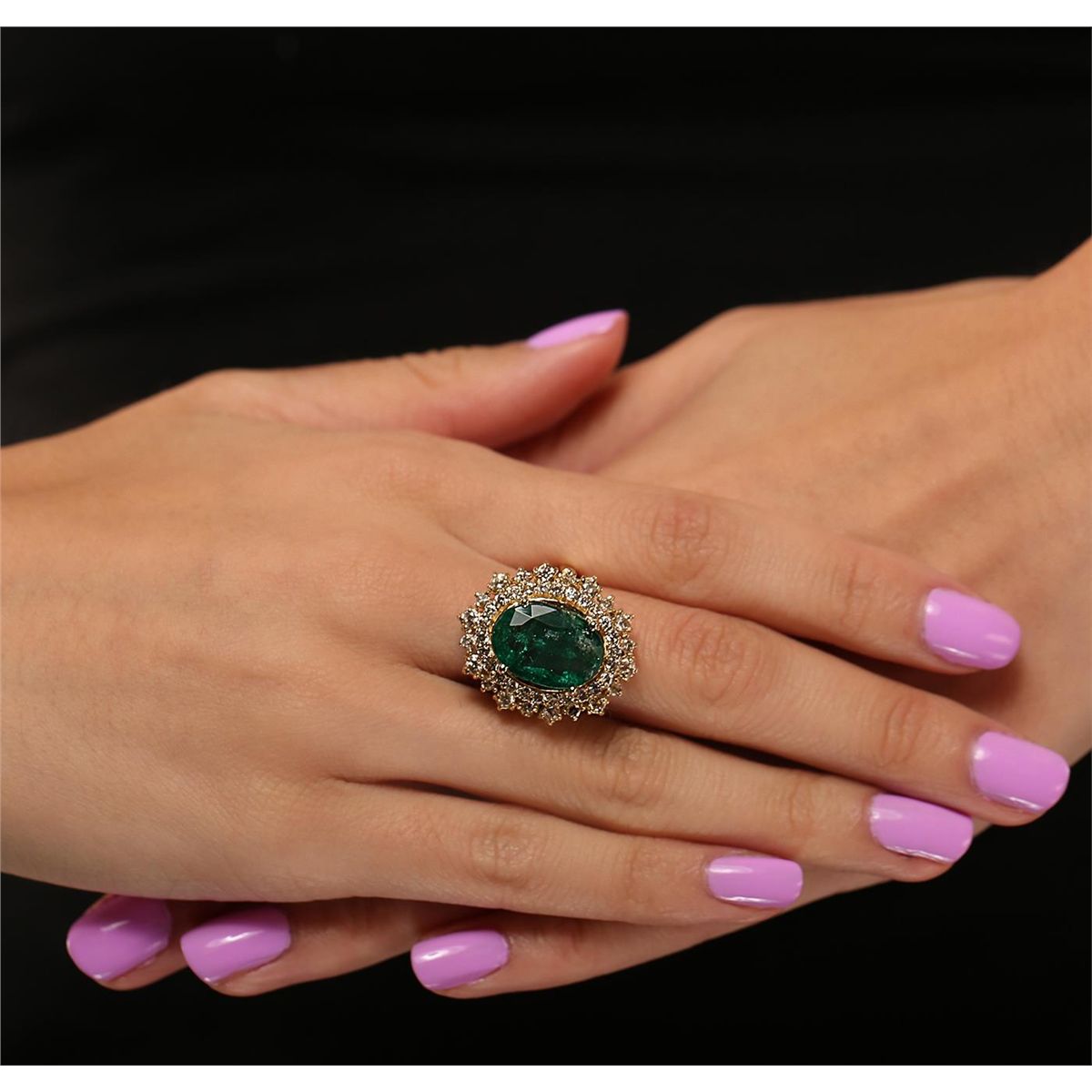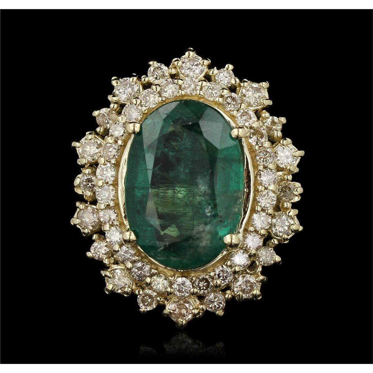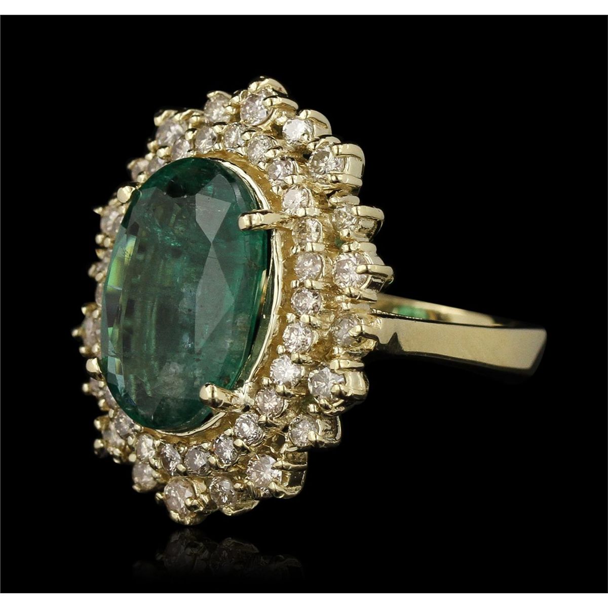 One electronically tested 14KT yellow gold ladies cast emerald and diamond ring with a bright polish finish. The featured emerald is set within stylized diamond bezels supported by tapering shoulders, completed by a two and one-half millimeter wide band. Identified with markings of "14K". Condition is new, good workmanship. Containing: One prong set oval mixed cut natural emerald, measuring 14.80 x 10.30 x 5.45mm, 6%. bulge factor, approximate weight of 4.95ct., clarity is heavily included, type III, medium dark, moderately strong, very slightly bluish green color, (GIA vslbG 6/4), cut is good. Transmitting light with a minimum of distortion, transparent. Naturally occurring internal & external characteristics are present. Indications of oil & opticon residue. Graded in the setting. Ten prong set round brilliant cut diamonds, measuring 2.20 - 2.10 x 1.29mm (depth est.) approximate. Total Weight of 10 Stones = 0.46ct. Graded in the setting. Clarity: SI-2 to I-1 . Color: J - K Thirty-Six prong set round brilliant cut diamonds, measuring 1.90 - 1.80 x 1.11mm (depth est.) approximate. Total Weight of 36 Stones = 0.93ct. Graded in the setting. Clarity: SI-1 to I-1 . Color: I - K. Total Weight of Colored Stones 4.95ct. Total Weight of Diamonds 1.39ct. AIG Appraised at $12,775.00.