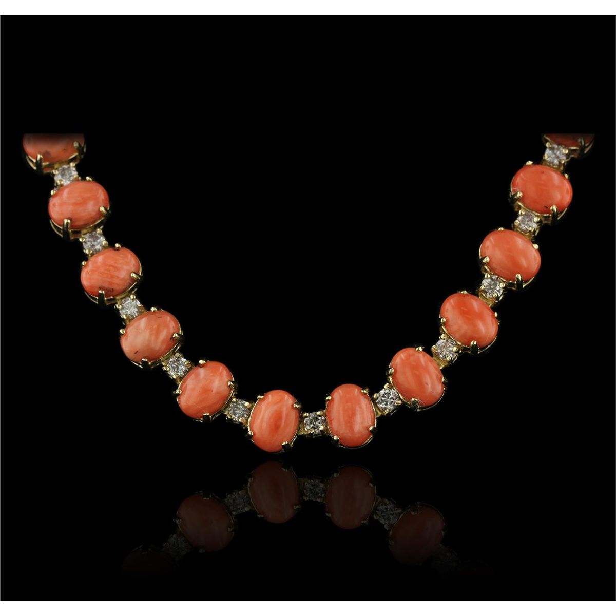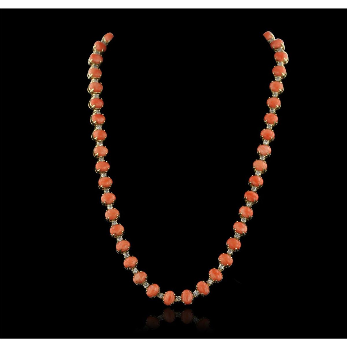 One electronically tested 14KT yellow gold Ladies combination cast & assembled necklace with a tongue clasp with foldover safety with a bright polish finish. Condition is new. Measurements: 18" in length. Identified with markings of "14K". Containing: Forty-seven prong set oval cabochon cut natural pink corals, measuring 8.00 x 6.00 x 2.50mm, approximate. Total Weight of 40.42ct., clarity is heavily included, medium, moderately strong, pink color, (GIA Pk 5/4), cut is good. Colored gemstones are presumed to have been subjected to commonly used color/clarity enhancement processes. Forty-Seven prong set round brilliant cut diamonds, measuring 2.90 - 2.90 x 1.74mm (depth est.) approximate. Total Weight of 47 Stones = 4.19ct. Clarity: I-2 to I-3. Color: G - H, Cut is Good. Total Weight of Colored Stones 40.42ct. Total Weight of Diamonds 4.19ct. Total Weight of Necklace 55.80 grams. GGL Appraised at $40,745.00.