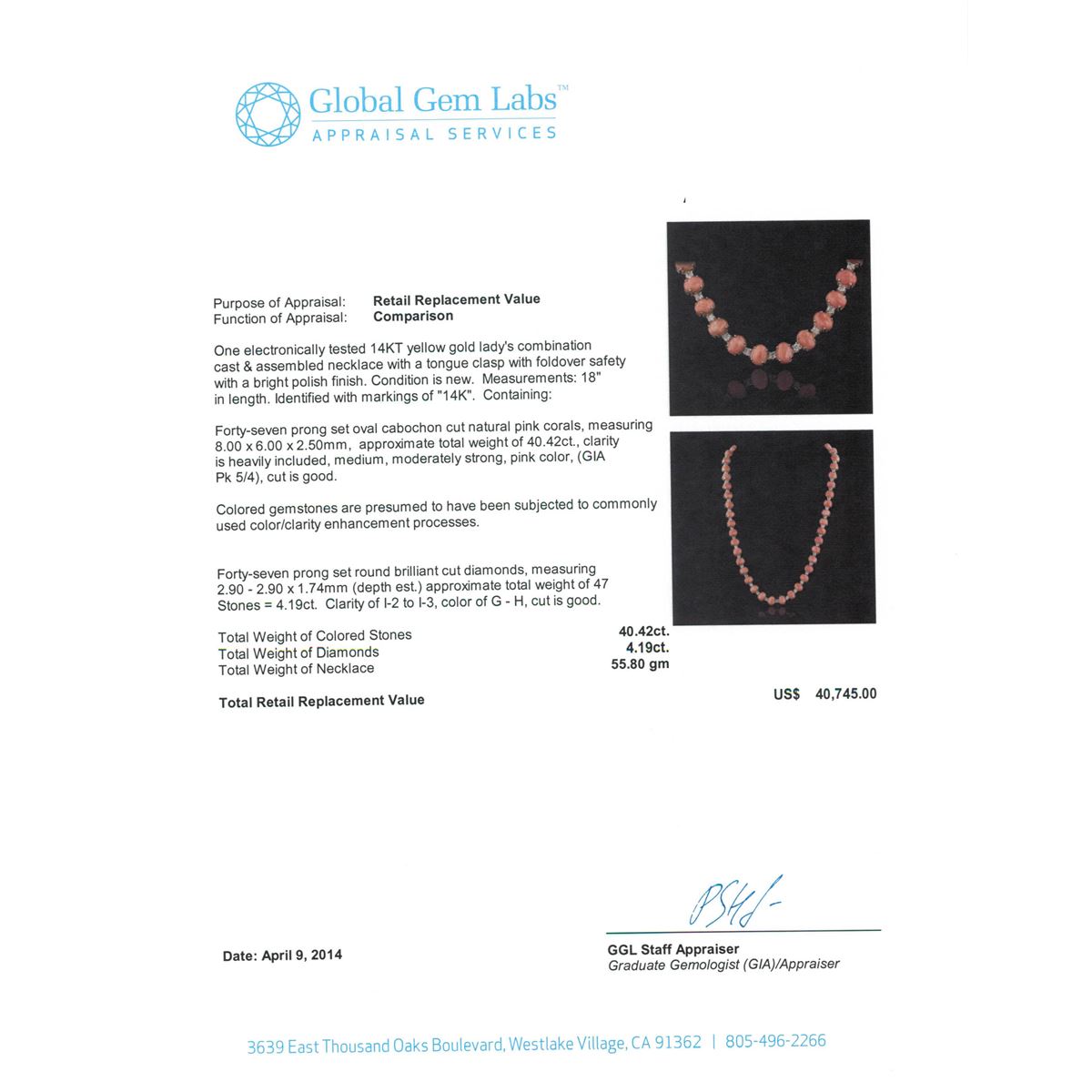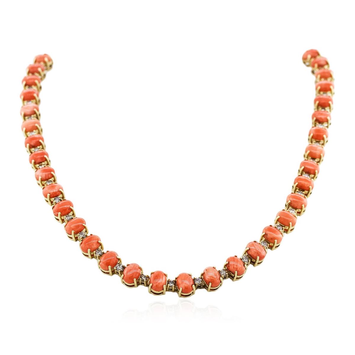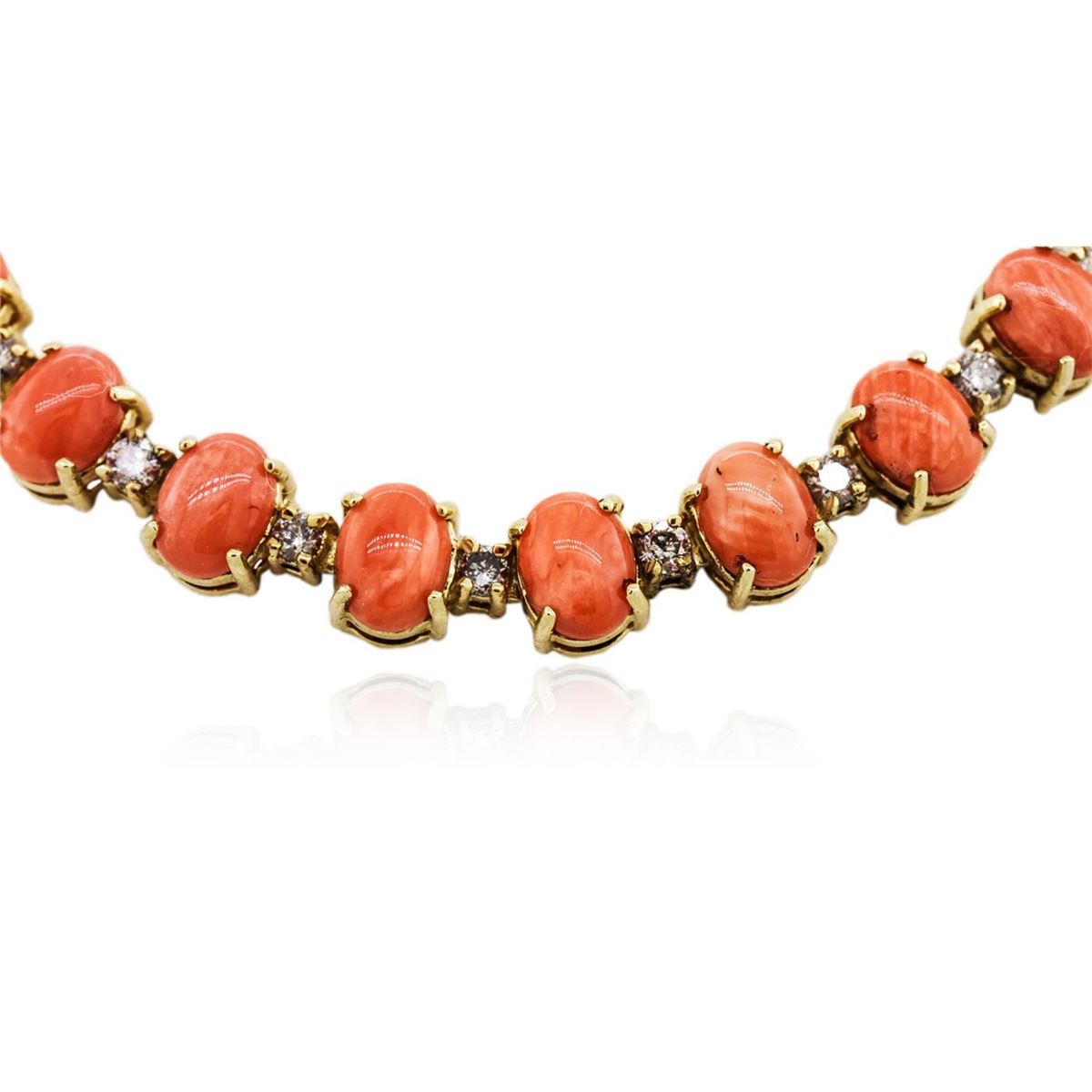 One electronically tested 14KT yellow gold Ladies combination cast & assembled necklace with a tongue clasp with foldover safety with a bright polish finish. Condition is new. Measurements: 18" in length. Identified with markings of "14K". Containing: Forty-seven prong set oval cabochon cut natural pink corals, measuring 8.00 x 6.00 x 2.50mm, approximate. Total Weight of 40.42ct., clarity is heavily included, medium, moderately strong, pink color, (GIA Pk 5/4), cut is good. Colored gemstones are presumed to have been subjected to commonly used color/clarity enhancement processes. Forty-Seven prong set round brilliant cut diamonds, measuring 2.90 - 2.90 x 1.74mm (depth est.) approximate. Total Weight of 47 Stones = 4.19ct. Clarity: I-2 to I-3. Color: G - H, Cut is Good. Total Weight of Colored Stones 40.42ct. Total Weight of Diamonds 4.19ct. Total Weight of Necklace 55.80 grams. GGL Appraised at $40,745.00.