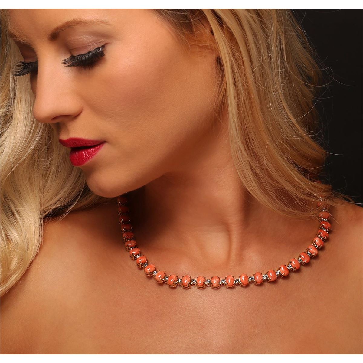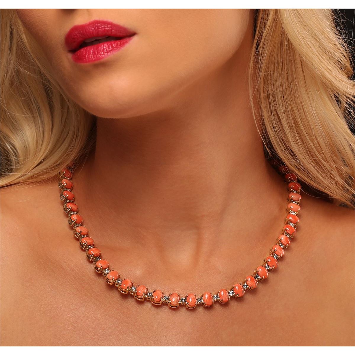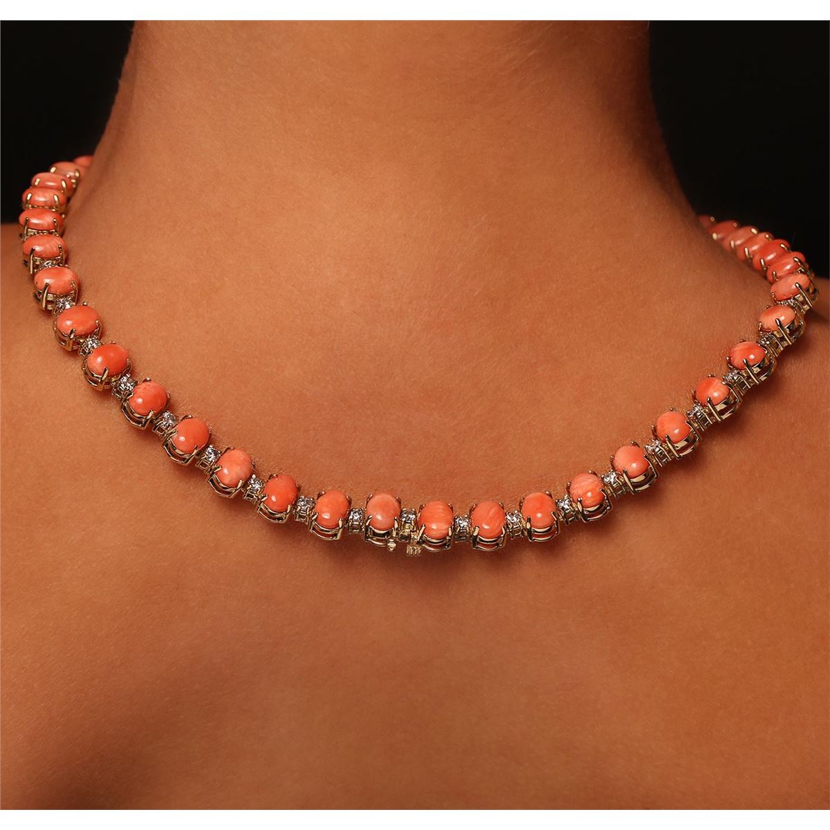 One electronically tested 14KT yellow gold Ladies combination cast & assembled necklace with a tongue clasp with foldover safety with a bright polish finish. Condition is new. Measurements: 18" in length. Identified with markings of "14K". Containing: Forty-seven prong set oval cabochon cut natural pink corals, measuring 8.00 x 6.00 x 2.50mm, approximate. Total Weight of 40.42ct., clarity is heavily included, medium, moderately strong, pink color, (GIA Pk 5/4), cut is good. Colored gemstones are presumed to have been subjected to commonly used color/clarity enhancement processes. Forty-Seven prong set round brilliant cut diamonds, measuring 2.90 - 2.90 x 1.74mm (depth est.) approximate. Total Weight of 47 Stones = 4.19ct. Clarity: I-2 to I-3. Color: G - H, Cut is Good. Total Weight of Colored Stones 40.42ct. Total Weight of Diamonds 4.19ct. Total Weight of Necklace 55.80 grams. GGL Appraised at $40,745.00.