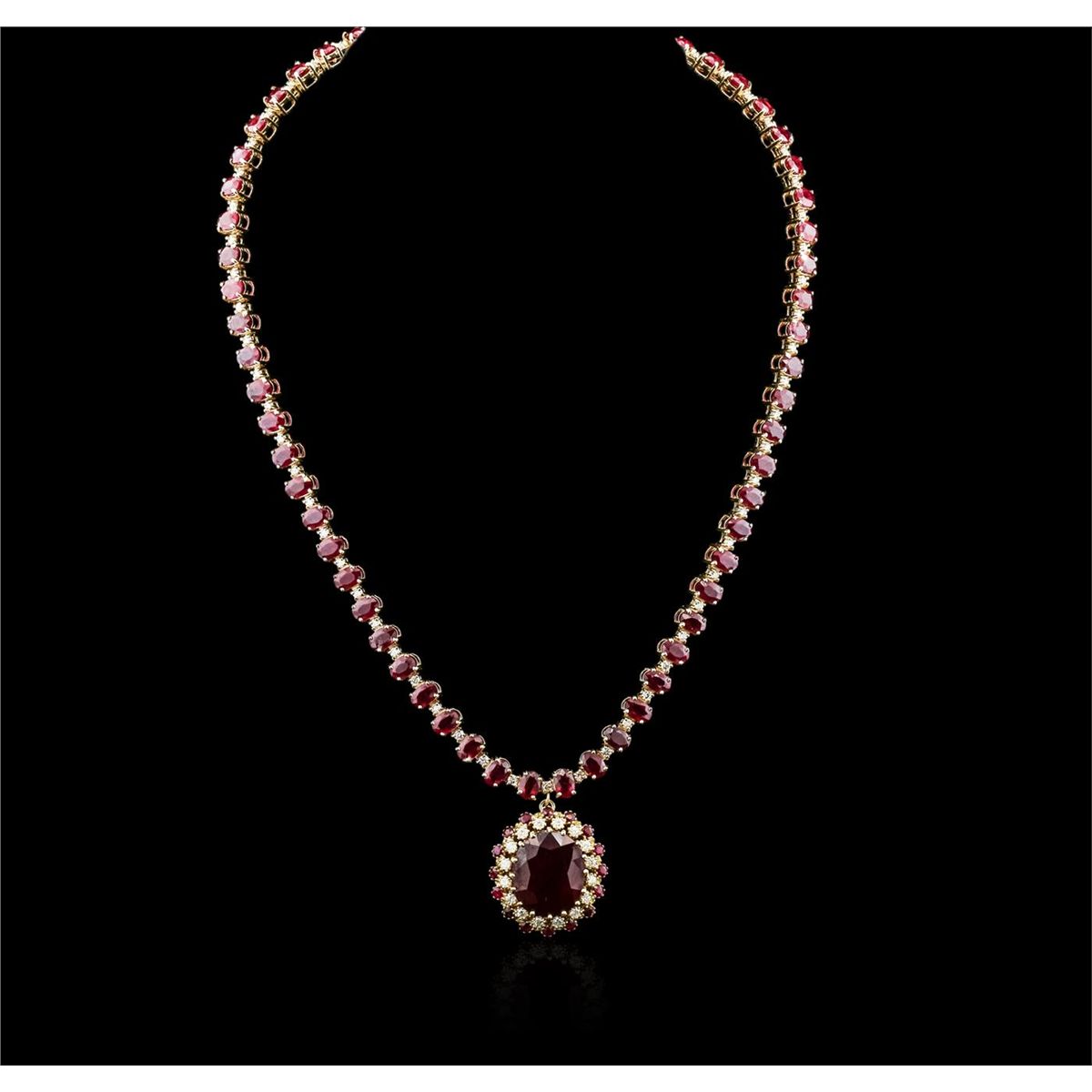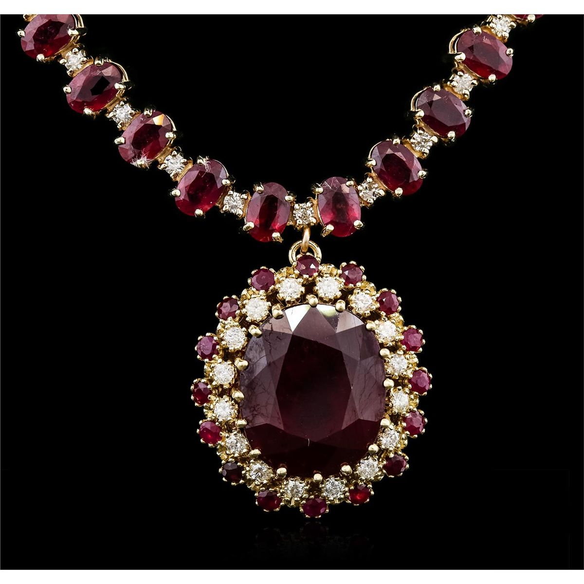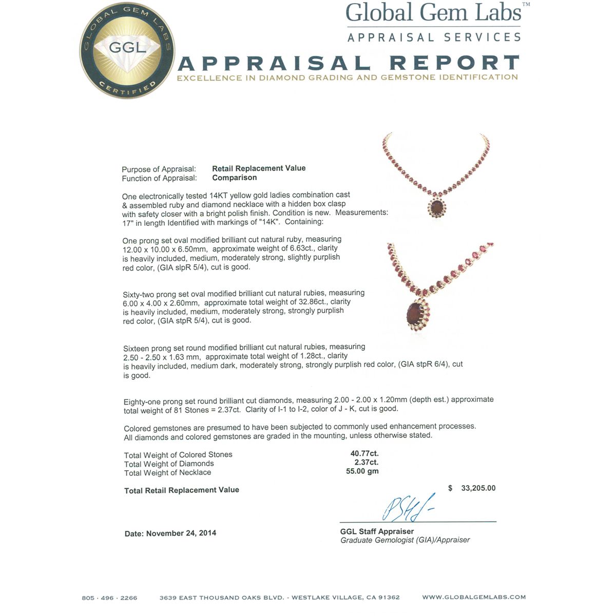 One electronically tested 14KT yellow gold ladies combination cast & assembled ruby and diamond necklace with a hidden box clasp with safety closer with a bright polish finish. Measurements: 17" in length Identified with markings of "14K". Condition is new. Containing: One prong set oval modified brilliant cut natural ruby, measuring 12.00 x 10.00 x 6.50mm, approximate weight of 6.63ct., clarity is heavily included, medium, moderately strong, slightly purplish red color, (GIA slpR 5/4), cut is good. Sixty-two prong set oval modified brilliant cut natural rubies, measuring 6.00 x 4.00 x 2.60mm, approximate total weight of 32.86ct., clarity is heavily included, medium, moderately strong, strongly purplish red color, (GIA stpR 5/4), cut is good. Sixteen prong set round modified brilliant cut natural rubies, measuring 2.50 - 2.50 x 1.63 mm, approximate total weight of 1.28ct., clarity is heavily included, medium dark, moderately strong, strongly purplish red color, (GIA stpR 6/4), cut is good. Eighty-One prong set round brilliant cut diamonds, measuring 2.00 - 2.00 x 1.20mm (depth est.) approximate total weight of 81 Stones = 2.37ct. Clarity: I-1 to I-2. Color: J - K, Cut is Good. Colored gemstones are presumed to have been subjected to commonly used enhancement processes. All diamonds and colored gemstones are graded in the mounting, unless otherwise stated. Total Weight of Colored Stones 40.77ct. Total Weight of Diamonds 2.37ct. Total Weight of Necklace 55.00 grams. GGL Appraised at $33,205.00.