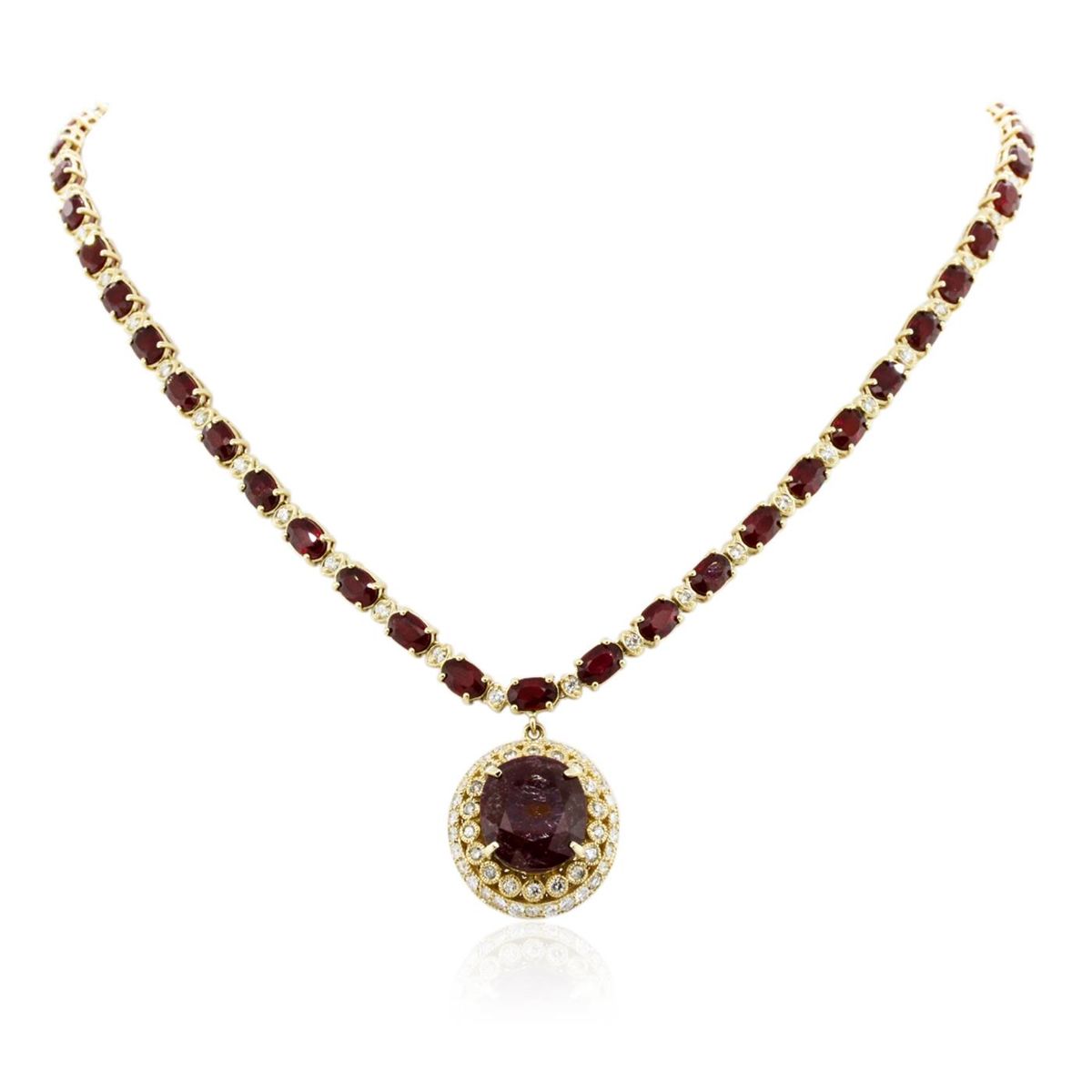 One electronically tested 14KT yellow gold ladies cast & assembled ruby and diamond necklace. Seventeen and one-half inch length necklace features a ruby and diamond pendant supported by a flexible ruby and diamond ribbon, terminating in a concealed clasp with safety. Bright polish finish with milgrain detailing. Identified with markings of "14K". Condition is new, good workmanship. Containing: One prong set oval mixed cut natural ruby, measuring 15.00. x 13.50 x 7.25mm, 8%. bulge factor, approximate weight of 12.72ct., clarity is heavily included, type II, dark, very slightly brownish, slightly purplish red color, (GIA slpR 7/3), cut is good. Transmitting light somewhat diffusely, transparent to translucent. Naturally occurring internal & external characteristics are present. Indications of laboratory high temperature heat treatment, with glass & flux additives. Graded in the setting. Forty-six prong set oval mixed cut natural rubies, measuring 6.00. x 4.00. x 2.90mm, 6%. bulge factor, approximate total weight of 28.06ct., clarity is heavily included, type II, medium dark, very slightly brownish, slightly purplish red color, (GIA slpR 6/3), cut is good. Transmitting light somewhat diffusely, transparent to translucent. Naturally occurring internal & external characteristics are present. Indications of laboratory high temperature heat treatment, with glass & flux additives. Measurements & the color grade are an average for the group. Graded in the setting. Ruby has a low tolerance to rhodium plating, repolishing the surface, & ultrasonic cleaning. Ninety-Four bezel and prong set round brilliant cut diamonds, measuring 2.10 - 2.00. x 1.23mm (depth est.) approximate total weight of 94 Stones = 3.06ct. Graded in the setting. Clarity: SI-1 to I-1 . Color: G - I. Total Weight of Colored Stones 40.78ct. Total Weight of Diamonds 3.06ct. Total Weight of Necklace 32.32 grams. AIG Appraised at $19,490.00.