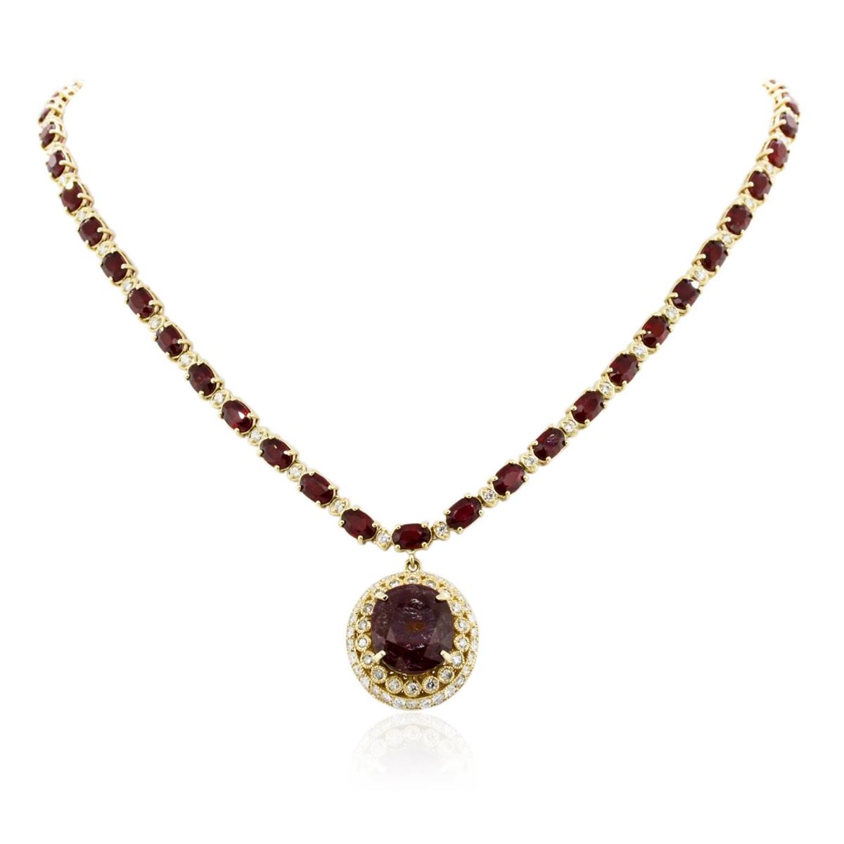 One electronically tested 14KT yellow gold ladies cast & assembled ruby and diamond necklace. Seventeen and one-half inch length necklace features a ruby and diamond pendant supported by a flexible ruby and diamond ribbon, terminating in a concealed clasp with safety. Bright polish finish with milgrain detailing. Identified with markings of "14K". Condition is new, good workmanship. Containing: One prong set oval mixed cut natural ruby, measuring 15.00. x 13.50 x 7.25mm, 8%. bulge factor, approximate weight of 12.72ct., clarity is heavily included, type II, dark, very slightly brownish, slightly purplish red color, (GIA slpR 7/3), cut is good. Transmitting light somewhat diffusely, transparent to translucent. Naturally occurring internal & external characteristics are present. Indications of laboratory high temperature heat treatment, with glass & flux additives. Graded in the setting. Forty-six prong set oval mixed cut natural rubies, measuring 6.00. x 4.00. x 2.90mm, 6%. bulge factor, approximate total weight of 28.06ct., clarity is heavily included, type II, medium dark, very slightly brownish, slightly purplish red color, (GIA slpR 6/3), cut is good. Transmitting light somewhat diffusely, transparent to translucent. Naturally occurring internal & external characteristics are present. Indications of laboratory high temperature heat treatment, with glass & flux additives. Measurements & the color grade are an average for the group. Graded in the setting. Ruby has a low tolerance to rhodium plating, repolishing the surface, & ultrasonic cleaning. Ninety-Four bezel and prong set round brilliant cut diamonds, measuring 2.10 - 2.00. x 1.23mm (depth est.) approximate total weight of 94 Stones = 3.06ct. Graded in the setting. Clarity: SI-1 to I-1 . Color: G - I. Total Weight of Colored Stones 40.78ct. Total Weight of Diamonds 3.06ct. Total Weight of Necklace 32.32 grams. AIG Appraised at $19,490.00.