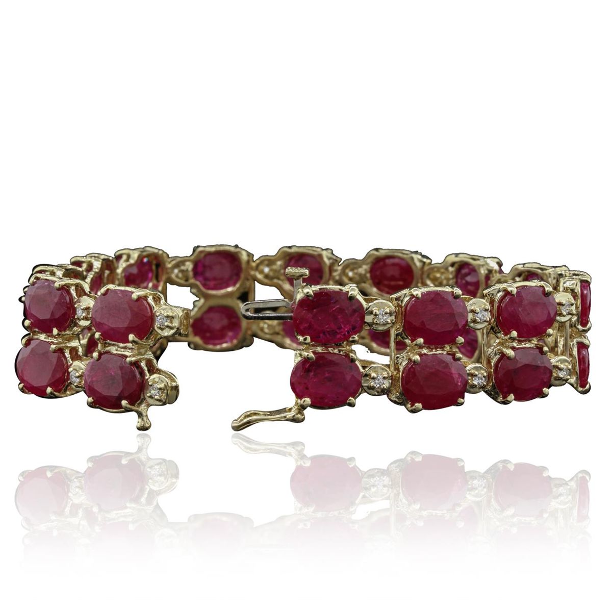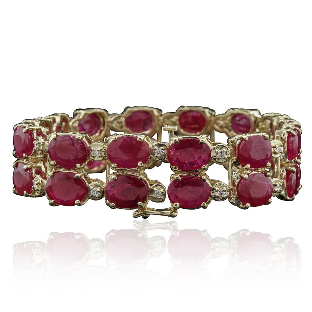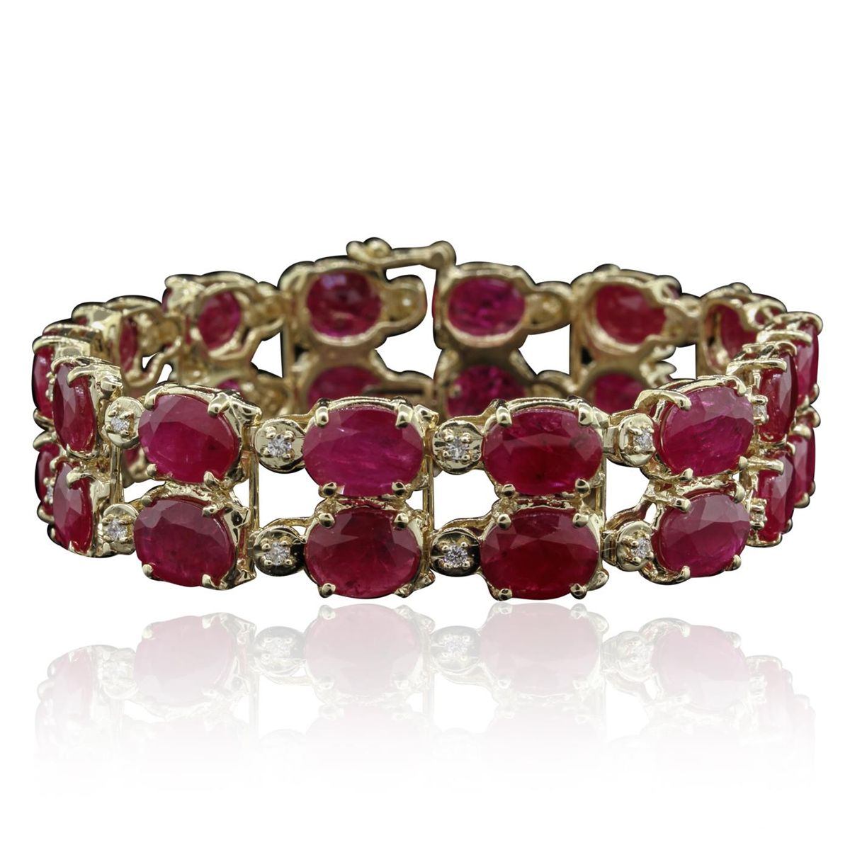 One electronically tested 14KT yellow gold Ladies combination cast & assembled bracelet with a hidden box clasp with a bright polish finish. Measurements: 7.25" in length. Identified with markings of "14K". Condition is new. Containing: Twenty-eight prong set oval modified brilliant cut natural rubies, measuring 9.00 x 6.50 x 3.11mm, approximate total weight of 41.72ct., clarity is heavily included, type II, medium dark, moderately strong, strongly purplish red color, (GIA stpR 6/4), cut is good. Indications of heat treatment with glass and flux residue. Colored gemstones are presumed to have been subjected to commonly used and possible undetectable color/clarity enhancement processes. Twenty-Eight prong set round brilliant cut diamonds, measuring 2.10 - 2.10 x 1.26mm (depth est.) approximate total weight of 28 Stones = 0.95ct. Clarity of SI-1, Color of I - J, Cut is Good. Total Weight of Colored Stones 41.72ct. Total Weight of Diamonds 0.95ct. Total Weight of Bracelet 38.10gm. GGL Appraised at $27,165.00.