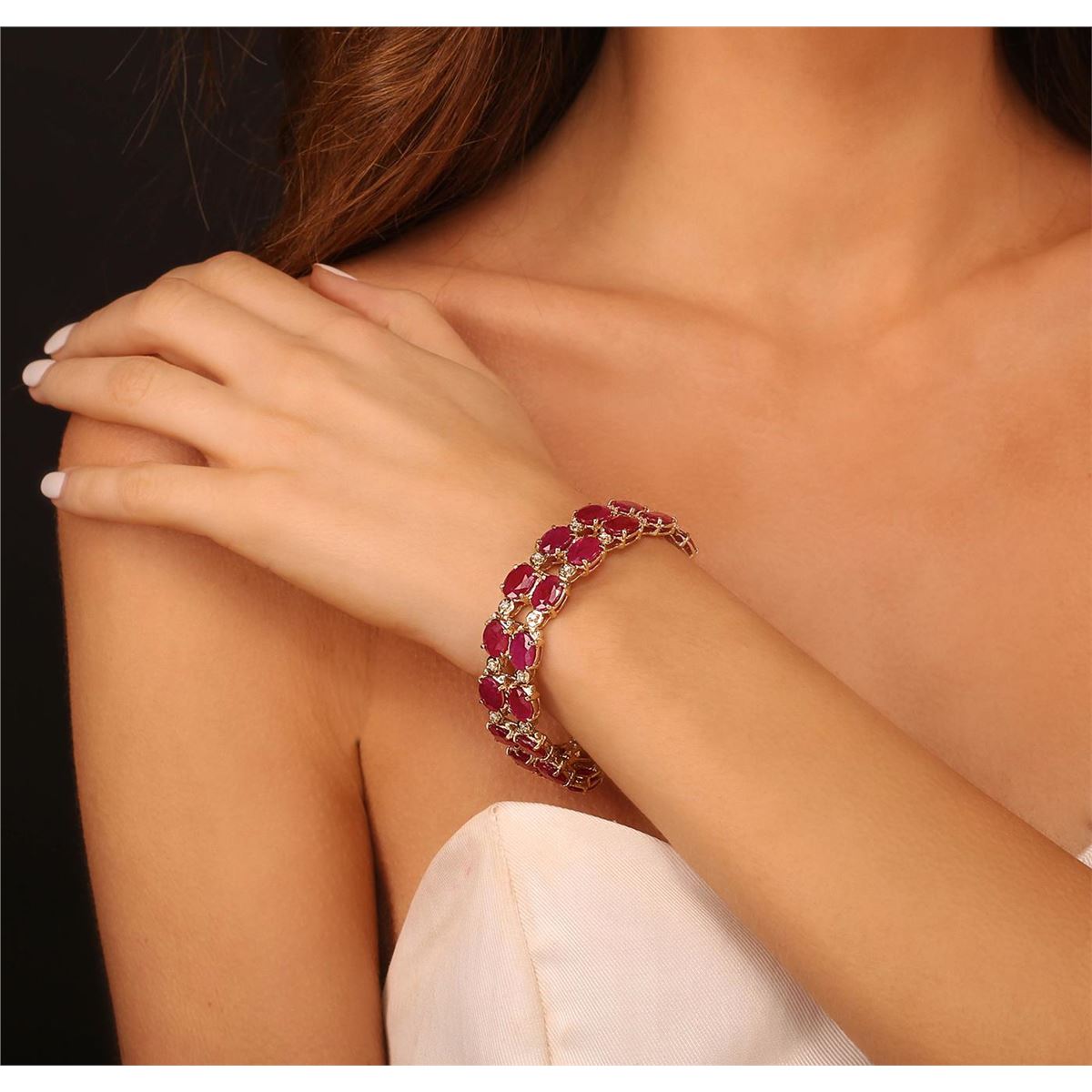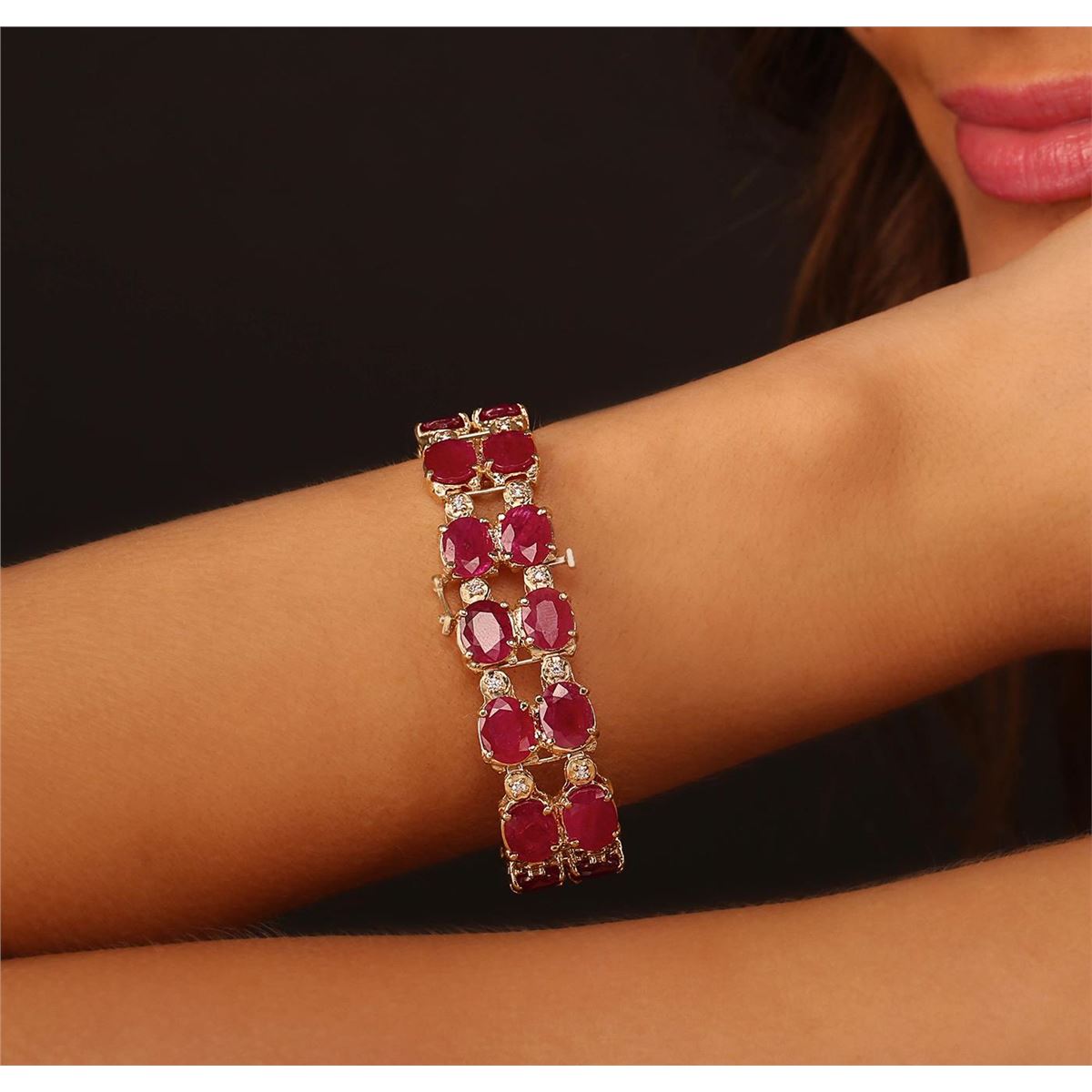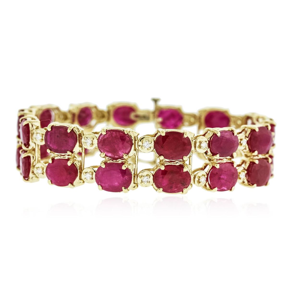 One electronically tested 14KT yellow gold Ladies combination cast & assembled bracelet with a hidden box clasp with a bright polish finish. Measurements: 7.25" in length. Identified with markings of "14K". Condition is new. Containing: Twenty-eight prong set oval modified brilliant cut natural rubies, measuring 9.00 x 6.50 x 3.11mm, approximate total weight of 41.72ct., clarity is heavily included, type II, medium dark, moderately strong, strongly purplish red color, (GIA stpR 6/4), cut is good. Indications of heat treatment with glass and flux residue. Colored gemstones are presumed to have been subjected to commonly used and possible undetectable color/clarity enhancement processes. Twenty-Eight prong set round brilliant cut diamonds, measuring 2.10 - 2.10 x 1.26mm (depth est.) approximate total weight of 28 Stones = 0.95ct. Clarity of SI-1, Color of I - J, Cut is Good. Total Weight of Colored Stones 41.72ct. Total Weight of Diamonds 0.95ct. Total Weight of Bracelet 38.10gm. GGL Appraised at $27,165.00.