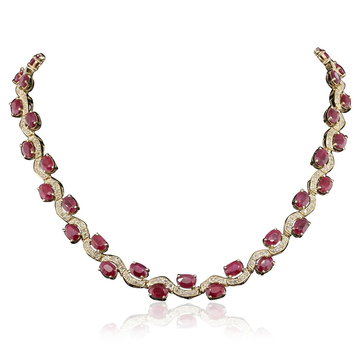 One electronically tested 14KT yellow gold Ladies combination cast & assembled necklace with a hidden box clasp with a bright polish finish. Condition is new. Measurements: 17" in length. Identified with markings of "14K". Containing: Forty-three prong set oval modified brilliant cut natural rubies, measuring 7.10 x 5.10 x 3.47mm, approximate. Total Weight of 44.29ct., clarity is heavily included, type II, medium dark, moderately strong, strongly purplish red color, (GIA stpR 6/4), cut is good. Colored gemstones are presumed to have been subjected to commonly used color/clarity enhancement processes. Two Hundred Fifteen prong set round brilliant cut diamonds, measuring 1.50 - 1.50 x 0.90mm (depth est.) approximate. Total Weight of 215 Stones = 2.65ct. Clarity: SI-1 to I-1. Color: J - K, Cut is Good. Total Weight of Colored Stones 44.29ct. Total Weight of Diamonds 2.65ct. Total Weight of Necklace 47.90 grams. GGL Appraised at $35,830.00.