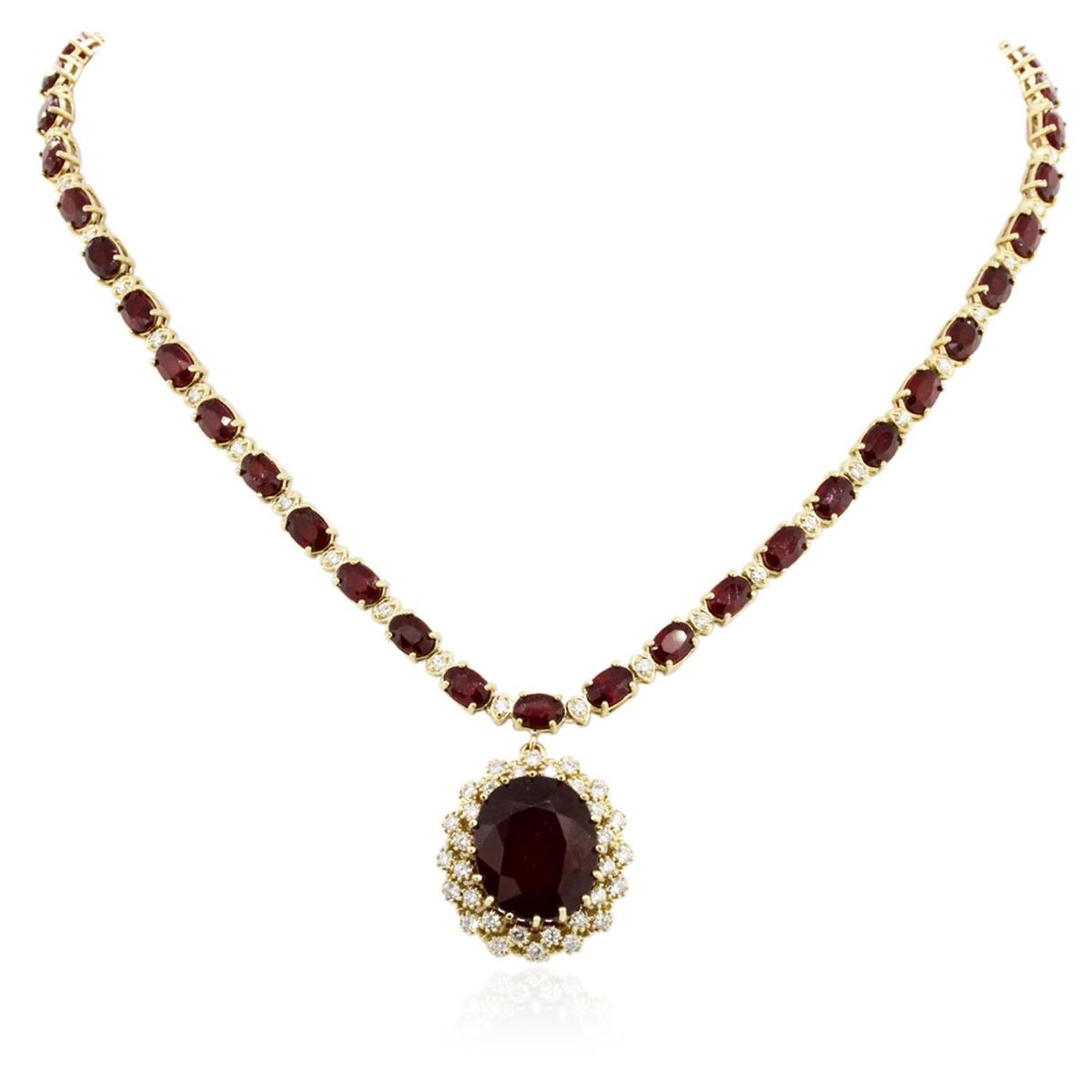 One electronically tested 14KT yellow gold ladies cast & assembled ruby and diamond necklace with a bright polish finish. Seventeen inch length necklace features a ruby and diamond pendant supported by a flexible ruby and diamond ribbon, terminating in a concealed clasp with safety. Identified with markings of "14K". Condition is new, good workmanship. Containing: One prong set oval mixed cut natural ruby, measuring 17.70 x 14.80 x 8.10mm, 8%. bulge factor, approximate weight of 18.48ct., clarity is heavily included, type II, dark, very slightly brownish, slightly purplish red color, (GIA slpR 7/3), cut is good. Transmitting light somewhat diffusely, transparent to translucent. Naturally occurring internal & external characteristics are present. Indications of laboratory high temperature heat treatment, with glass & flux additives. Graded in the setting. Ruby has a low tolerance to rhodium plating, repolishing the surface, & ultrasonic cleaning. Forty-six prong set oval mixed cut natural rubies, measuring 6.00. x 4.00. x 2.70mm, 6%. bulge factor, approximate total weight of 26.22ct., clarity is heavily included, type II, dark, very slightly brownish, slightly purplish red color, (GIA slpR 7/3), cut is good. Transmitting light somewhat diffusely, transparent to translucent. Naturally occurring internal & external characteristics are present. Indications of laboratory high temperature heat treatment, with glass & flux additives. Measurements & the color grade are an average for the group. Graded in the setting. Ruby has a low tolerance to rhodium plating, repolishing the surface, & ultrasonic cleaning. Seventy-Eight prong set round brilliant cut diamonds, measuring 2.20 - 2.00. x 1.26mm (depth est.) approximate total weight of 78 Stones = 2.74ct. Graded in the setting. Clarity: SI-1 to I-1 . Color: G - I. Total Weight of Colored Stones 44.70ct. Total Weight of Diamonds 2.74ct. Total Weight of Necklace 35.81 grams. AIG Appraised at $19,940.00.
