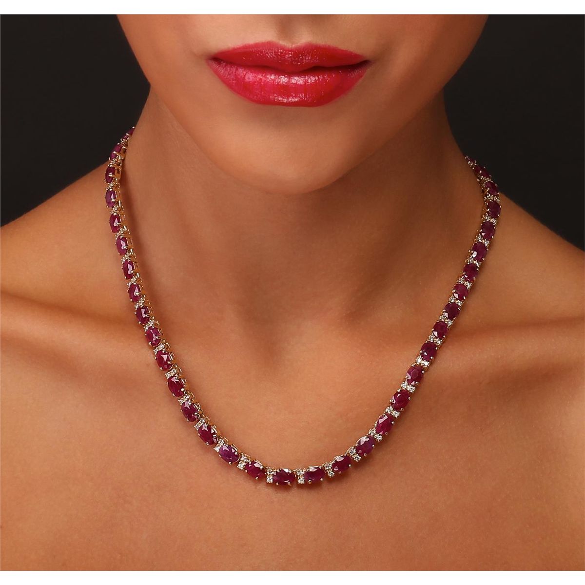 One electronically tested 14KT yellow gold Ladies combination cast & assembled necklace with a hidden box clasp with a bright polish finish. Condition is new. Measurements: 17" in length. Identified with markings of "14K". Containing: Forty-seven prong set oval modified brilliant cut natural rubies, measuring 7.00 x 5.00 x 3.40mm, approximate. Total Weight of 46.06ct., clarity is heavily included, type II, medium dark, moderately strong, strongly purplish red color, (GIA stpR 6/4), cut is good. Colored gemstones are presumed to have been subjected to commonly used color/clarity enhancement processes. Ninety-Four prong set round brilliant cut diamonds, measuring 1.50 - 1.50 x 0.90mm (depth est.) approximate. Total Weight of 94 Stones = 1.16ct. Clarity: SI-2 to I-1. Color: J - K, Cut is Good. Total Weight of Colored Stones 46.06ct. Total Weight of Diamonds 1.16ct. Total Weight of Necklace 35.30 grams. GGL Appraised at $28,835.00.