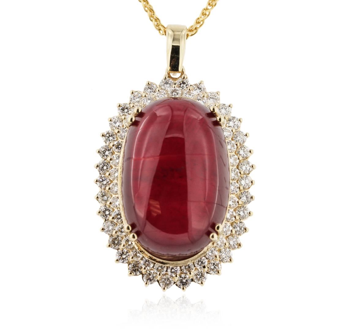 One electronically tested 14KT yellow gold ladies cast ruby and diamond pendant & chain 18.0" long, with a lobster claw clasp with a bright polish finish. Identified with markings of "14K". Condition is new. Containing: One prong set oval cabochon cut natural ruby, measuring 24.88 x 16.85 x 10.95mm, approximate weight of 49.58ct., clarity is heavily included, type II, medium dark, very slightly brownish, red color, (GIA R 6/3), cut is good. Sixty-Eight prong set round brilliant cut diamonds, measuring 2.10 - 1.80 x 1.17mm (depth est.) approximate total weight of 68 Stones = 1.84ct. Clarity: SI-1 to SI-2. Color: J - K, Cut is Good. Colored gemstones are presumed to have been subjected to commonly used enhancement processes. All diamonds and colored gemstones are graded in the mounting, unless otherwise stated. Total Weight of Colored Stones 49.58ct. Total Weight of Diamonds 1.84ct. Total Weight of Pendant & Chain 24.00 grams. GGL Appraised at $13,590.00.