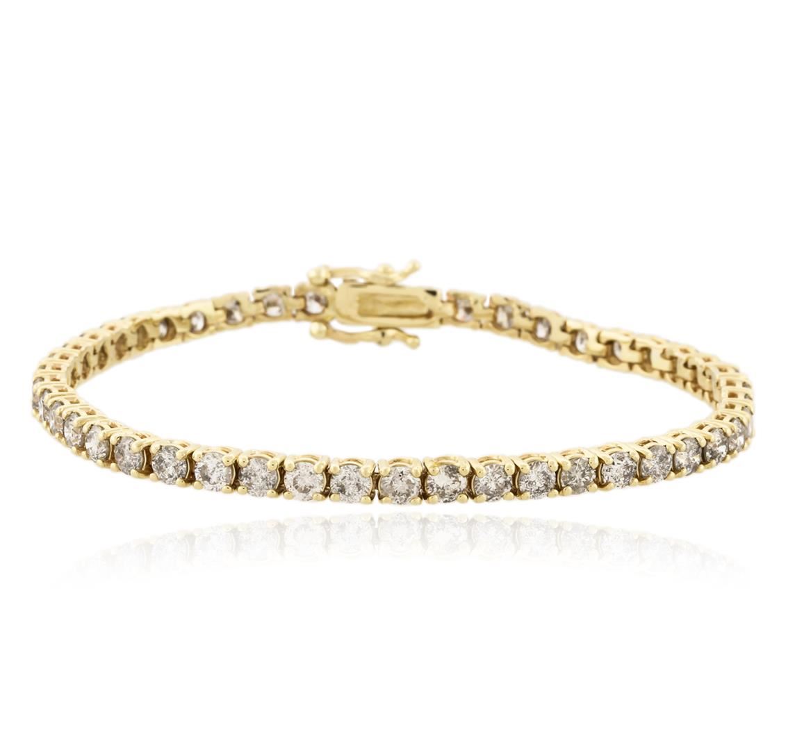 One electronically tested 14KT yellow gold ladies cast diamond tennis bracelet with a hidden box clasp with safety closer with a bright polish finish. Measurements: 7" in length Identified with markings of "14K". Condition is new. Containing: Forty-Six prong set round brilliant cut diamonds, measuring 3.10 - 3.10 x 1.86mm (depth est.) approximate total weight of 46 Stones = 5.01ct. Clarity: I-2 to I-3. Color: I - J, Cut is Good. All diamonds are graded in the mounting, unless otherwise stated. Total Weight of Diamonds 5.01ct. Total Weight of Tennis Bracelet 10.90 grams. GGL Appraised at $8,365.00.