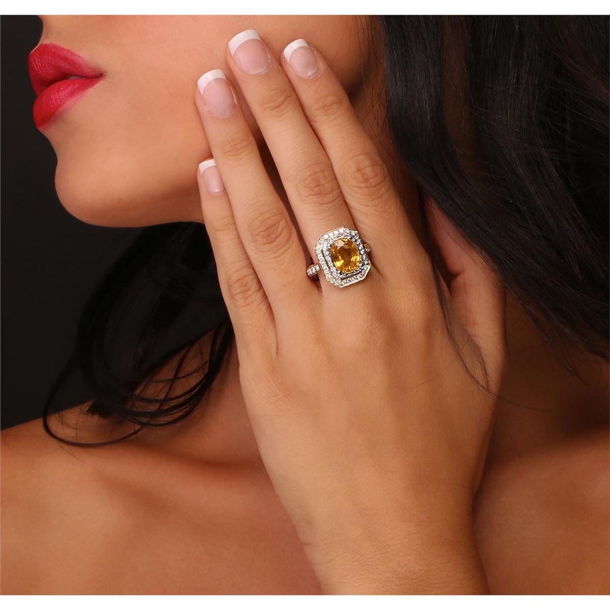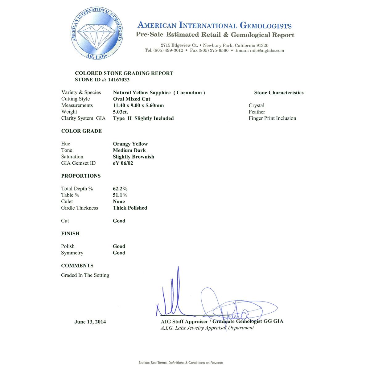One electronically tested 14KT yellow gold ladies cast yellow sapphire and diamond ring. Condition is new, good workmanship. The featured yellow sapphire is set within two tiered diamond bezels supported by diamond set shoulders, completed by a two millimeter wide band. Bright polish finish with rhodium accents. Identified with markings of "14K". Containing: One prong set oval mixed cut natural yellow sapphire, measuring 11.40 x 9.00 x 5.60mm, 8%. bulge factor, approximate weight of 5.03ct., clarity is slightly included, type II, medium dark, slightly brownish, orangy yellow color, (GIA oY 6/2), cut is good. Transmitting light with a minimum of distortion, transparent. Naturally occurring internal & external characteristics are present. Colored Stone Grading Report attached. Graded in the setting.One Hundred Eighteen prong set round brilliant cut diamonds, measuring 1.90 - 1.50 x 1.02mm (depth est.) approximate. Total Weight of 118 Stones = 2.31ct. Graded in the setting. Clarity: VS-1 to SI-1. Color: G - I. Total Weight of Colored Stones 5.03ct. Total Weight of Diamonds 2.31ct. Total Weight of Ring 10.56 grams. AIG Appraised at $20,640.00.