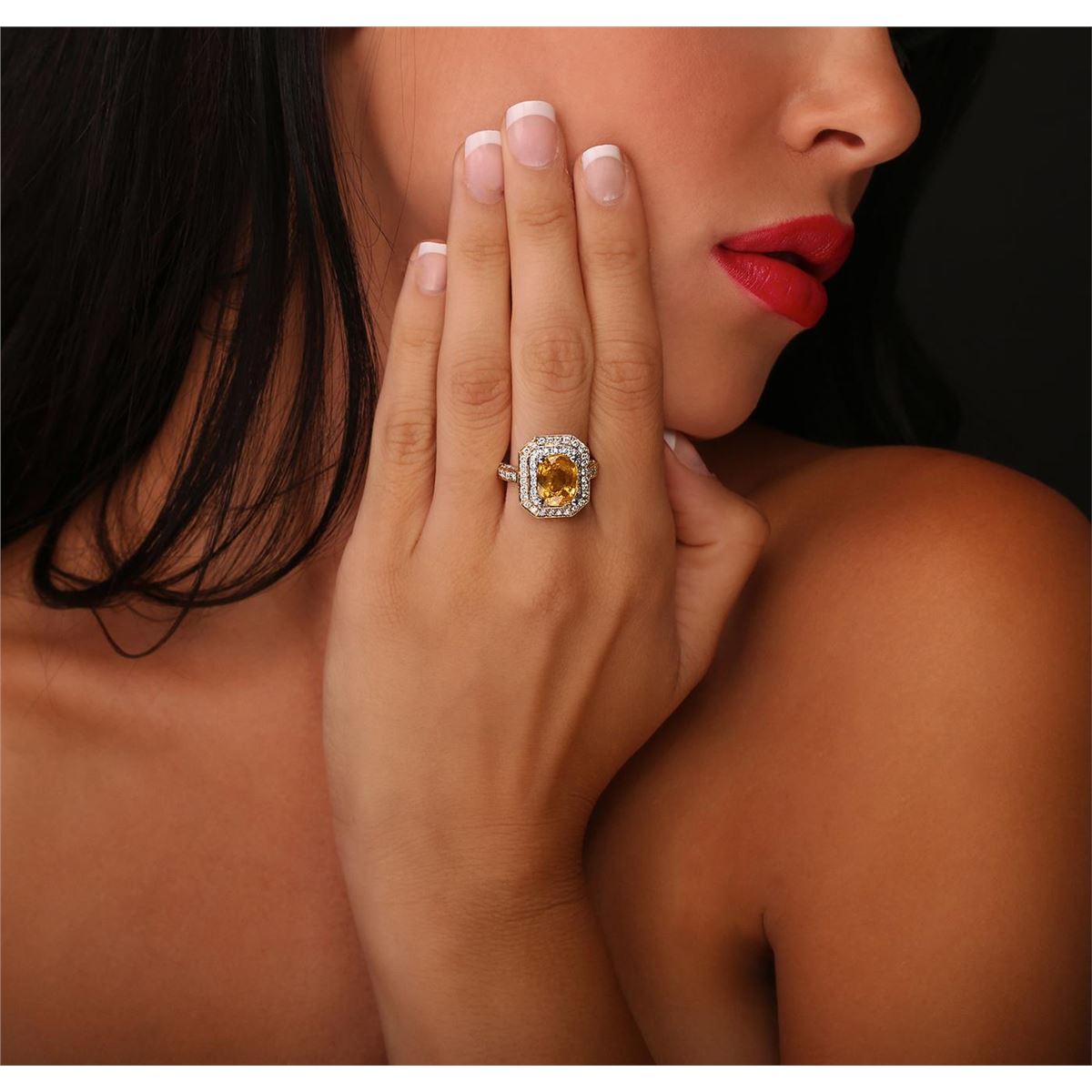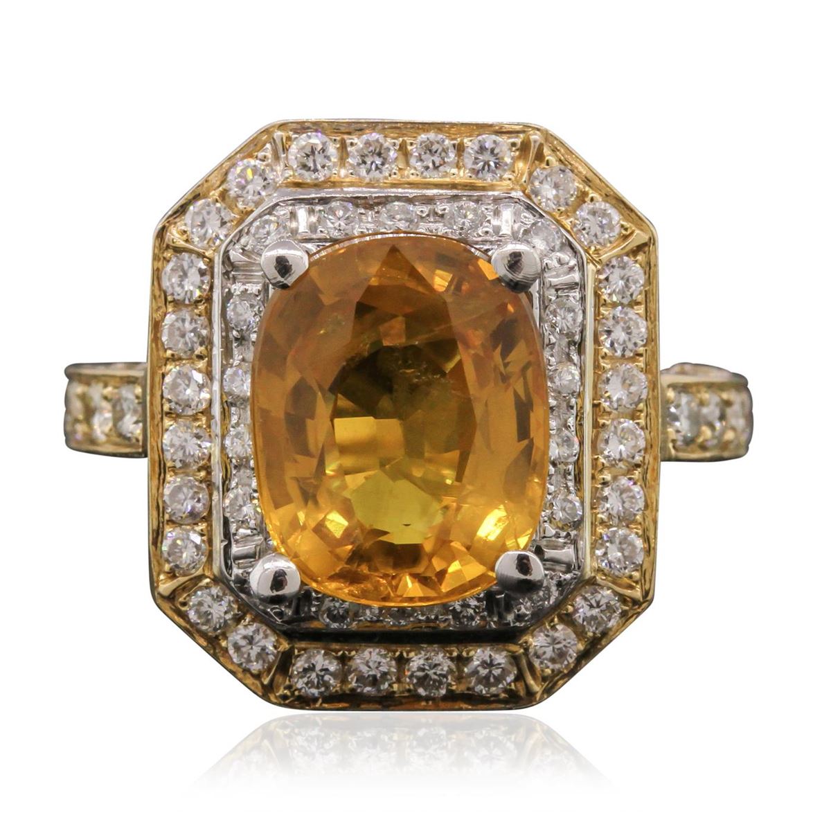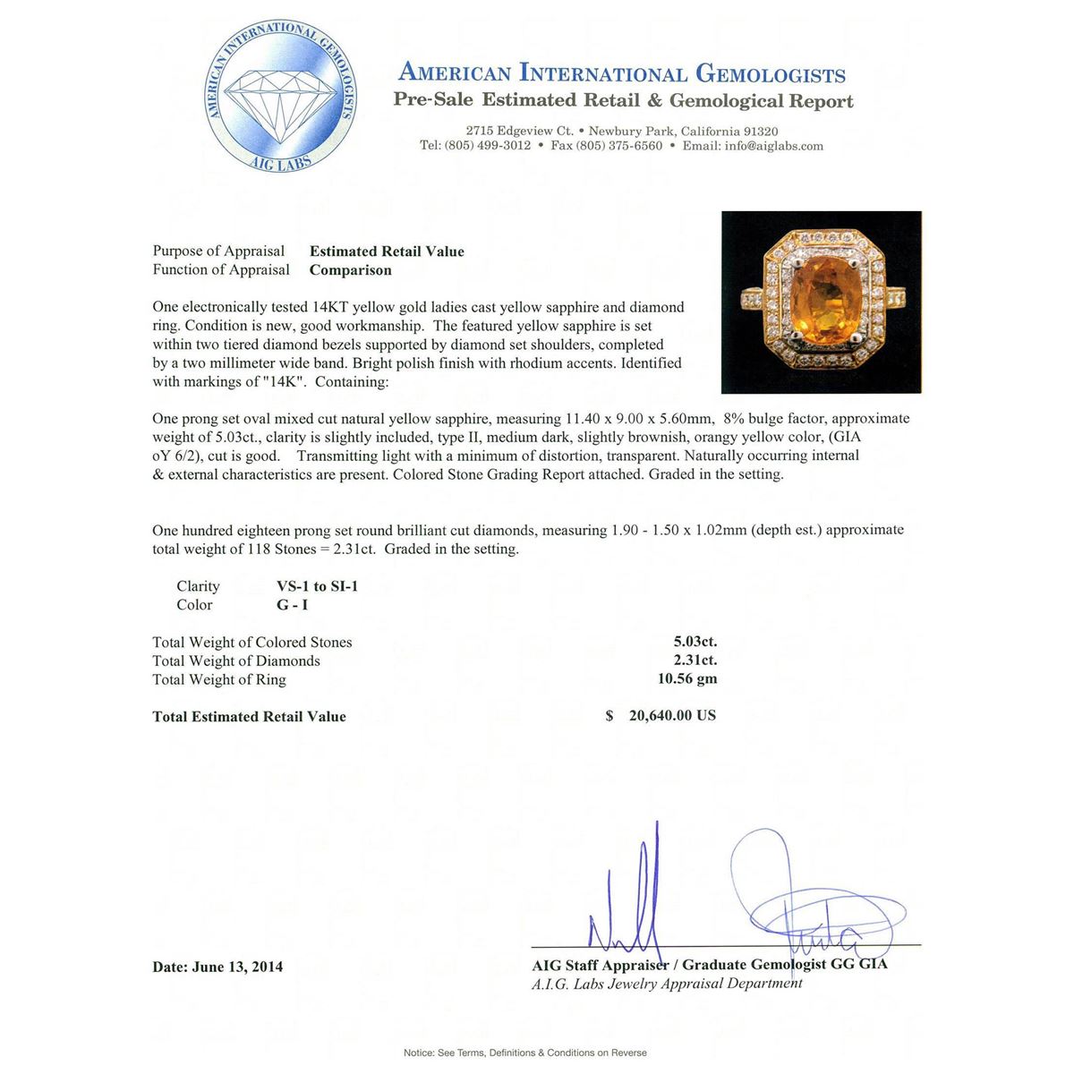 One electronically tested 14KT yellow gold ladies cast yellow sapphire and diamond ring. Condition is new, good workmanship. The featured yellow sapphire is set within two tiered diamond bezels supported by diamond set shoulders, completed by a two millimeter wide band. Bright polish finish with rhodium accents. Identified with markings of "14K". Containing: One prong set oval mixed cut natural yellow sapphire, measuring 11.40 x 9.00 x 5.60mm, 8%. bulge factor, approximate weight of 5.03ct., clarity is slightly included, type II, medium dark, slightly brownish, orangy yellow color, (GIA oY 6/2), cut is good. Transmitting light with a minimum of distortion, transparent. Naturally occurring internal & external characteristics are present. Colored Stone Grading Report attached. Graded in the setting.One Hundred Eighteen prong set round brilliant cut diamonds, measuring 1.90 - 1.50 x 1.02mm (depth est.) approximate. Total Weight of 118 Stones = 2.31ct. Graded in the setting. Clarity: VS-1 to SI-1. Color: G - I. Total Weight of Colored Stones 5.03ct. Total Weight of Diamonds 2.31ct. Total Weight of Ring 10.56 grams. AIG Appraised at $20,640.00.