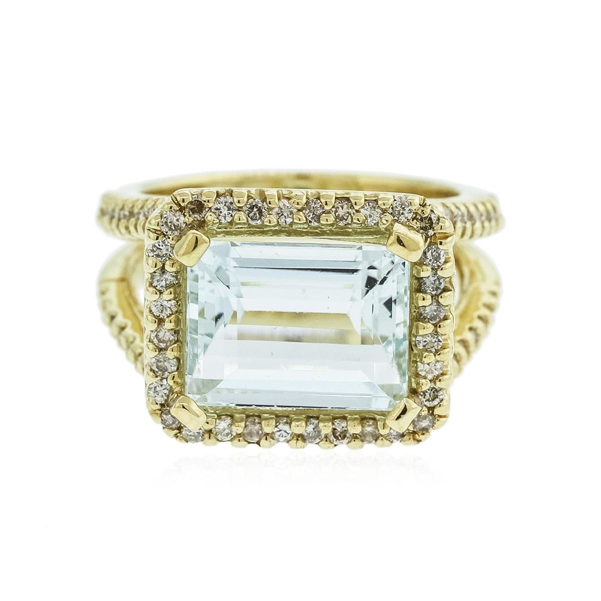 One electronically tested 14KT yellow gold ladies cast aquamarine and diamond ring with a bright polish finish. Condition is new, good workmanship. The featured aquamarine is set within a diamond bezel, supported by diamond set split shoulders and completed by a four millimeter wide band. Identified with markings of "14K". Containing: One prong set rectangular step cut natural aquamarine, measuring 11.20 x 8.55 x 6.00mm, 8%. bulge factor, approximate weight of 5.06ct., clarity is eye clean, type I, medium light, very slightly grayish, blue color, (GIA B 4/3), cut is good. Transmitting light with no distortion, transparent. Refractive index testing results of 1.56 to 1.57. This is a conclusive result for Aquamarine (Beryl). Colored Stone Grading Report attached. Graded in the setting. Seventy-Eight prong set round brilliant cut diamonds, measuring 1.40 - 1.30 x 0.81mm (depth est.) approximate. Total Weight of 78 Stones = 0.80ct. Graded in the setting. Clarity: SI-1 to I-1. Color: I - K. Total Weight of Colored Stones 5.06ct. Total Weight of Diamonds 0.80ct. Total Weight of Ring 9.40 grams. AIG Appraised at $5,525.00.