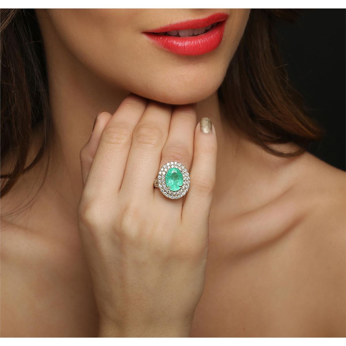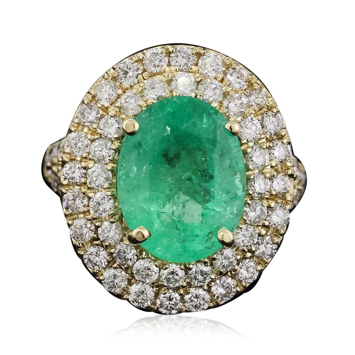 One electronically tested 14KT yellow gold ladies cast emerald and diamond ring with a bright polish finish. The featured emerald is set within tiered diamond bezels supported by diamond set split shoulders, completed by a two millimeter wide band. Identified with markings of "14K". Condition is new, good workmanship. Containing: One prong set oval mixed cut natural emerald, measuring 12.40 x 9.60 x 7.31mm, 6% bulge factor, approximate weight of 5.10ct., clarity is heavily included, type III, medium, very slightly grayish, very slightly bluish green color, (GIA vslbG 5/3), cut is good. Transmitting light with a minimum of distortion, transparent. Naturally occurring internal & external characteristics are present. Colored Stone Grading Report attached. Indications of oil residue. Graded in the setting. Sixty-Eight prong set round brilliant cut diamonds, measuring 2.00 - 1.90 x 1.17mm (depth est.) approximate total weight of 68 Stones = 1.94ct. Graded in the setting. Clarity: SI-1 to I-1. Color: G - I. Total Weight of Colored Stones 5.10ct. Total Weight of Diamonds 1.94ct. Total Weight of Ring 7.64 grams. AIG Appraised at $17,075.00.