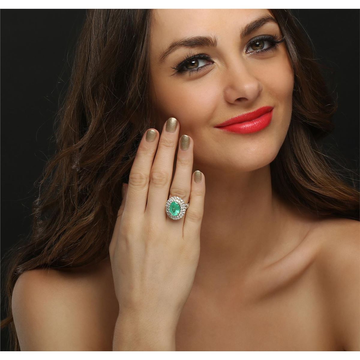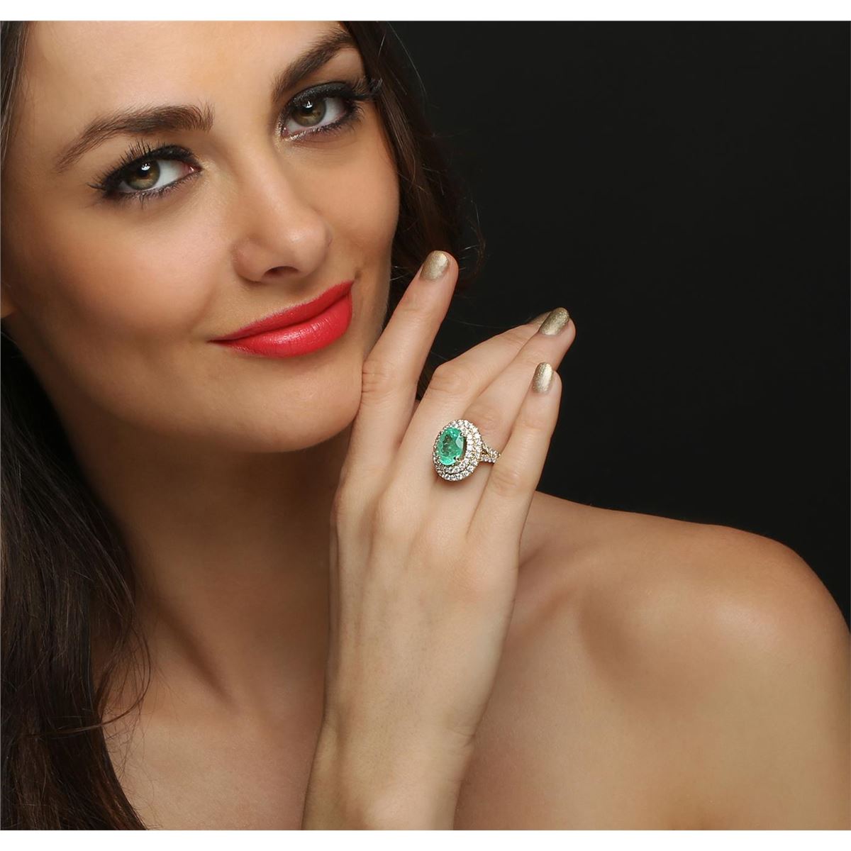 One electronically tested 14KT yellow gold ladies cast emerald and diamond ring with a bright polish finish. The featured emerald is set within tiered diamond bezels supported by diamond set split shoulders, completed by a two millimeter wide band. Identified with markings of "14K". Condition is new, good workmanship. Containing: One prong set oval mixed cut natural emerald, measuring 12.40 x 9.60 x 7.31mm, 6% bulge factor, approximate weight of 5.10ct., clarity is heavily included, type III, medium, very slightly grayish, very slightly bluish green color, (GIA vslbG 5/3), cut is good. Transmitting light with a minimum of distortion, transparent. Naturally occurring internal & external characteristics are present. Colored Stone Grading Report attached. Indications of oil residue. Graded in the setting. Sixty-Eight prong set round brilliant cut diamonds, measuring 2.00 - 1.90 x 1.17mm (depth est.) approximate total weight of 68 Stones = 1.94ct. Graded in the setting. Clarity: SI-1 to I-1. Color: G - I. Total Weight of Colored Stones 5.10ct. Total Weight of Diamonds 1.94ct. Total Weight of Ring 7.64 grams. AIG Appraised at $17,075.00.