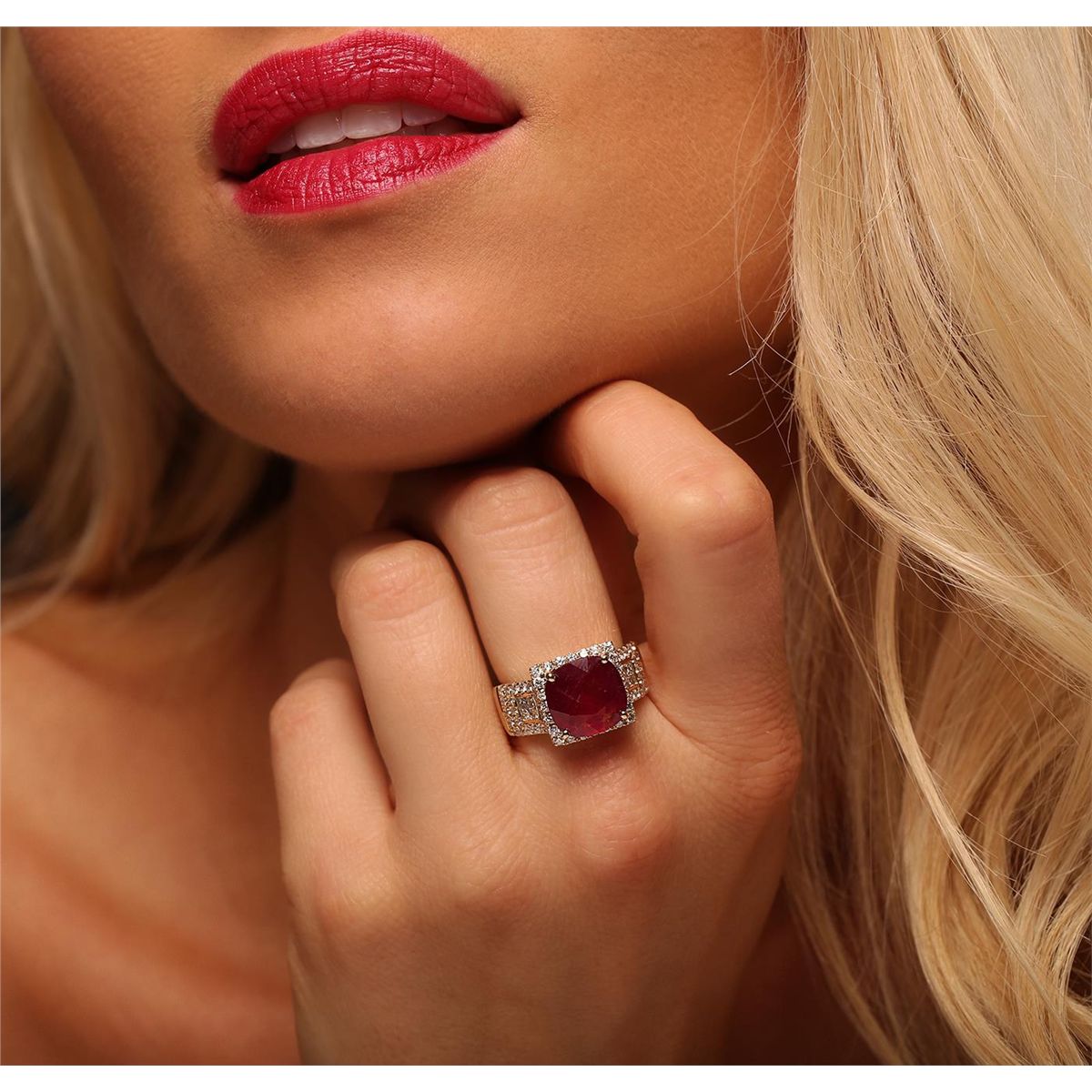 One electronically tested 14KT yellow gold Ladies combination cast & assembled ring with a bright polish finish. Condition is new. Identified with markings of "14K". Containing: One prong set square cushion modified mixed cut natural ruby, measuring 12.00 x 12.00 x 4.30mm, approximate weight of 5.16ct., clarity is heavily included, type II, medium dark, moderately strong, strongly purplish red color, (GIA stpR 6/4), cut is good. Colored gemstones are presumed to have been subjected to commonly used color/clarity enhancement processes. Sixty-Six prong set round brilliant cut diamonds, measuring 1.40 - 1.40 x 0.84mm (depth est.) approximate. Total Weight of 66 Stones = 0.80ct. Clarity: SI-1 to I-1. Color: I - J, Cut is Good. Eight invisible set princess cut diamonds, measuring 1.80 x 1.80 x 1.35mm (depth est.) approximate. Total Weight of 8 Stones = 0.29ct. Clarity: VS-2 to SI-1. Color: I - J, Cut is Good. Total Weight of Colored Stones 5.16ct. Total Weight of Diamonds 1.09ct. Total Weight of Ring 7.80 grams. GGL Appraised at $6,770.00.