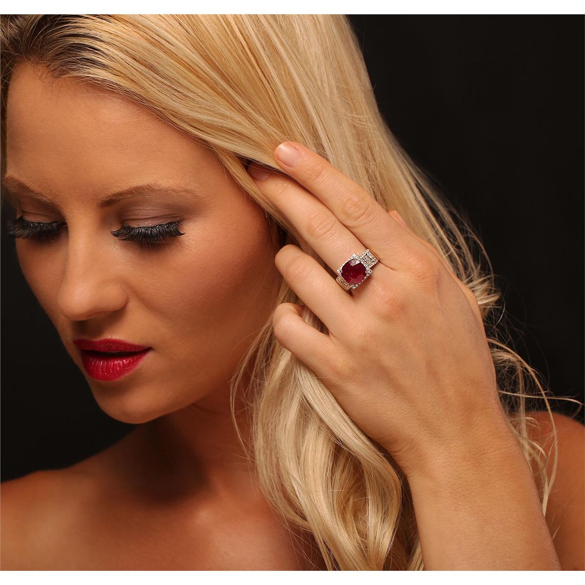 One electronically tested 14KT yellow gold Ladies combination cast & assembled ring with a bright polish finish. Condition is new. Identified with markings of "14K". Containing: One prong set square cushion modified mixed cut natural ruby, measuring 12.00 x 12.00 x 4.30mm, approximate weight of 5.16ct., clarity is heavily included, type II, medium dark, moderately strong, strongly purplish red color, (GIA stpR 6/4), cut is good. Colored gemstones are presumed to have been subjected to commonly used color/clarity enhancement processes. Sixty-Six prong set round brilliant cut diamonds, measuring 1.40 - 1.40 x 0.84mm (depth est.) approximate. Total Weight of 66 Stones = 0.80ct. Clarity: SI-1 to I-1. Color: I - J, Cut is Good. Eight invisible set princess cut diamonds, measuring 1.80 x 1.80 x 1.35mm (depth est.) approximate. Total Weight of 8 Stones = 0.29ct. Clarity: VS-2 to SI-1. Color: I - J, Cut is Good. Total Weight of Colored Stones 5.16ct. Total Weight of Diamonds 1.09ct. Total Weight of Ring 7.80 grams. GGL Appraised at $6,770.00.