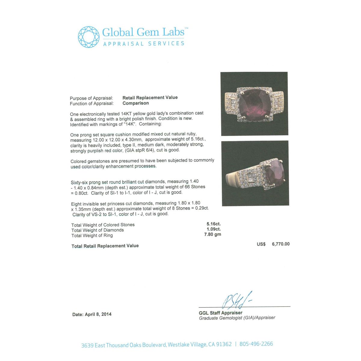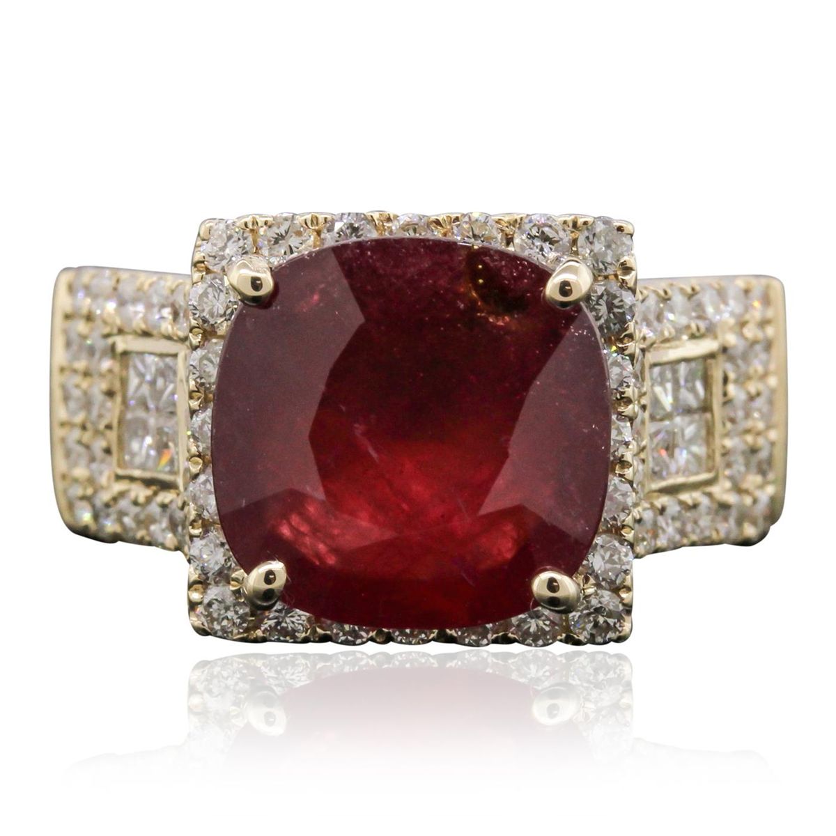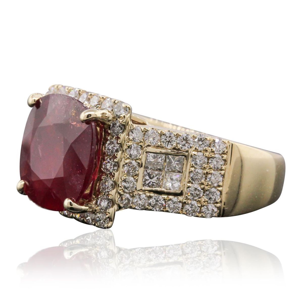 One electronically tested 14KT yellow gold Ladies combination cast & assembled ring with a bright polish finish. Condition is new. Identified with markings of "14K". Containing: One prong set square cushion modified mixed cut natural ruby, measuring 12.00 x 12.00 x 4.30mm, approximate weight of 5.16ct., clarity is heavily included, type II, medium dark, moderately strong, strongly purplish red color, (GIA stpR 6/4), cut is good. Colored gemstones are presumed to have been subjected to commonly used color/clarity enhancement processes. Sixty-Six prong set round brilliant cut diamonds, measuring 1.40 - 1.40 x 0.84mm (depth est.) approximate. Total Weight of 66 Stones = 0.80ct. Clarity: SI-1 to I-1. Color: I - J, Cut is Good. Eight invisible set princess cut diamonds, measuring 1.80 x 1.80 x 1.35mm (depth est.) approximate. Total Weight of 8 Stones = 0.29ct. Clarity: VS-2 to SI-1. Color: I - J, Cut is Good. Total Weight of Colored Stones 5.16ct. Total Weight of Diamonds 1.09ct. Total Weight of Ring 7.80 grams. GGL Appraised at $6,770.00.