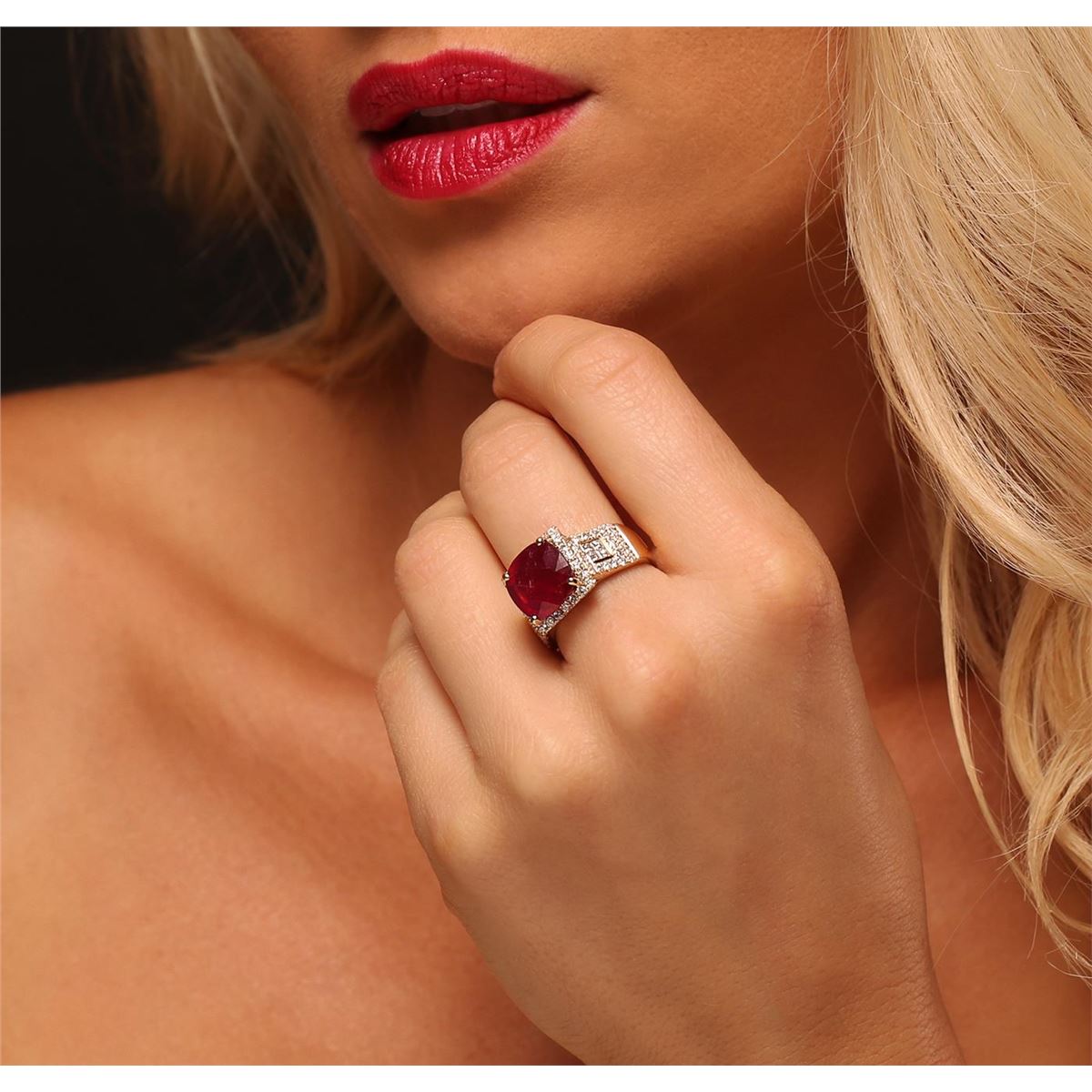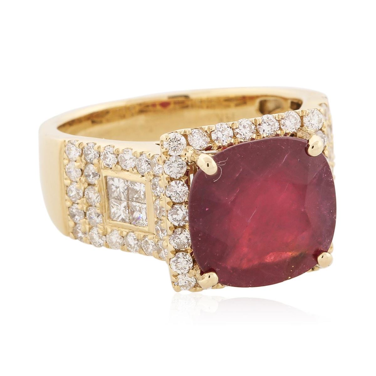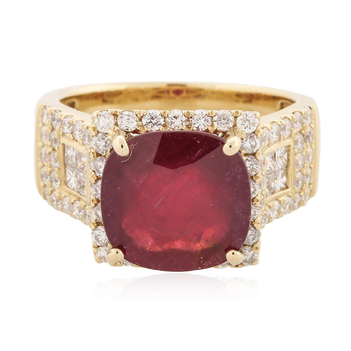 One electronically tested 14KT yellow gold Ladies combination cast & assembled ring with a bright polish finish. Condition is new. Identified with markings of "14K". Containing: One prong set square cushion modified mixed cut natural ruby, measuring 12.00 x 12.00 x 4.30mm, approximate weight of 5.16ct., clarity is heavily included, type II, medium dark, moderately strong, strongly purplish red color, (GIA stpR 6/4), cut is good. Colored gemstones are presumed to have been subjected to commonly used color/clarity enhancement processes. Sixty-Six prong set round brilliant cut diamonds, measuring 1.40 - 1.40 x 0.84mm (depth est.) approximate. Total Weight of 66 Stones = 0.80ct. Clarity: SI-1 to I-1. Color: I - J, Cut is Good. Eight invisible set princess cut diamonds, measuring 1.80 x 1.80 x 1.35mm (depth est.) approximate. Total Weight of 8 Stones = 0.29ct. Clarity: VS-2 to SI-1. Color: I - J, Cut is Good. Total Weight of Colored Stones 5.16ct. Total Weight of Diamonds 1.09ct. Total Weight of Ring 7.80 grams. GGL Appraised at $6,770.00.