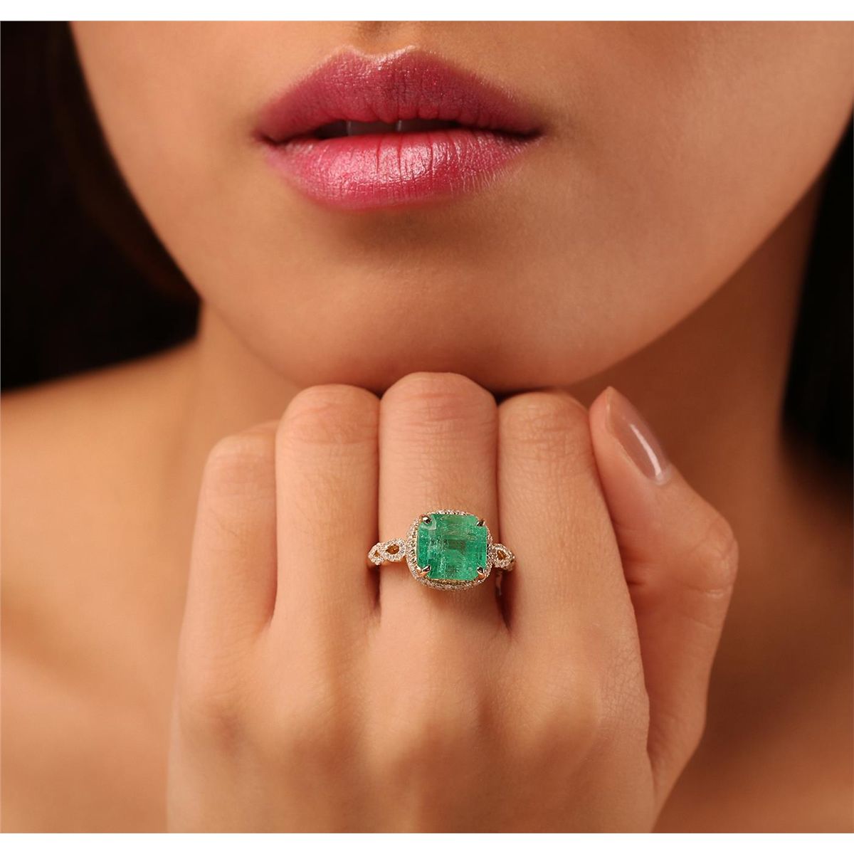 One electronically tested 14KT yellow gold Ladies combination cast & assembled ring with a bright polish finish. Condition is new. Identified with markings of "14K". Containing: One prong set emerald standard step cut natural emerald, measuring 10.00 x 9.00 x 5.85mm, approximate weight of 5.17ct., clarity is moderately included, type III, medium light, very slightly grayish, very slightly bluish green color, (GIA vslbG 4/3), cut is good. Colored gemstones are presumed to have been subjected to commonly used color/clarity enhancement processes. Sixty prong set round brilliant cut diamonds, measuring 1.00 - 1.00 x 0.60mm (depth est.) approximate. Total Weight of 60 Stones = 0.41ct. Clarity: I-1 to I-3. Color: I - J, Cut is Good. Total Weight of Colored Stones 5.17ct. Total Weight of Diamonds 0.41ct. Total Weight of Ring 5.00 grams. GGL Appraised at $12,590.00.