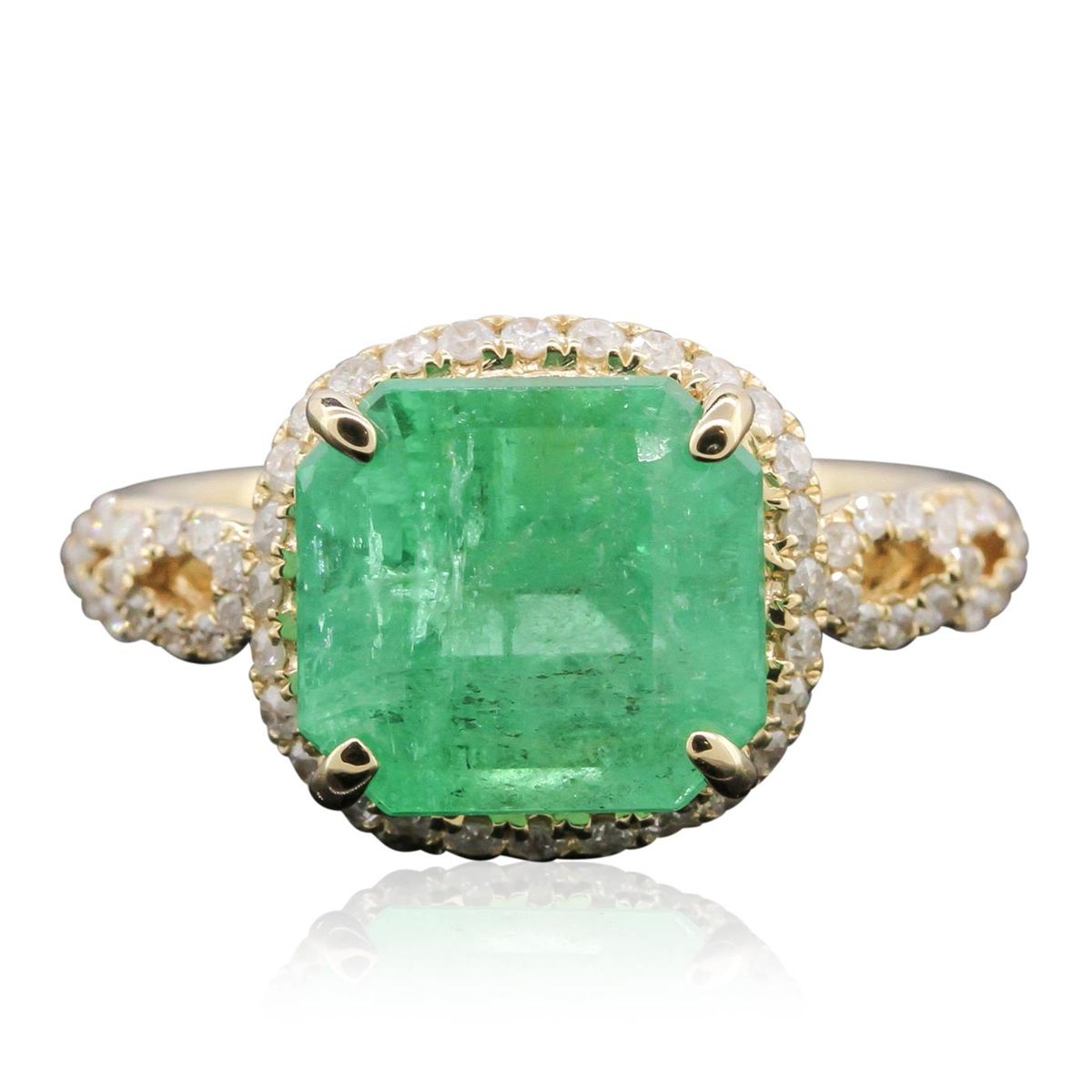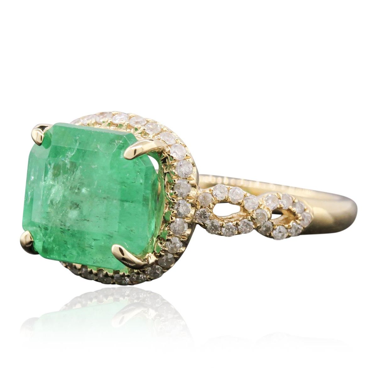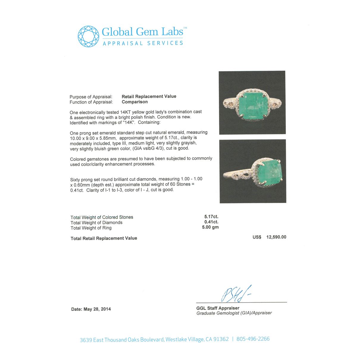 One electronically tested 14KT yellow gold Ladies combination cast & assembled ring with a bright polish finish. Condition is new. Identified with markings of "14K". Containing: One prong set emerald standard step cut natural emerald, measuring 10.00 x 9.00 x 5.85mm, approximate weight of 5.17ct., clarity is moderately included, type III, medium light, very slightly grayish, very slightly bluish green color, (GIA vslbG 4/3), cut is good. Colored gemstones are presumed to have been subjected to commonly used color/clarity enhancement processes. Sixty prong set round brilliant cut diamonds, measuring 1.00 - 1.00 x 0.60mm (depth est.) approximate. Total Weight of 60 Stones = 0.41ct. Clarity: I-1 to I-3. Color: I - J, Cut is Good. Total Weight of Colored Stones 5.17ct. Total Weight of Diamonds 0.41ct. Total Weight of Ring 5.00 grams. GGL Appraised at $12,590.00.