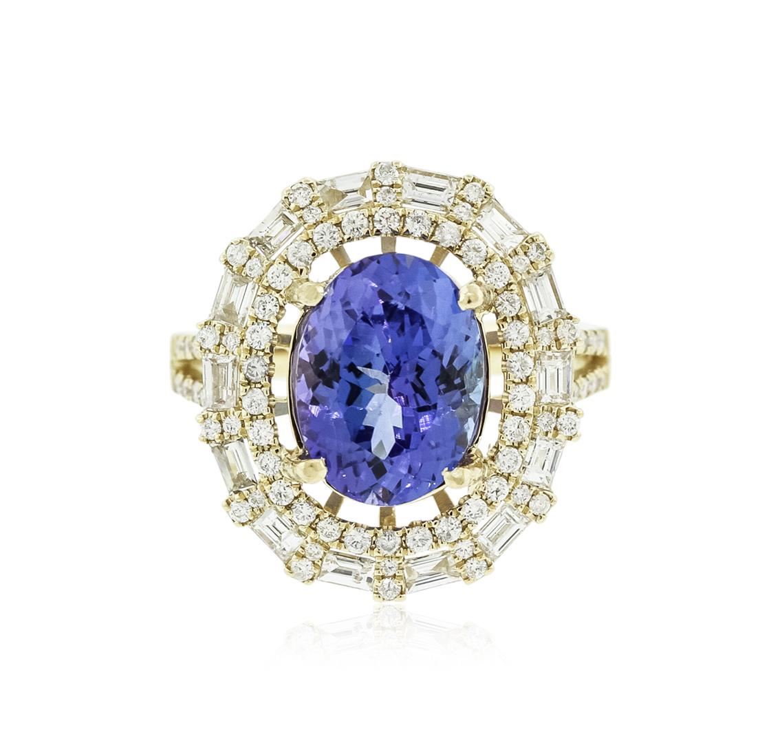 One electronically tested 14KT yellow gold ladies cast tanzanite and diamond ring with a bright polish finish. Identified with markings of "14K". Condition is new. Containing: One prong set oval modified brilliant cut natural tanzanite, measuring 11.50 x 8.50 x 7.53mm, approximate weight of 5.18ct., clarity is eye clean, type I, medium light, very slightly grayish, violet color, (GIA V 4/3), cut is good. Ninety prong set round brilliant cut diamonds, measuring 1.20 - 1.20 x 0.72mm (depth est.) approximate total weight of 90 Stones = 0.57ct. . Clarity: SI-2 to I-1. Color: I - J, Cut is Good. Fourteen prong set baguette cut diamonds, measuring 2.50 x 1.50 x 1.28mm (depth est.) approximate total weight of 14 Stones = 0.62ct. . Clarity: SI-1 to SI-2. Color: I - J, Cut is Good. Colored gemstones are presumed to have been subjected to commonly used enhancement processes. All diamonds and colored gemstones are graded in the mounting, unless otherwise stated.. Total Weight of Colored Stones 5.18ct.. Total Weight of Diamonds 1.18ct.. Total Weight of Ring 5.90 grams. GGL Appraised at $6,580.00.
