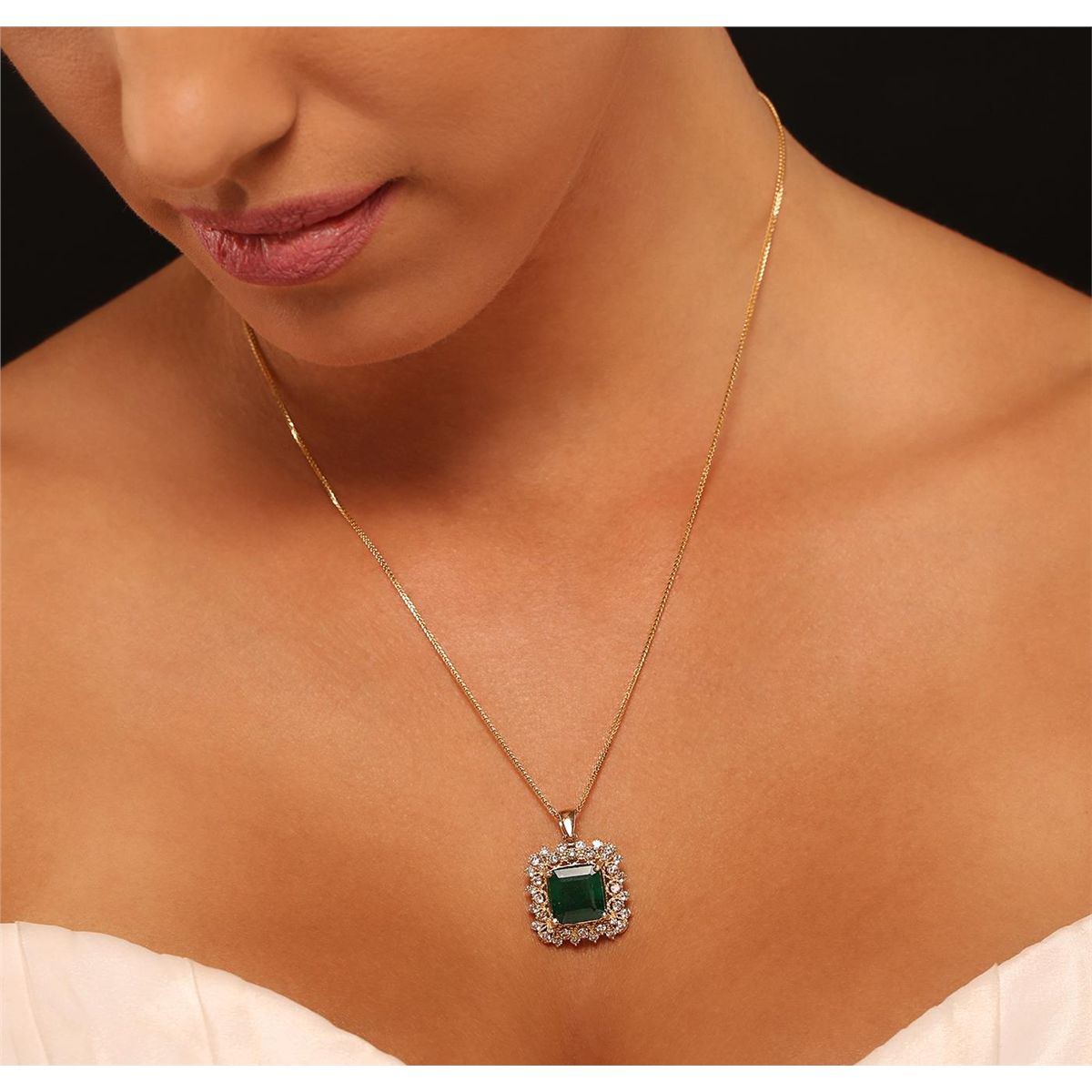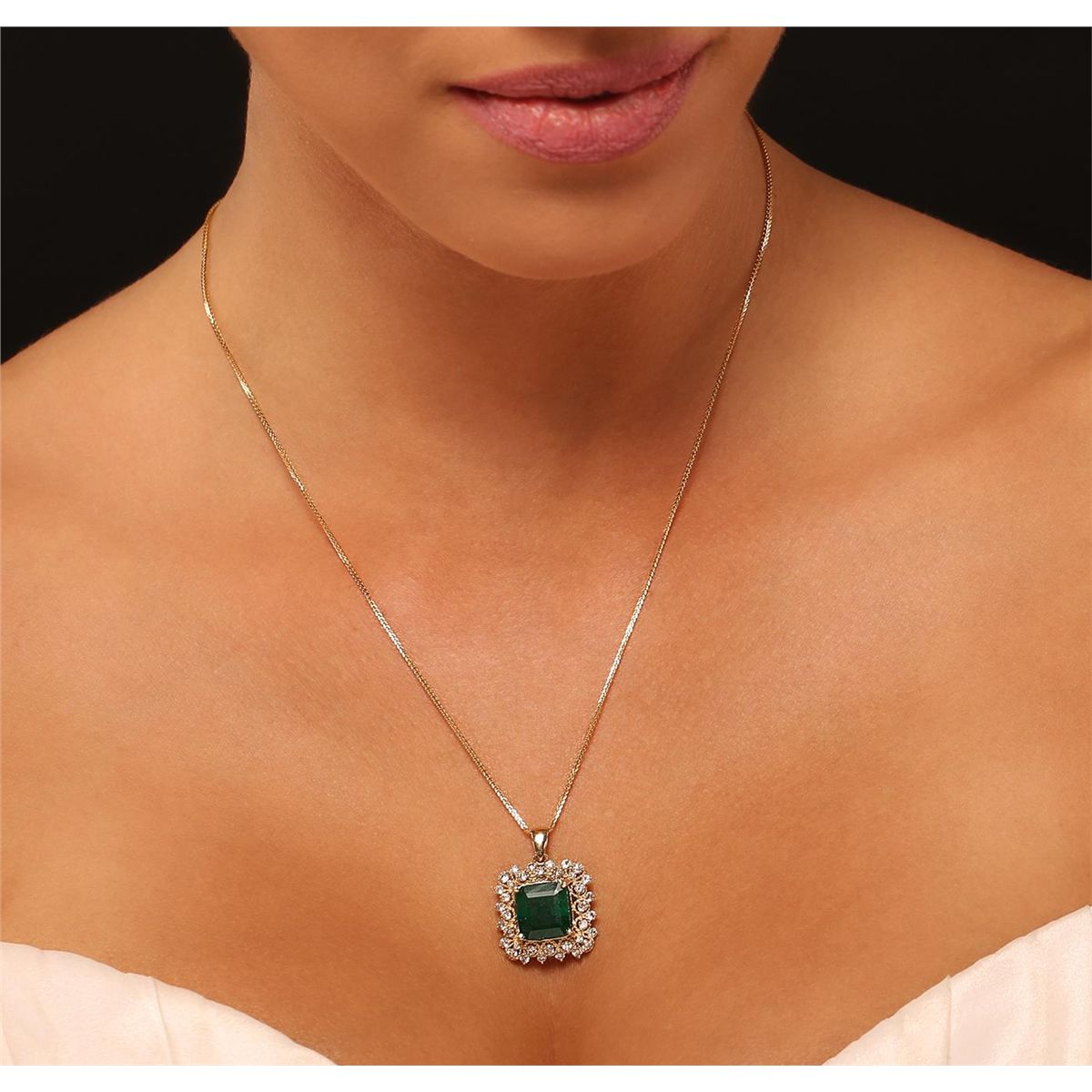 One electronically tested 14KT yellow gold Ladies pendant & chain 17.5" long, medium fancy herringbone link with a lobster claw clasp with a bright polish finish. Condition is new. Identified with markings of "14K". Containing: One prong set emerald standard step cut natural emerald, measuring 10.40 x 10.00 x 6.80mm, approximate weight of 5.19ct., clarity is heavily included, type III, medium dark, moderately strong, green color, (GIA G 6/4), cut is good. Colored gemstones are presumed to have been subjected to commonly used color/clarity enhancement processes. Thirty-Six prong set round brilliant cut diamonds, measuring 1.80 - 1.80 x 1.08mm (depth est.) approximate. Total Weight of 36 Stones = 0.77ct. Clarity: SI-2 to I-1. Color: L - M, Cut is Good. Total Weight of Colored Stones 5.19ct. Total Weight of Diamonds 0.77ct. Total Weight of Pendant & Chain 5.80 grams. GGL Appraised at $13,145.00.